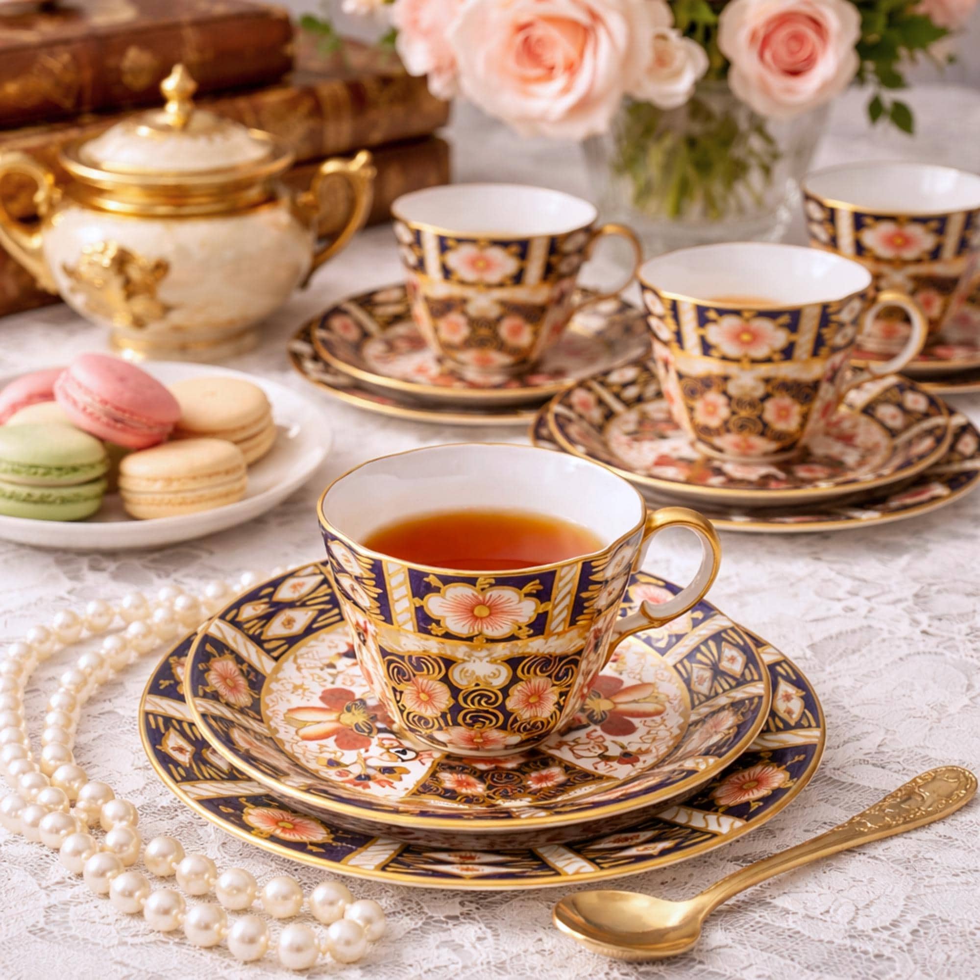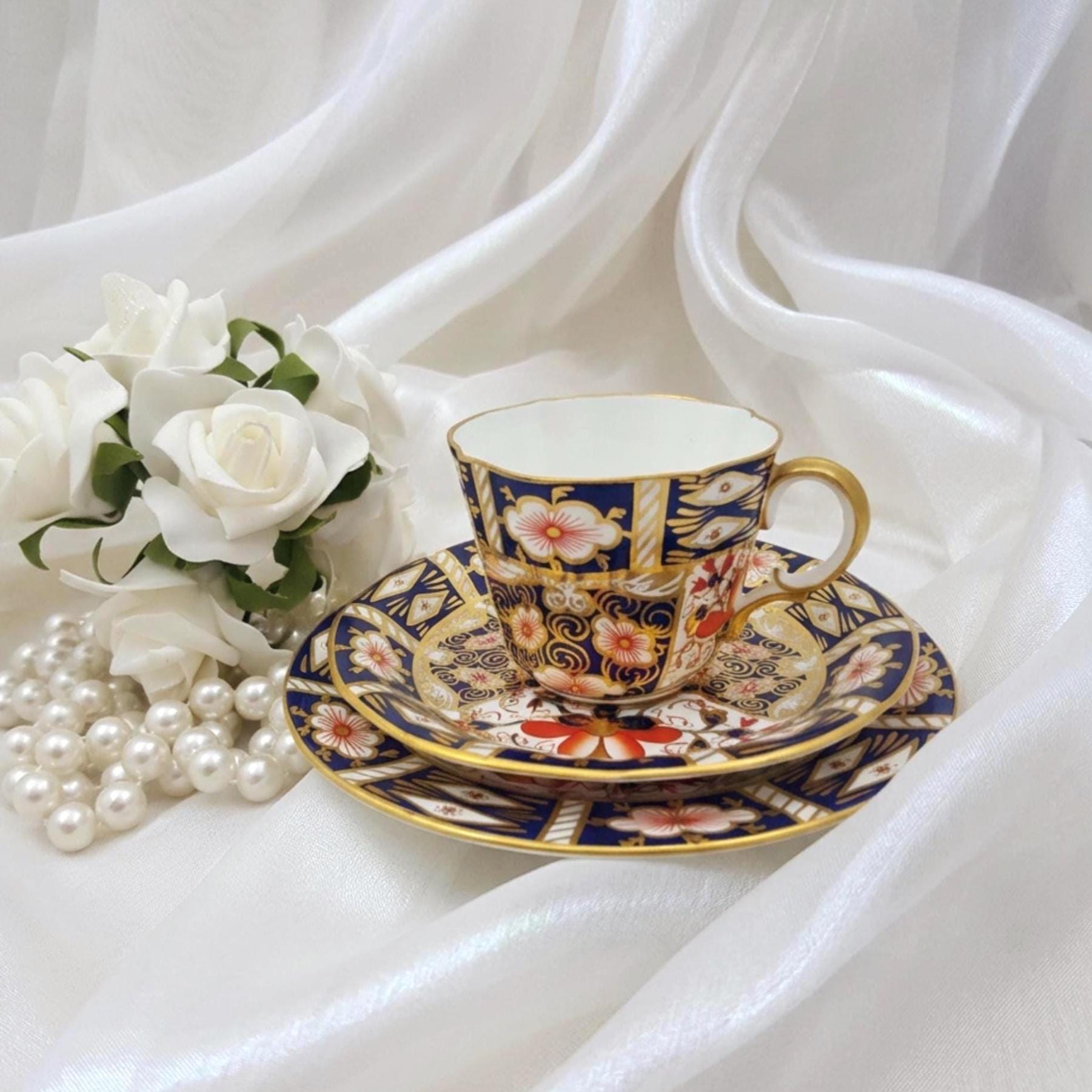 • Decoration: Hand painted Imari palette with cobalt blue, iron red, and gilded detailing