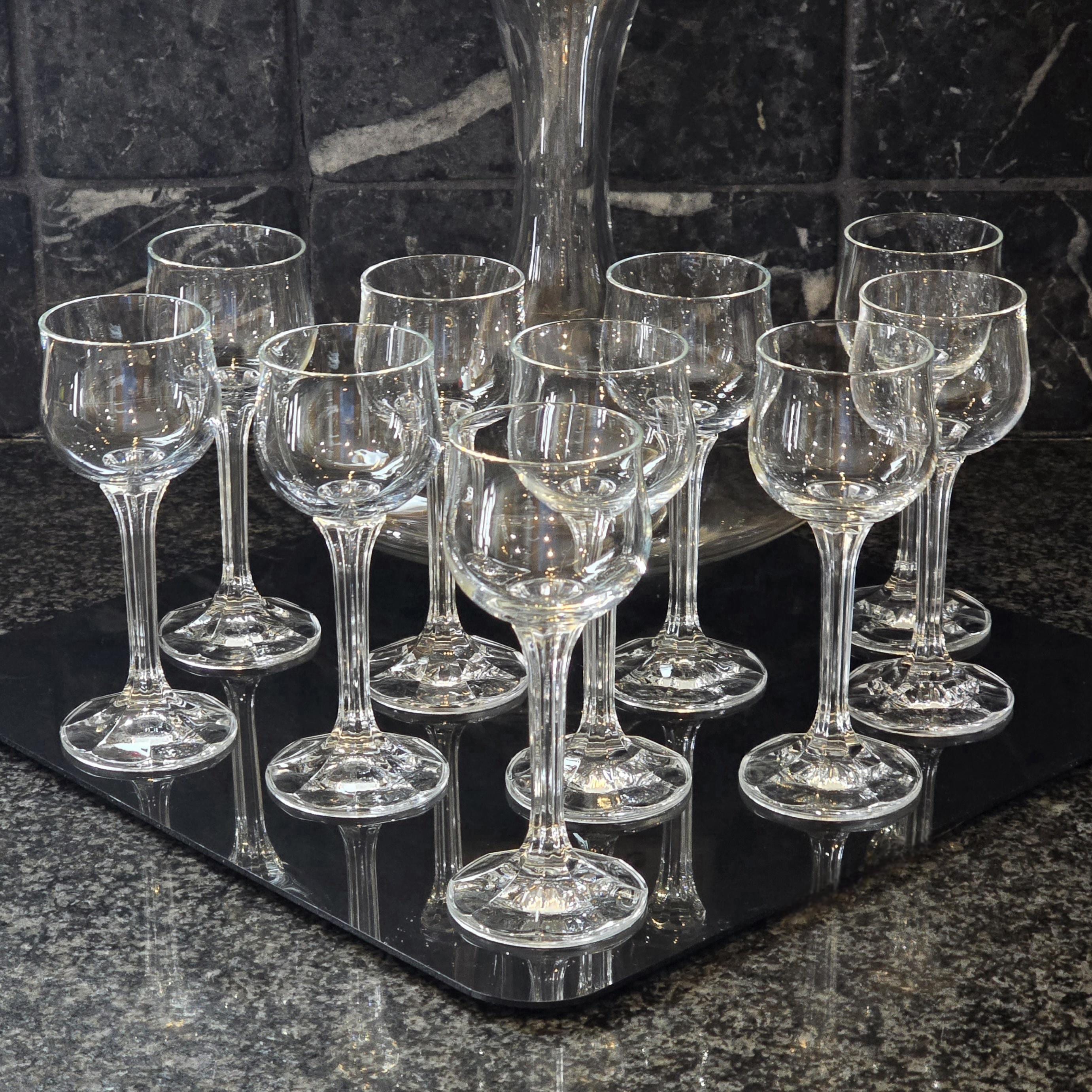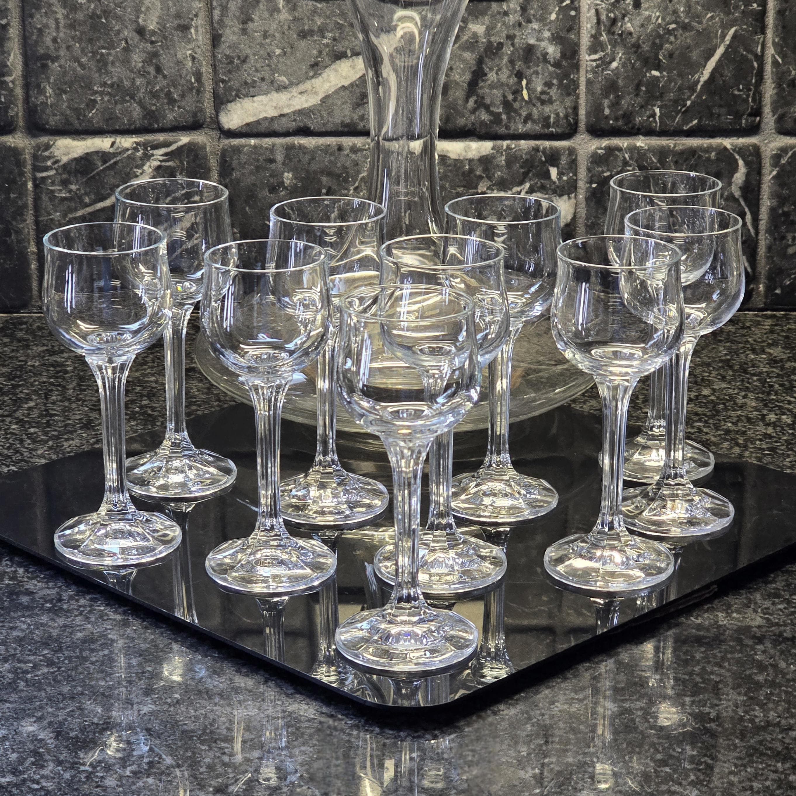 A vintage set of sparkling Crystalex Diana cordials crafted in the Bohemia region in fine Czech crystal. Each glass features a graceful tulip shaped bowl, faceted stem, and star cut base, creating a refined presentation suited to after dinner service and elegant home entertaining.