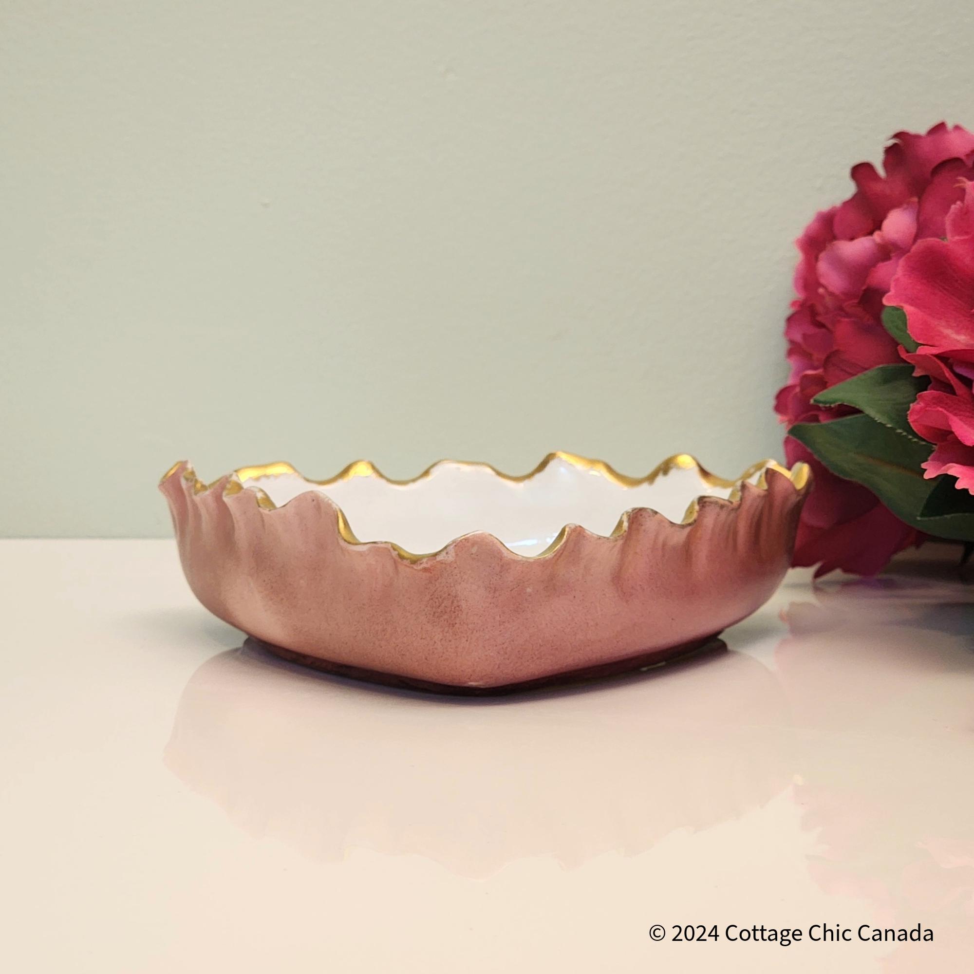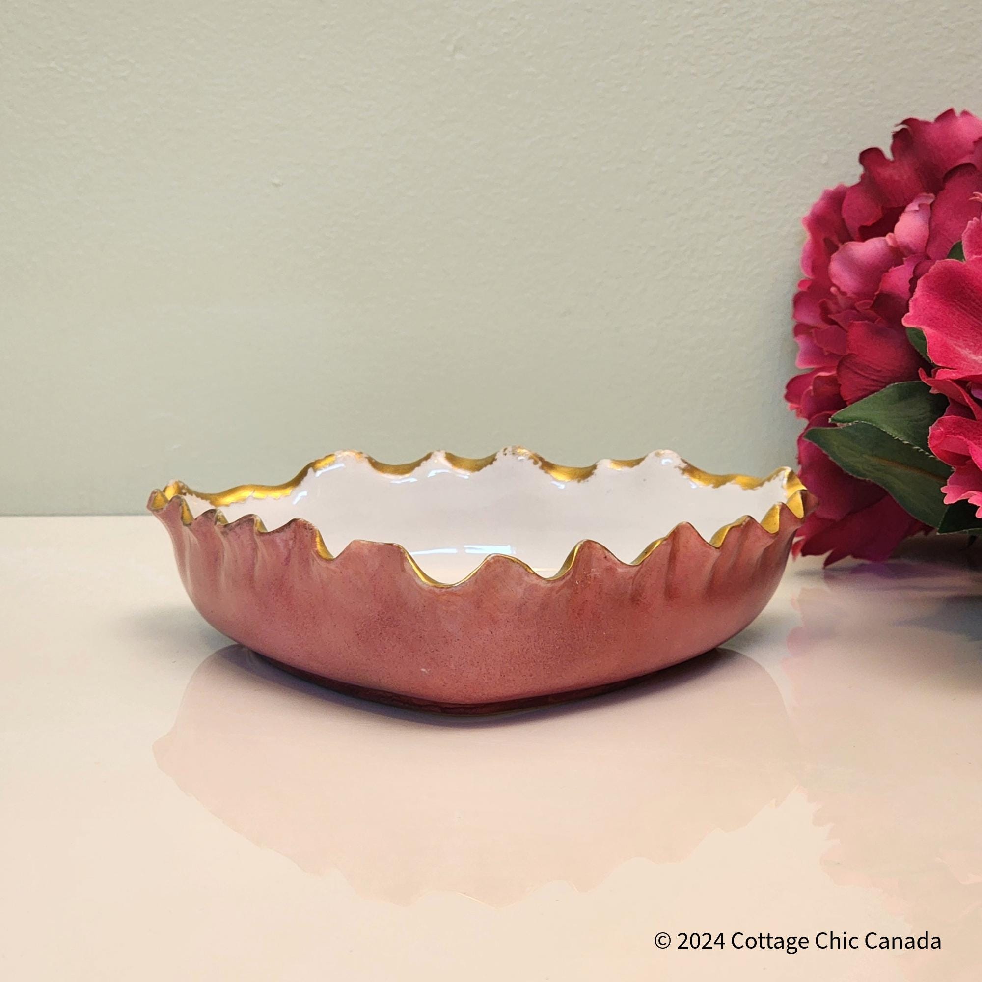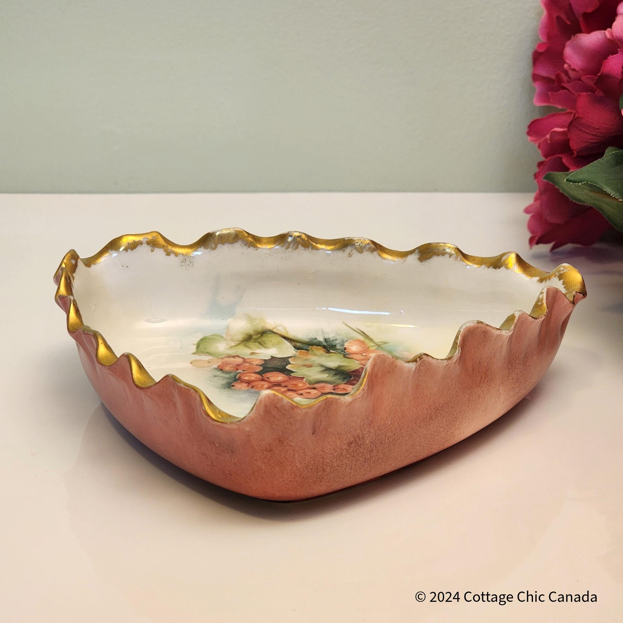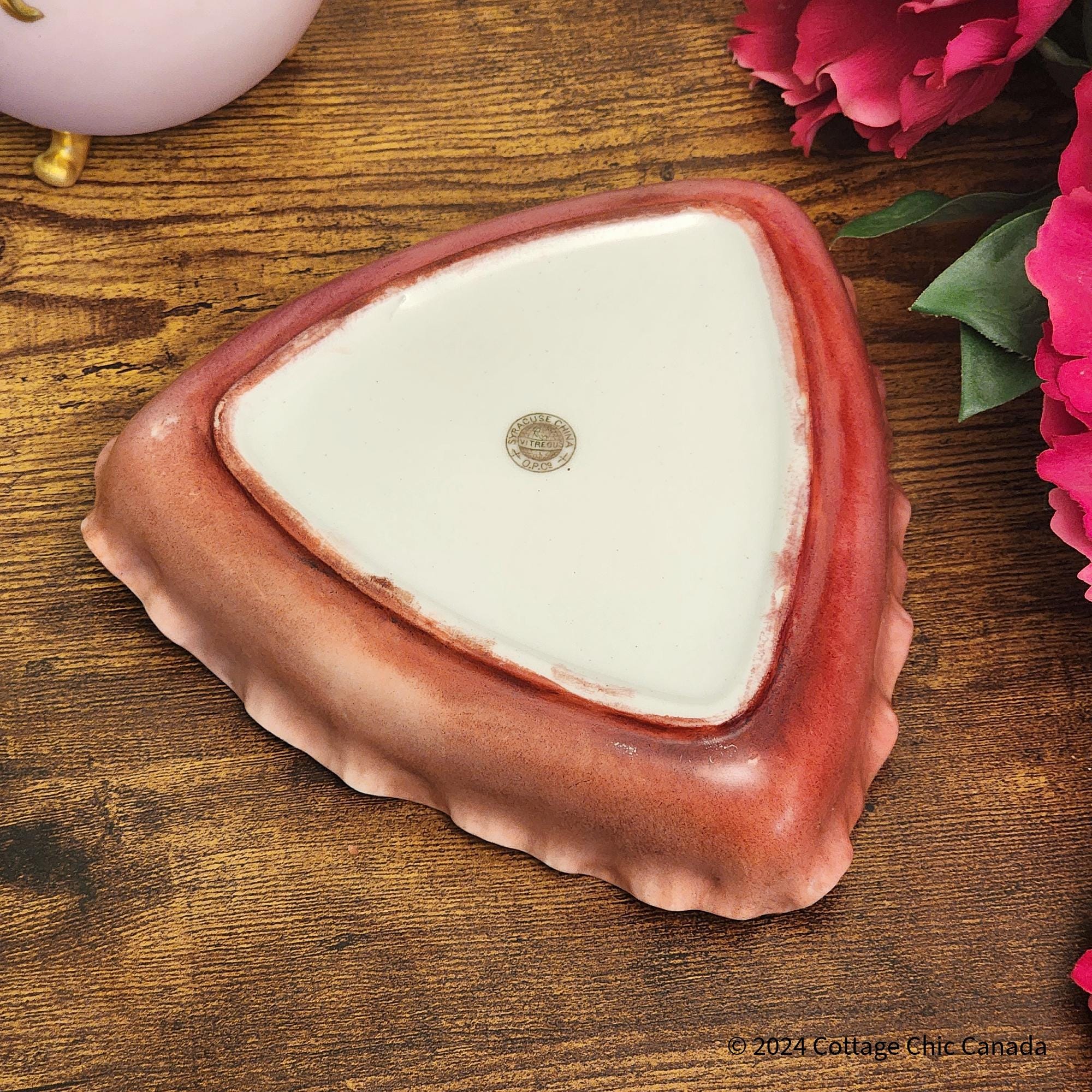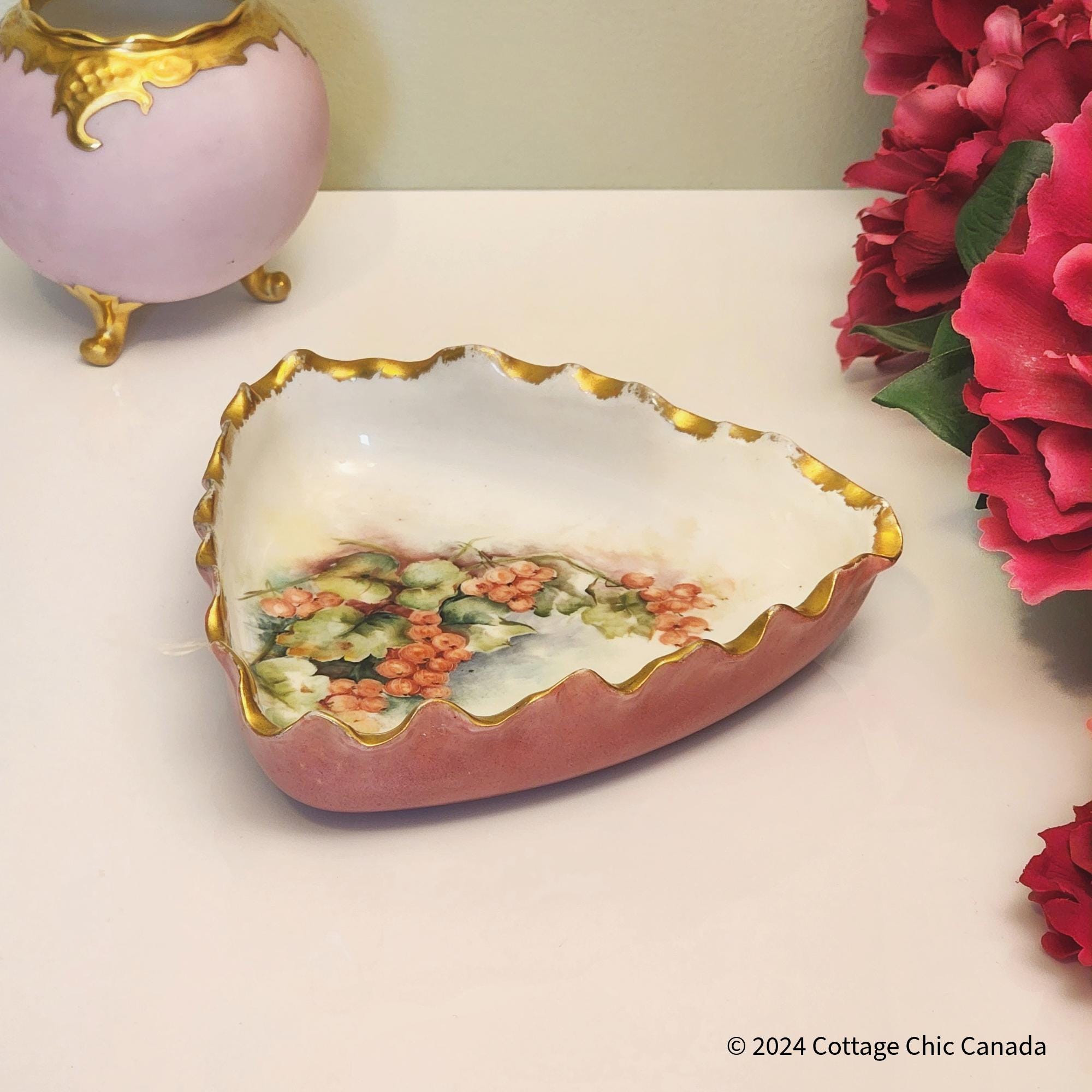 A beautiful vintage Syracuse China (Onondaga Pottery Co.) triangular dish, hand-painted with a cluster of coral berries and green leaves against a soft watercolor background. The scalloped edge is finished with delicate gold trim, and the exterior fades from cream to a warm rose-pink hue, giving it a graceful and romantic look. Made in the 1930s–1940s, this piece captures the elegance of early American vitreous china — refined yet inviting, perfect for display or use as a trinket dish, candy bowl, or vanity accent.