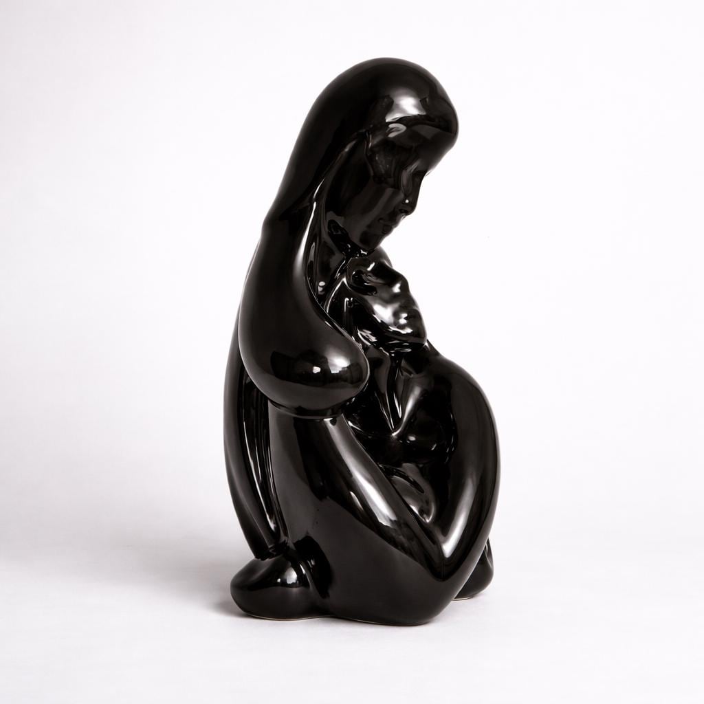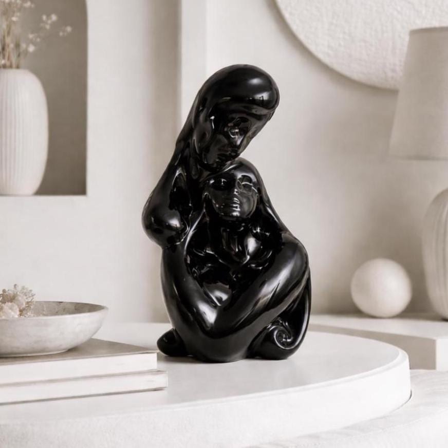 A striking late 20th century ceramic sculpture depicting a stylized couple in a tender embrace. Smooth, continuous curves define the intertwined figures, while a mirror gloss black glaze reflects light beautifully and heightens the sense of movement, intimacy, and balance from every angle.