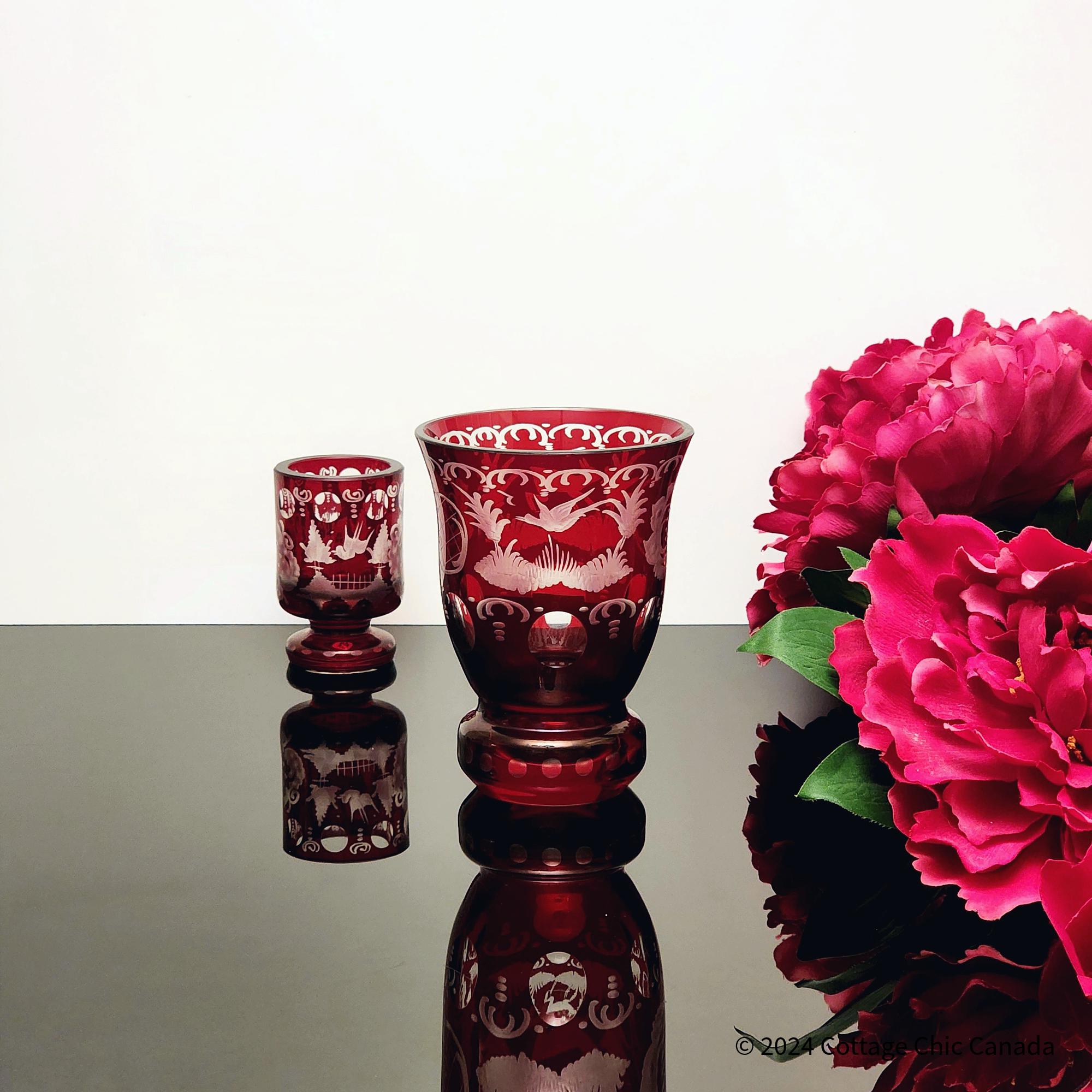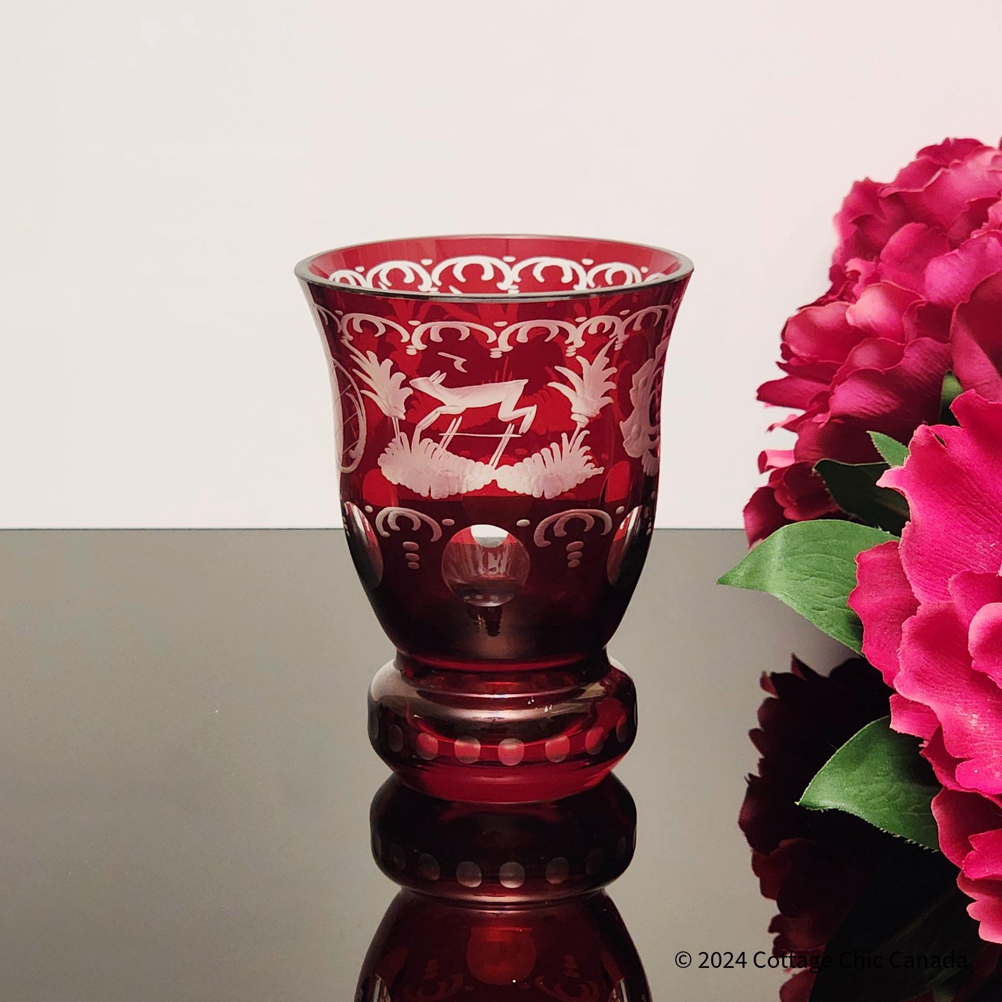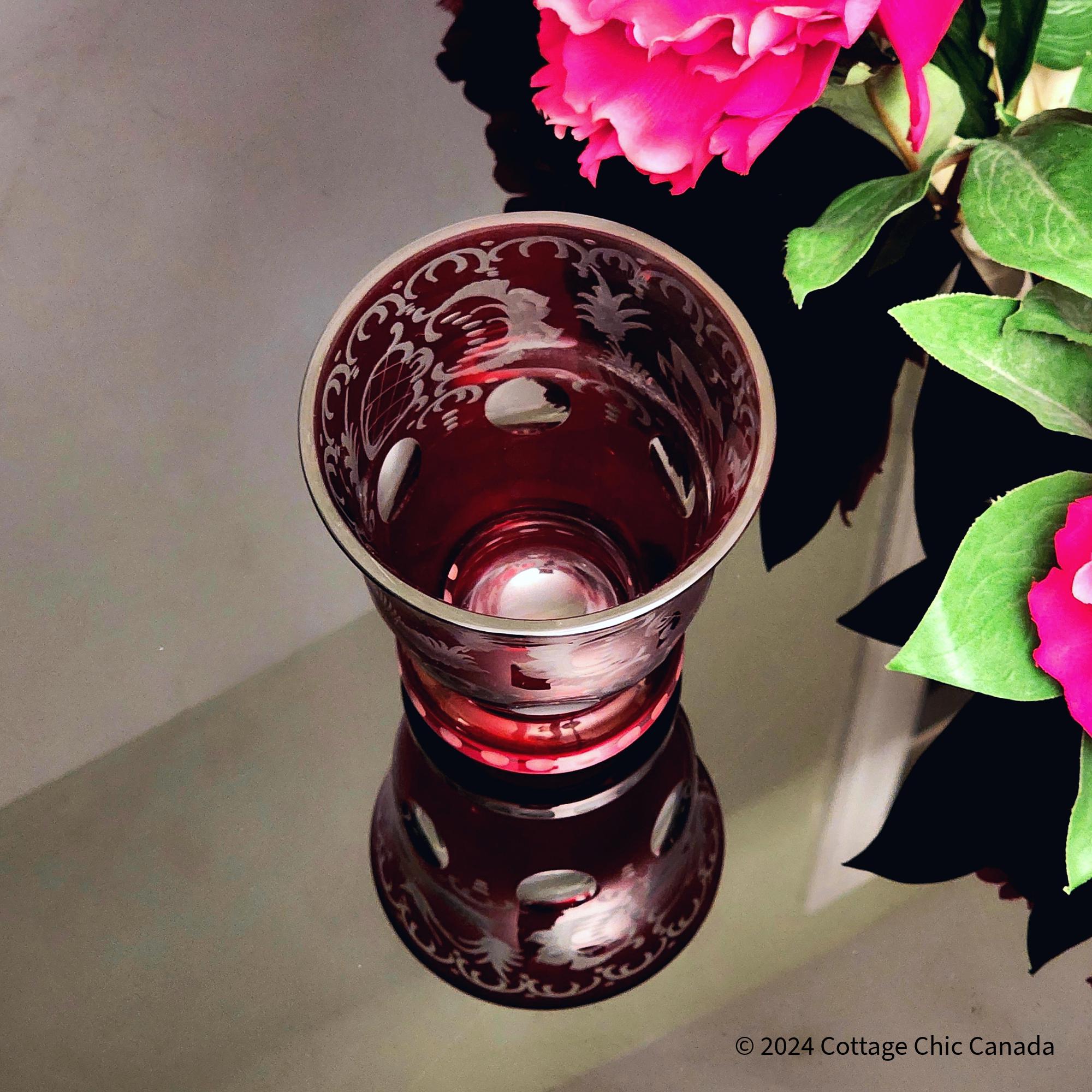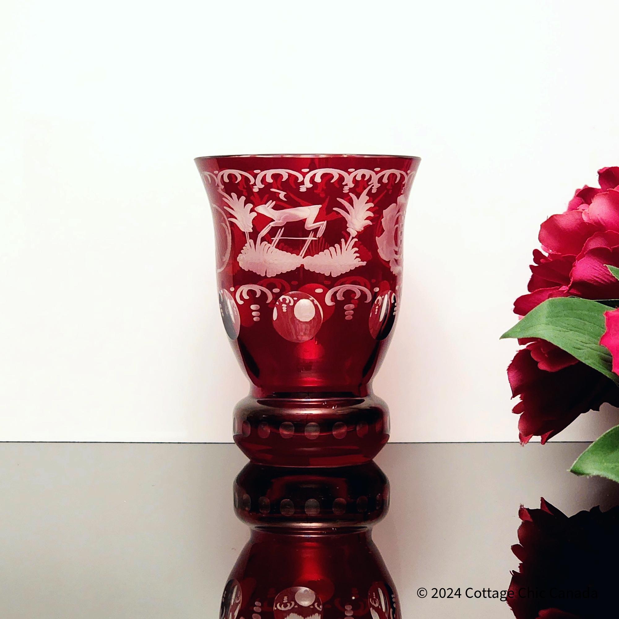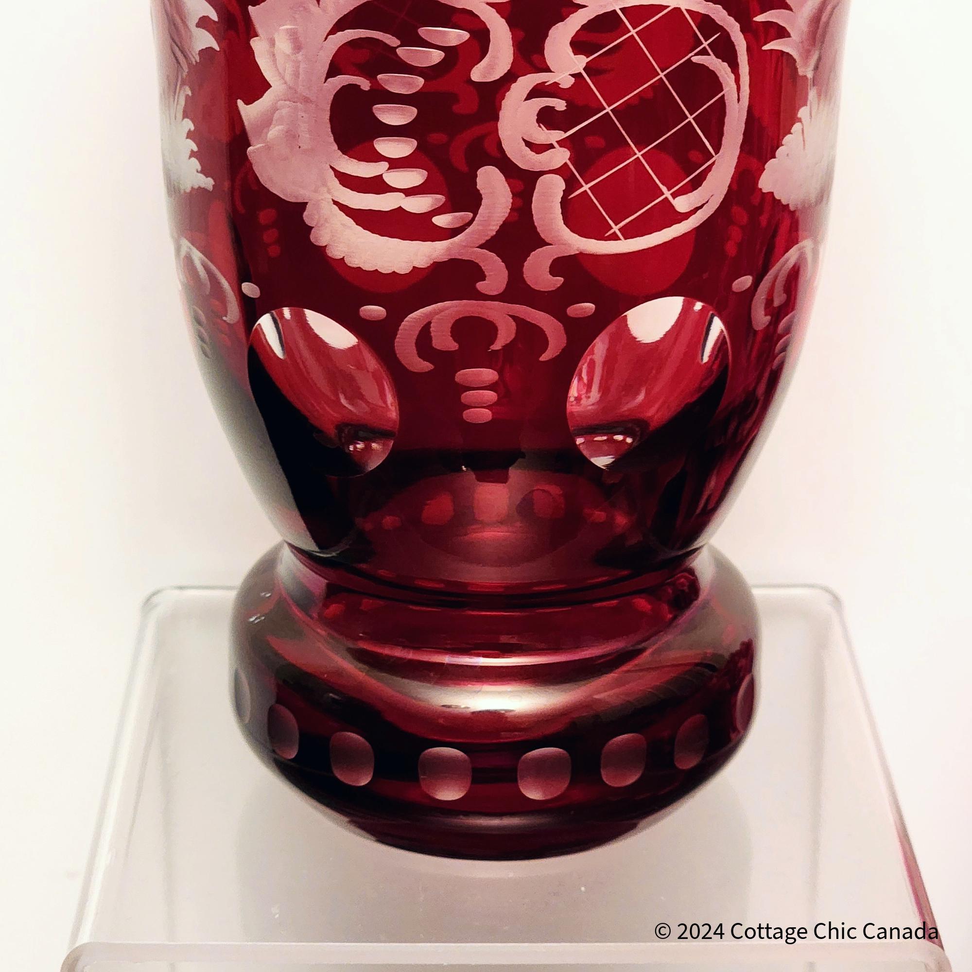 A rich ruby cut-to-clear vase engraved with nature scenes and neoclassical motifs. Perfect for holiday tablescapes, mantle displays, small floral arrangements, and curated glass collections.