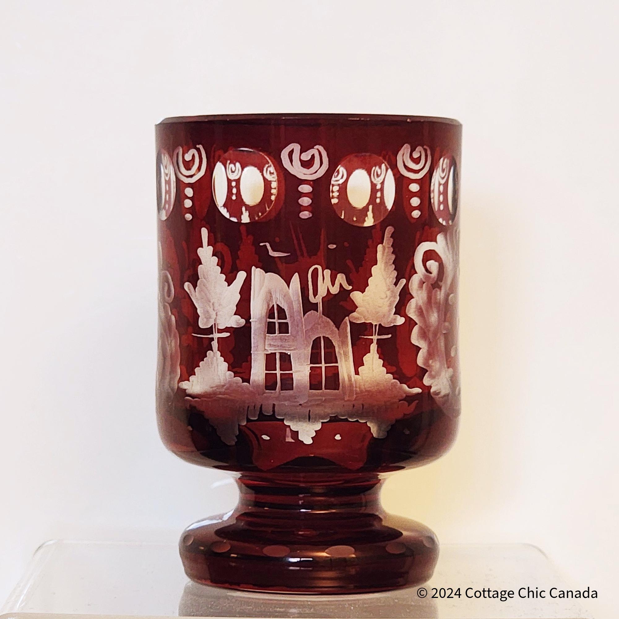 A rich ruby cut-to-clear vase engraved with nature scenes and neoclassical motifs. Perfect for holiday tablescapes, mantle displays, small floral arrangements, and curated glass collections.