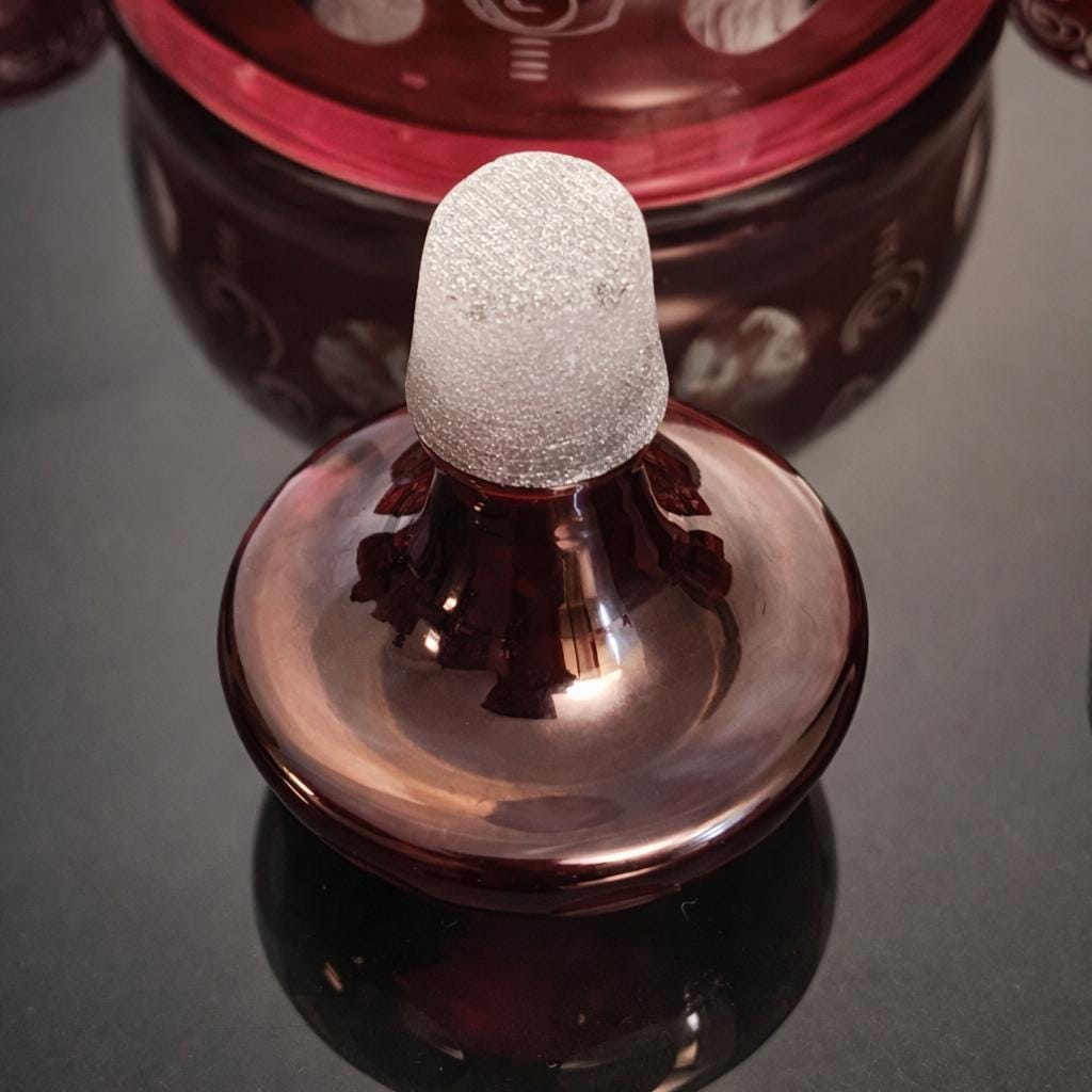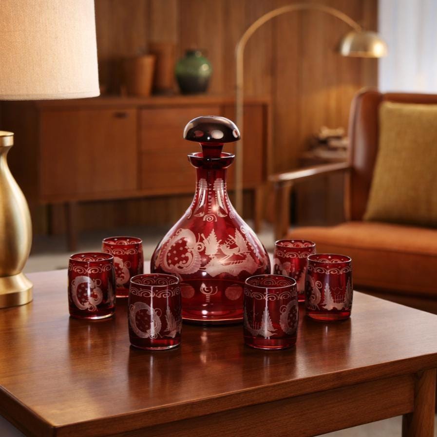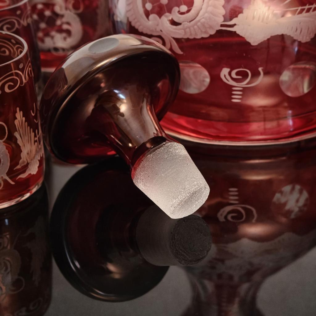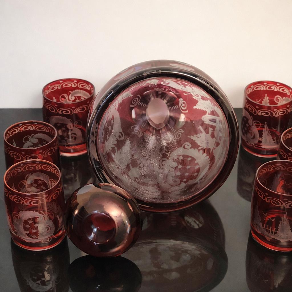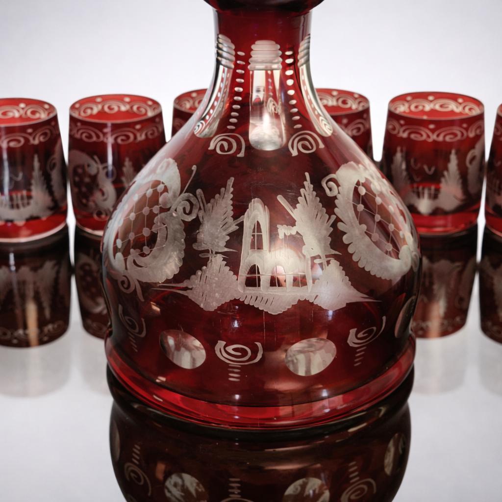 Bohemian Egermann Ruby Red Cut-to-Clear Crystal Decanter Cordial Set – Vintage Mid Century Czech