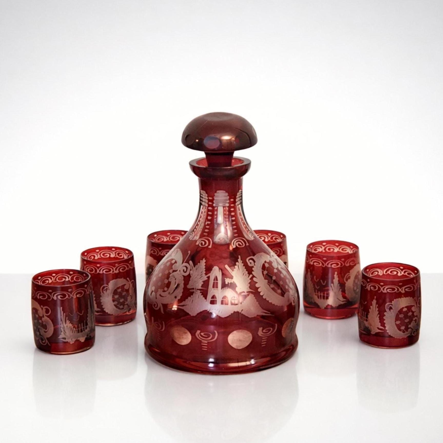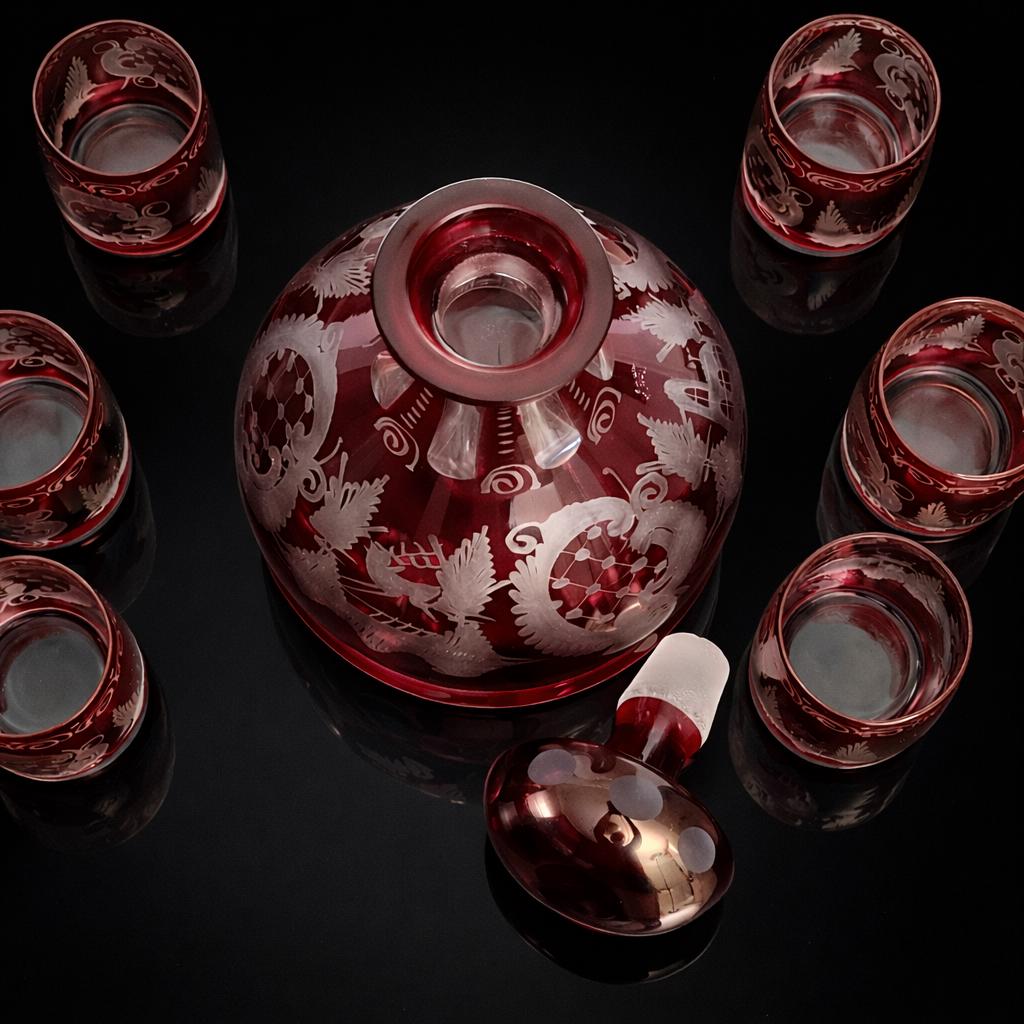 A rich ruby cut-to-clear decanter and cordial set designed to elevate aperitif service or bar display. Made by Egermann of Bohemia, this seven-piece ensemble includes a bulb-form decanter with faceted stopper and six matching cordial glasses, all wheel-cut through a ruby overlay to reveal clear crystal beneath with engraved architectural and foliate motifs.