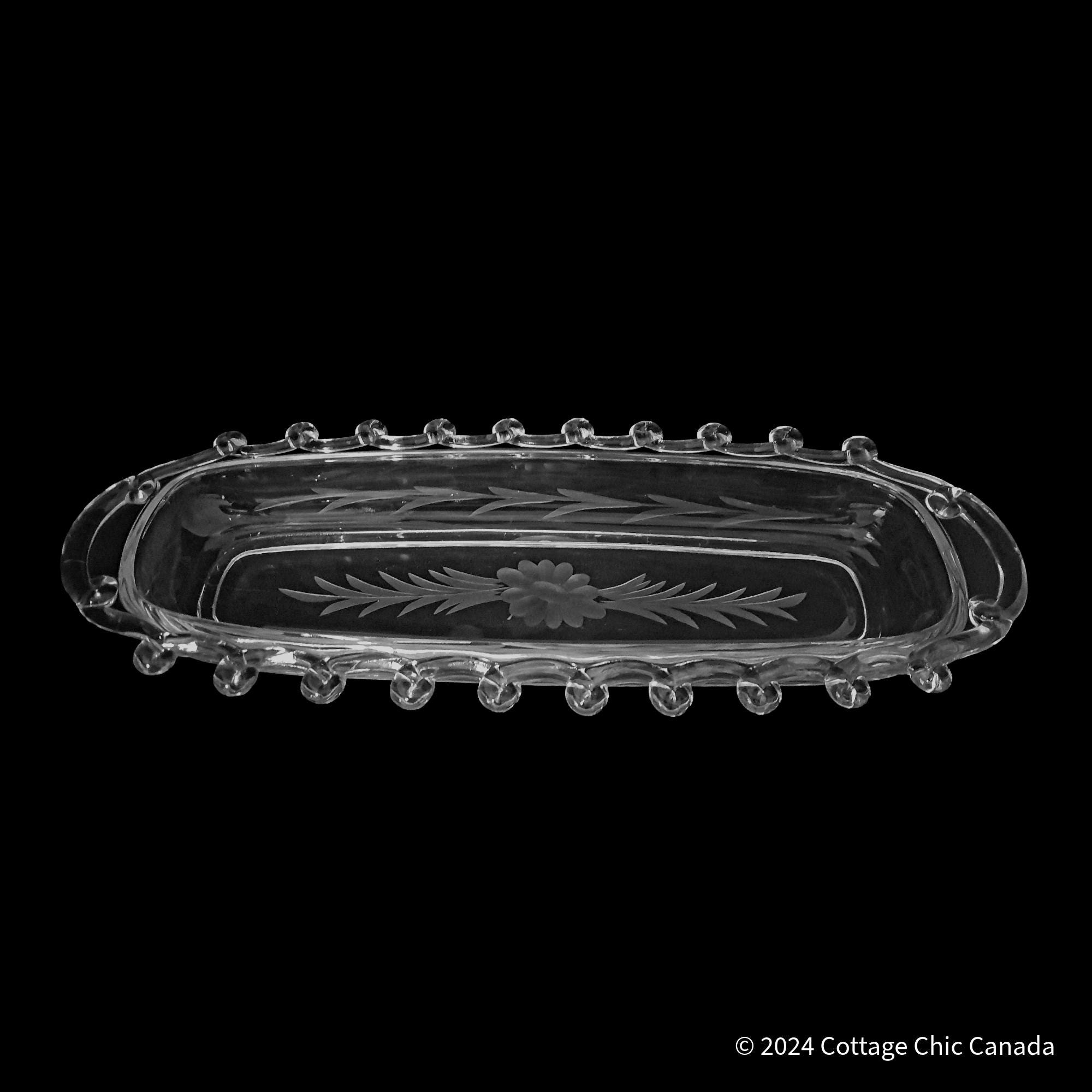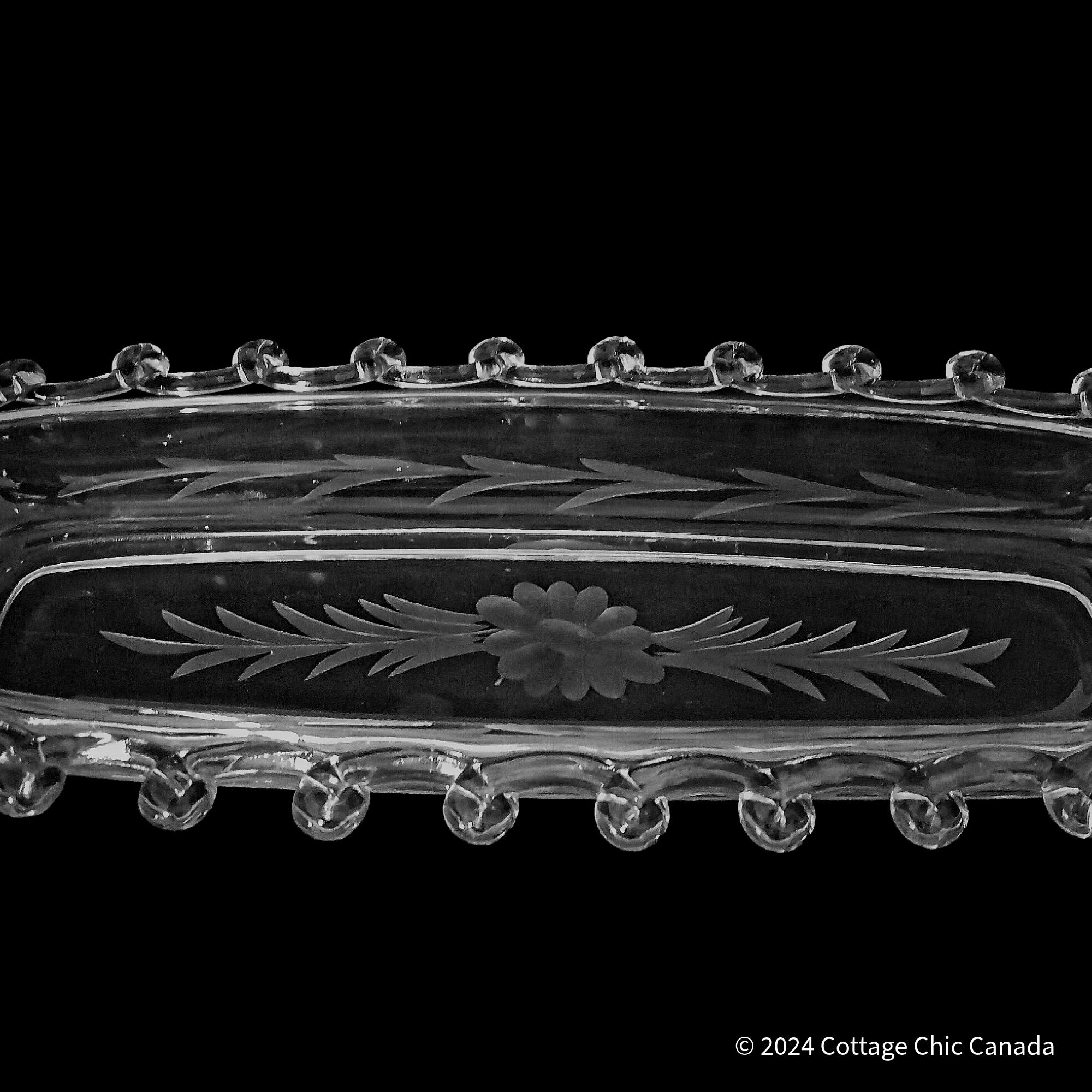 A well-preserved oval dish featuring the signature looped-bead rim and the factory-applied Daisy etch, composed of softly frosted blossoms and leafy sprays.