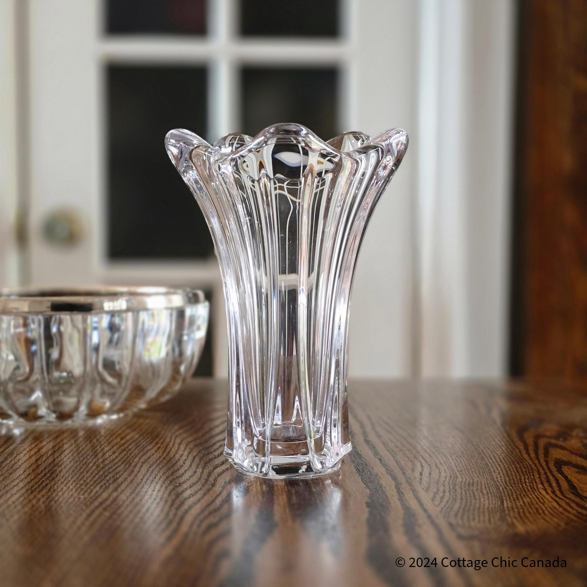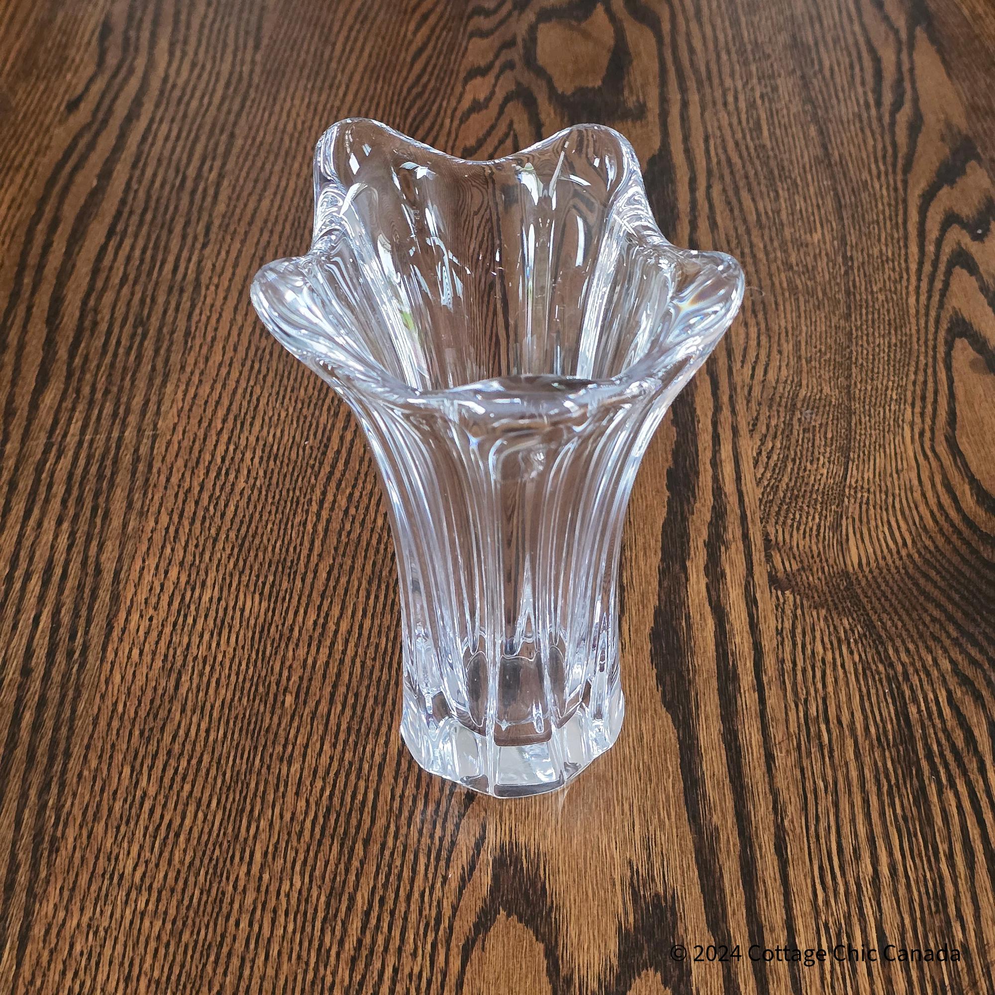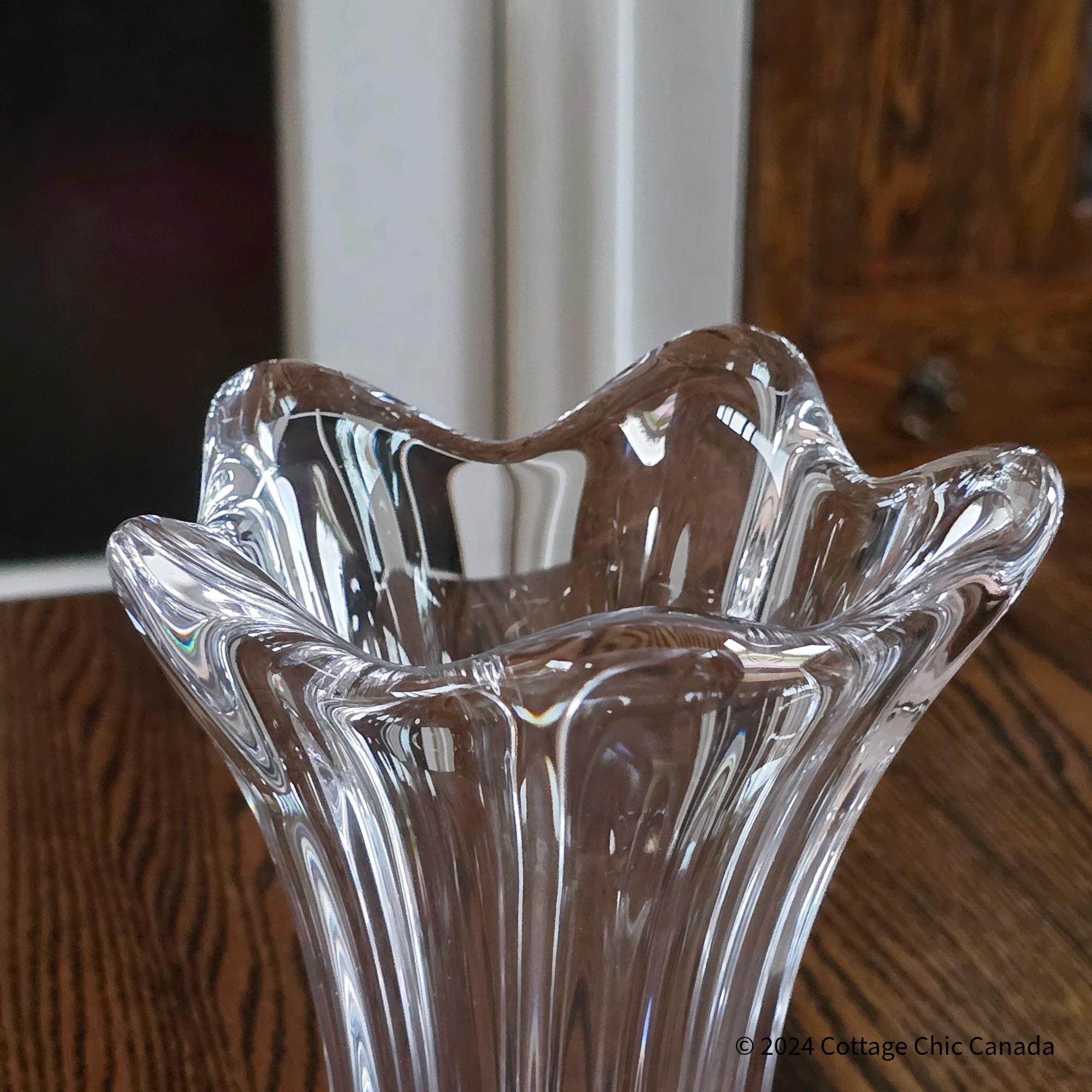 A stunning mid-century crystal vase by Cofrac Art Verrier of France, featuring a dramatic fluted design with fluid peaks and deep vertical panels that embody the studio’s signature modernist curves and clarity of form.