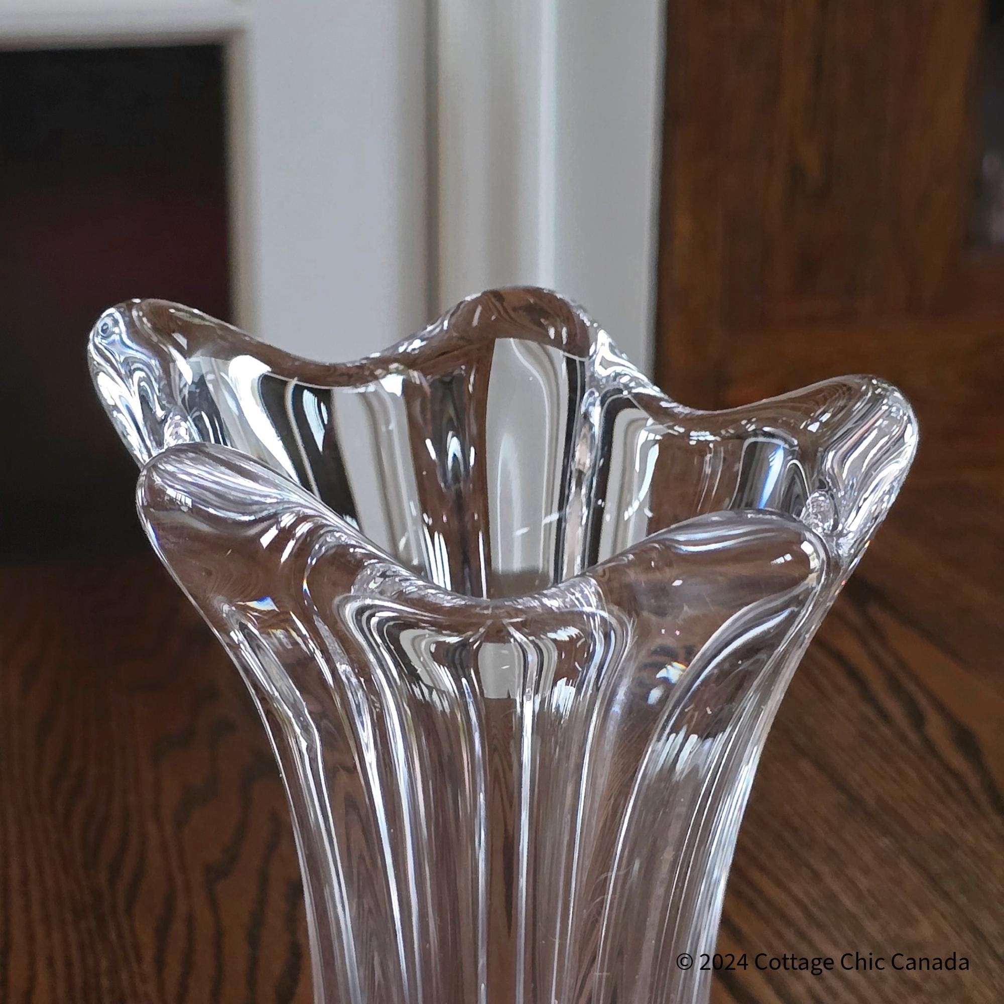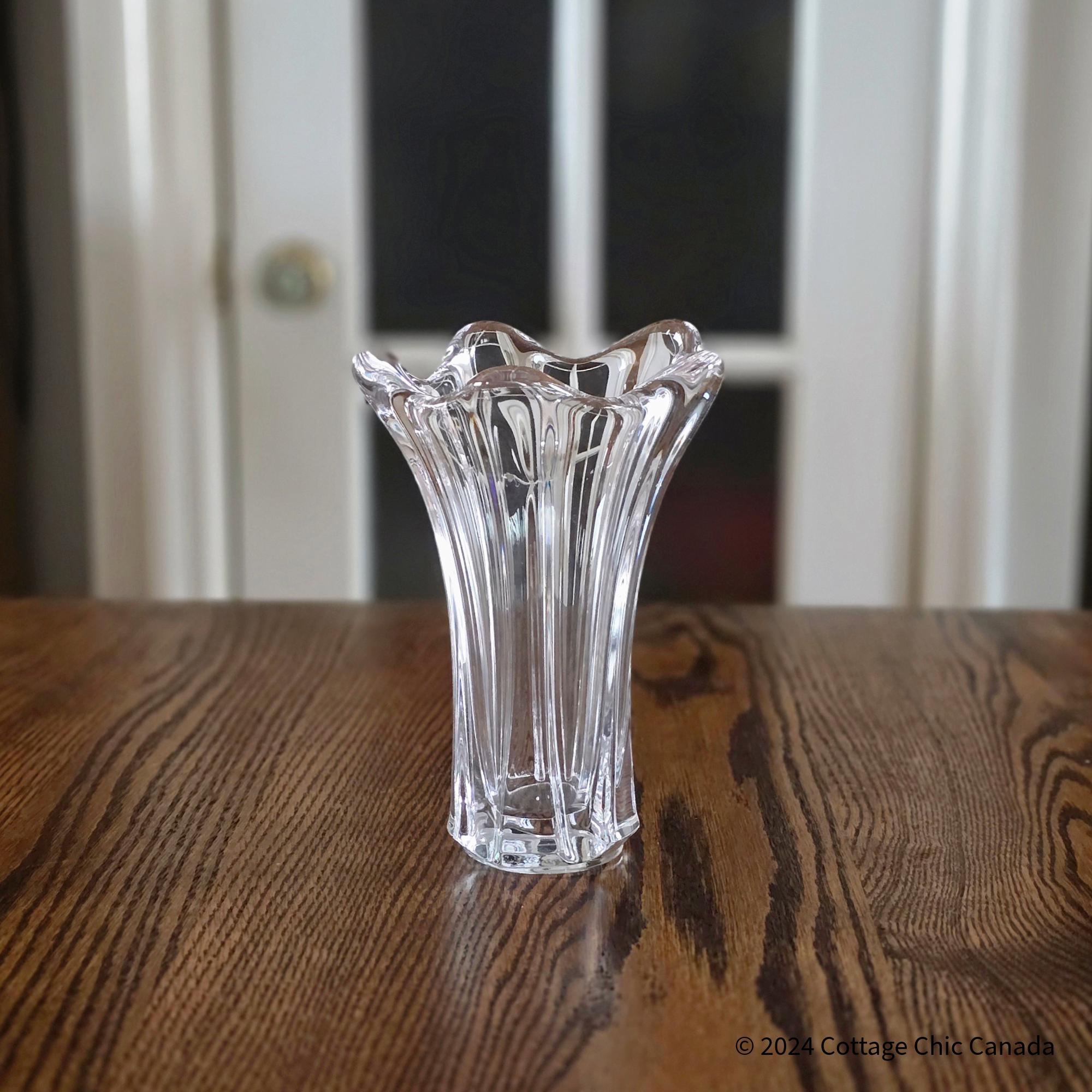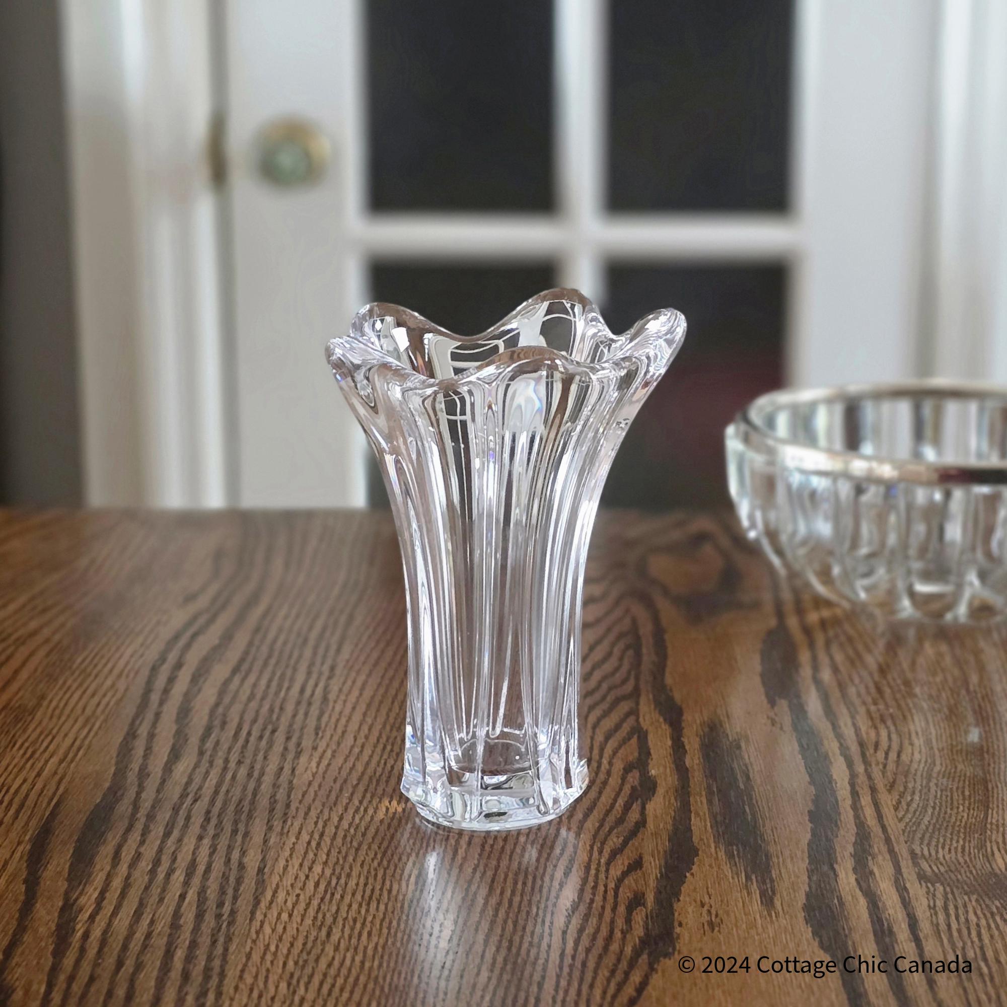 A stunning mid-century crystal vase by Cofrac Art Verrier of France, featuring a dramatic fluted design with fluid peaks and deep vertical panels that embody the studio’s signature modernist curves and clarity of form.