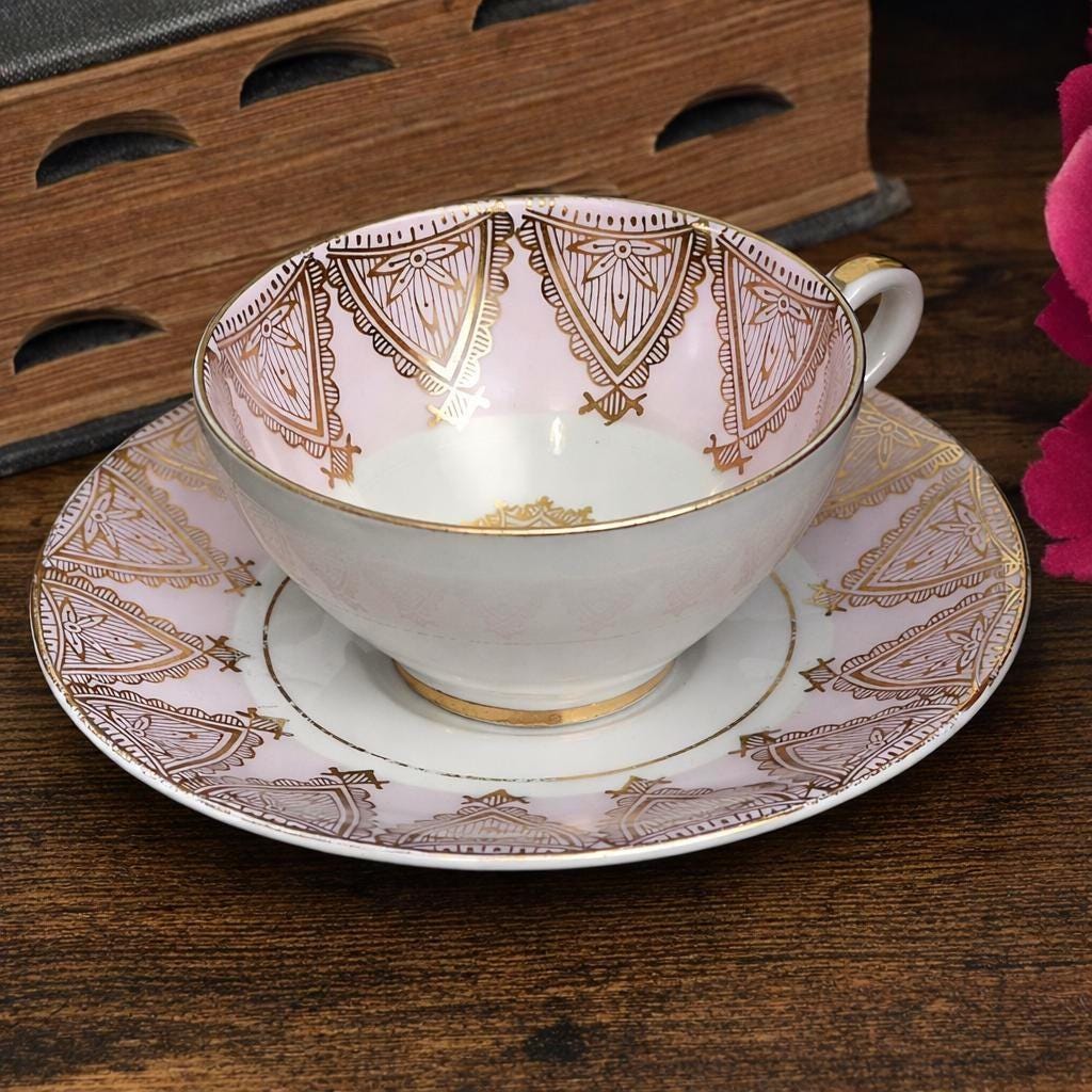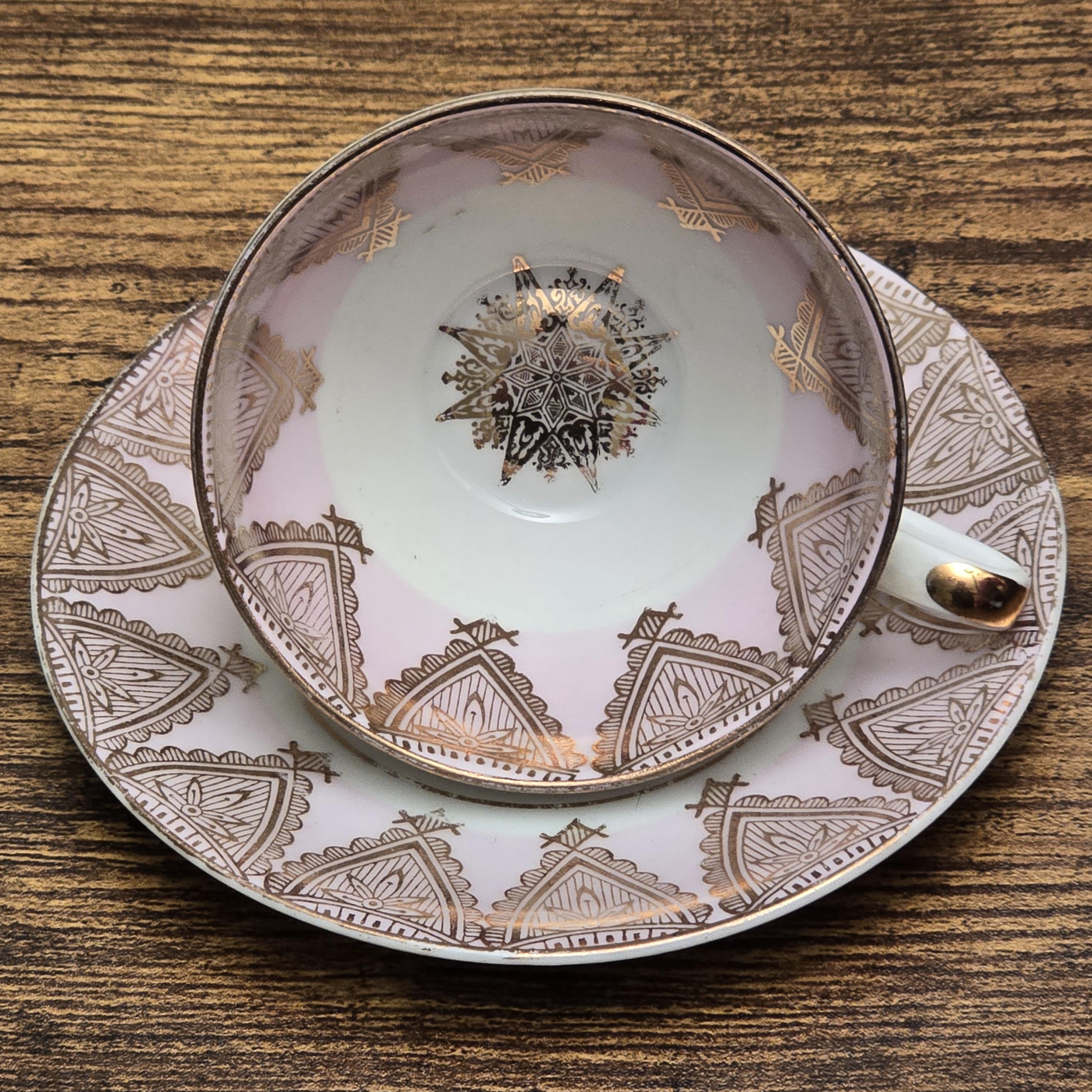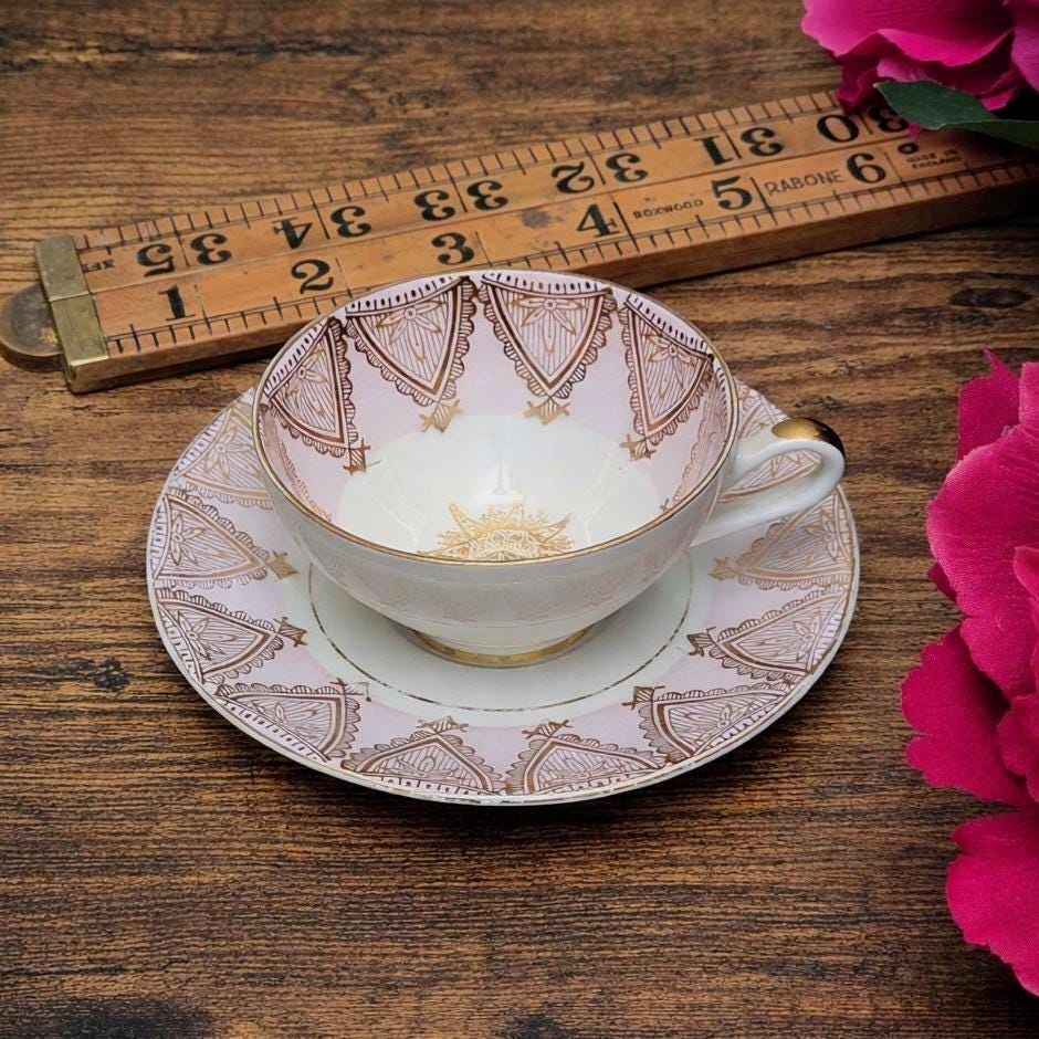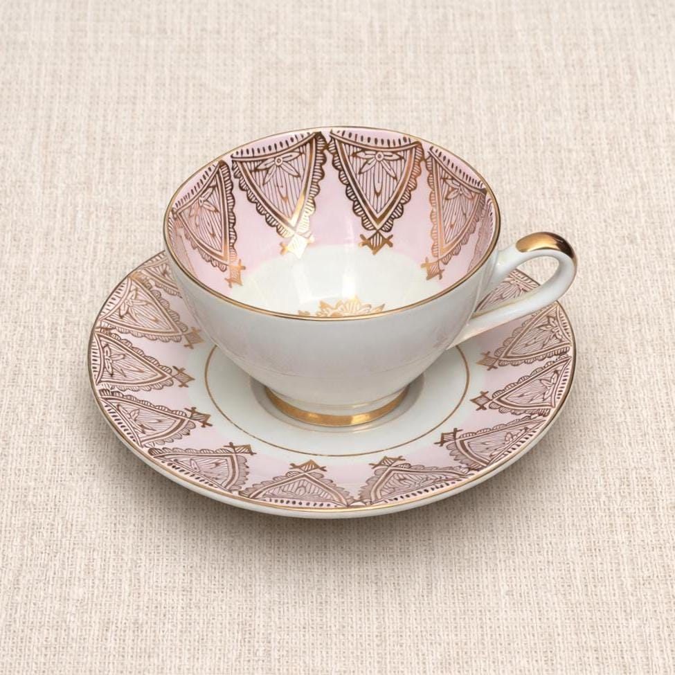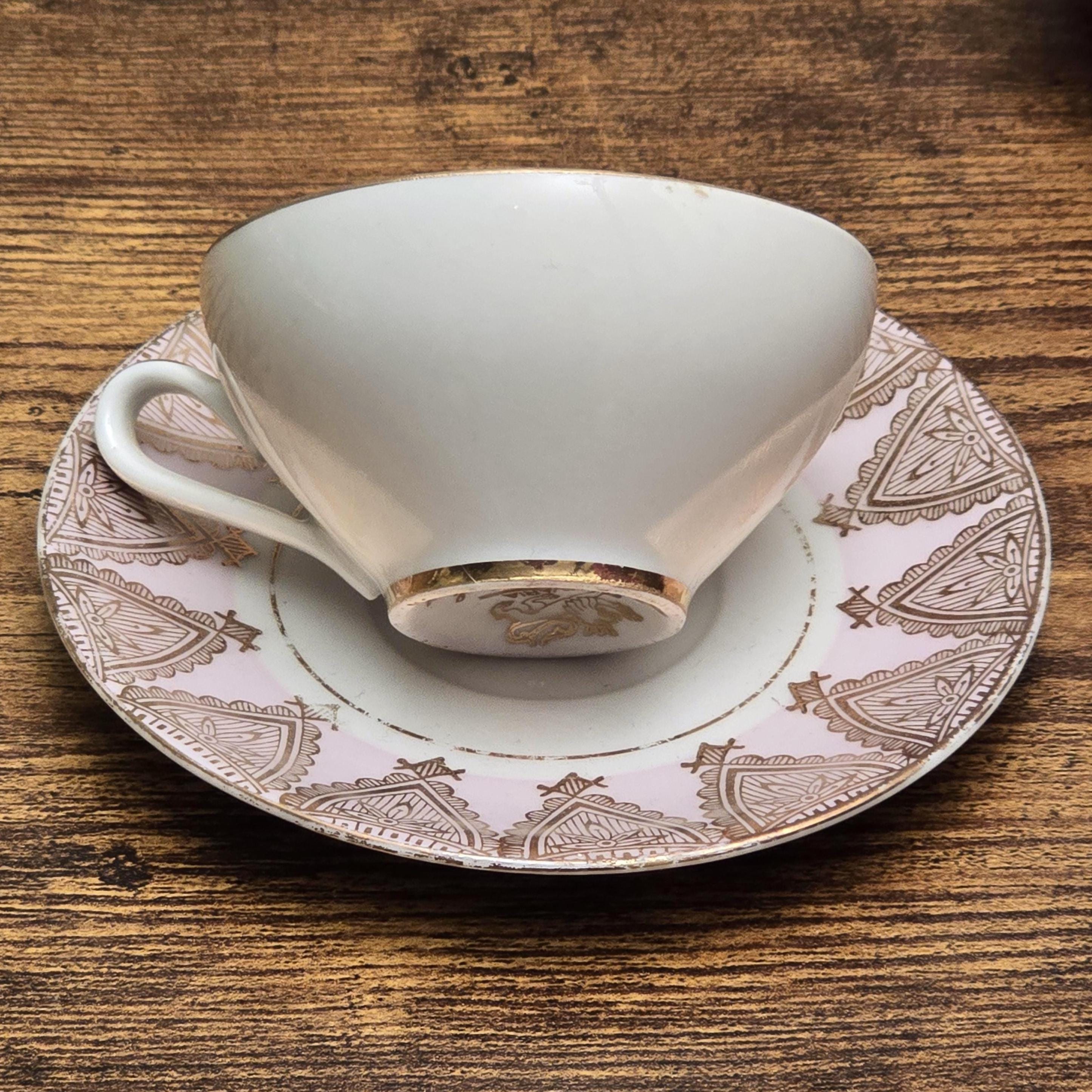 A petite Schlottenhof Bavaria demitasse cup and saucer in soft blush pink with gold geometric detailing. Ideal for espresso or after dinner coffee, it brings refined vintage European charm to any curated tea or coffee setting.