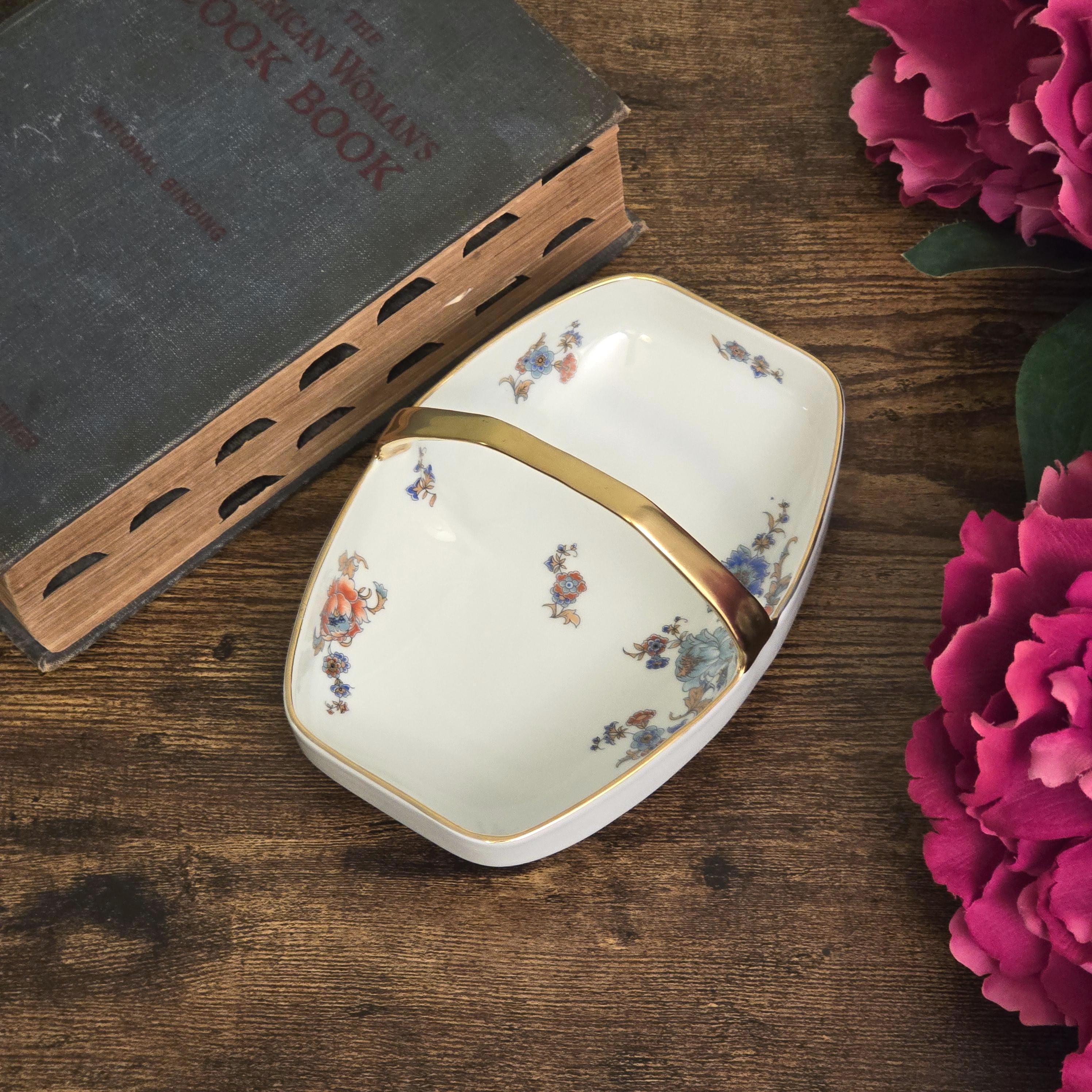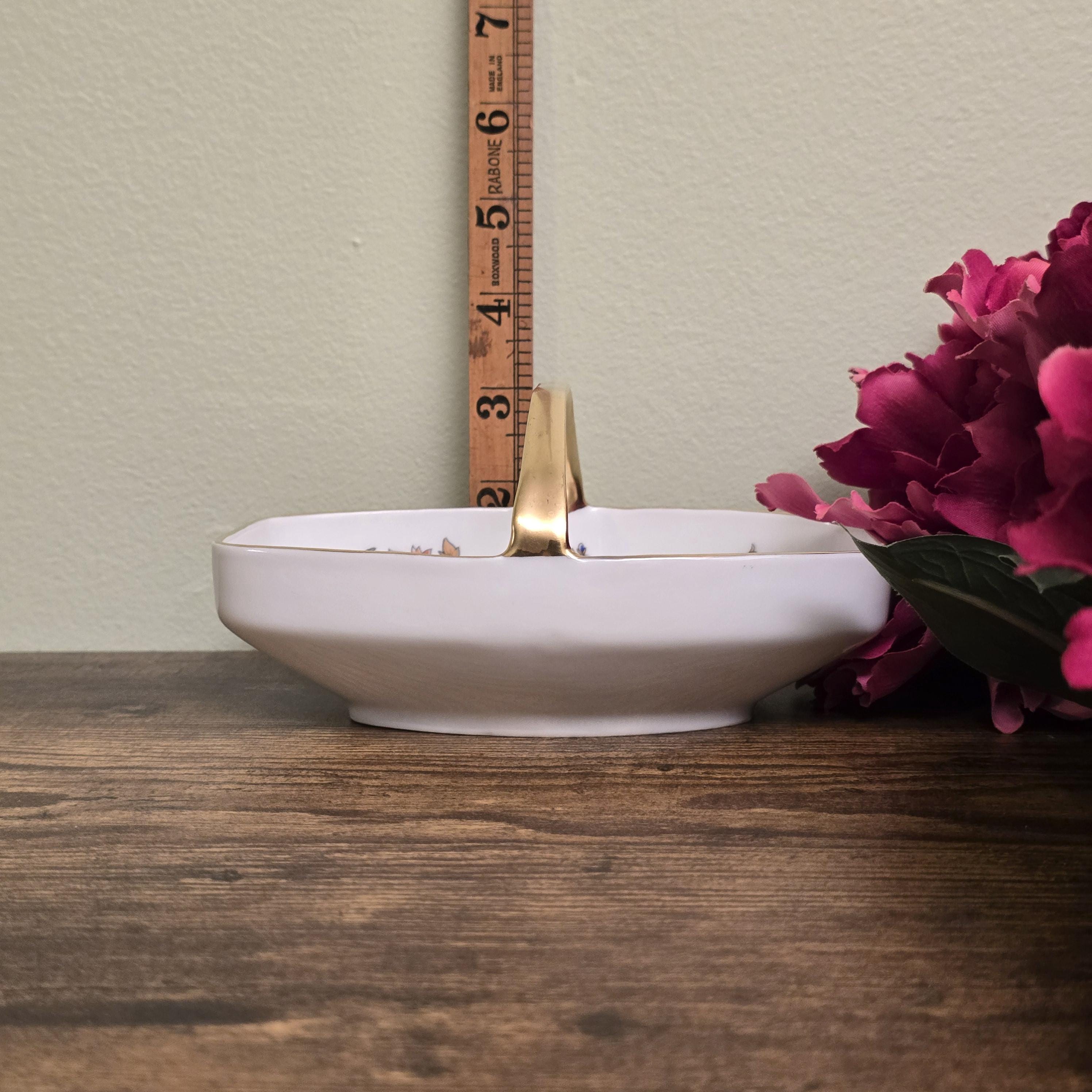 Mid-century Thomas Bavaria porcelain handled dish with gold trim and floral motif. Ideal for serving candies or as a graceful accent for vanity tops, sideboards, or display cabinets.