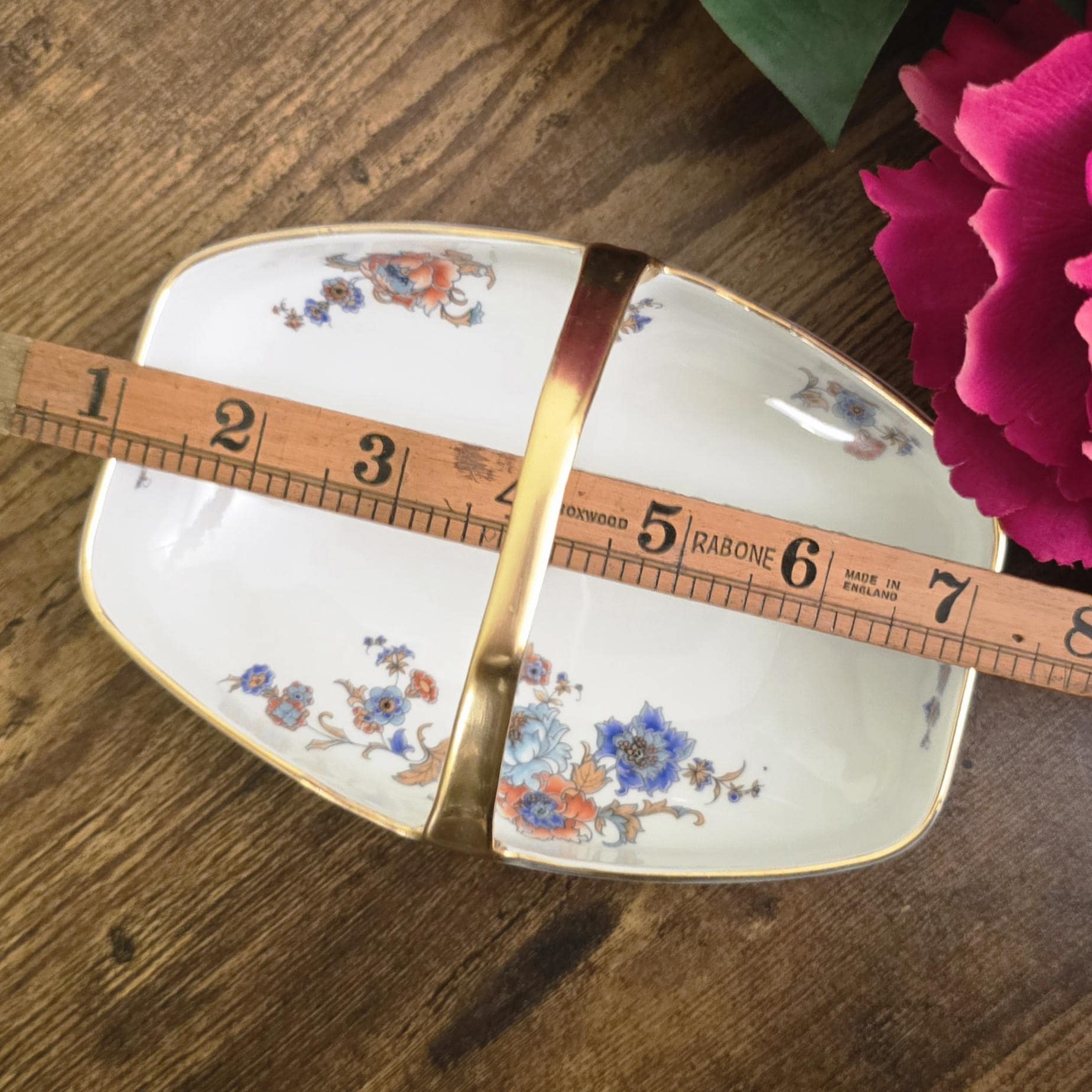 A refined porcelain dish with a softly rounded form, accented by a gracefully arched handle and hand-applied gold trim. Delicate floral sprays in cobalt blue, orange, and russet adorn the glossy off-white glaze, complementing the vintage charm of the cottagecore aesthetic and French country interiors.