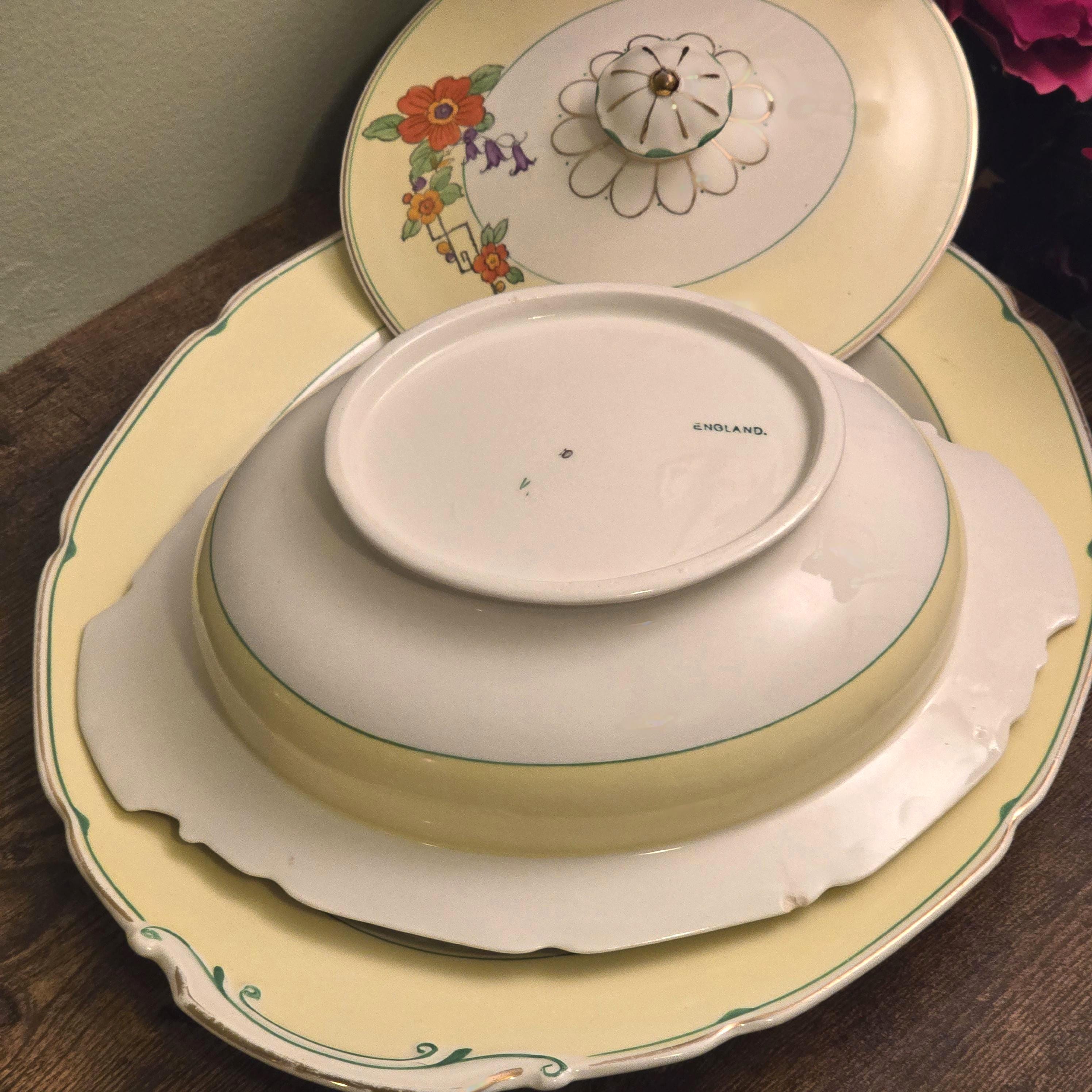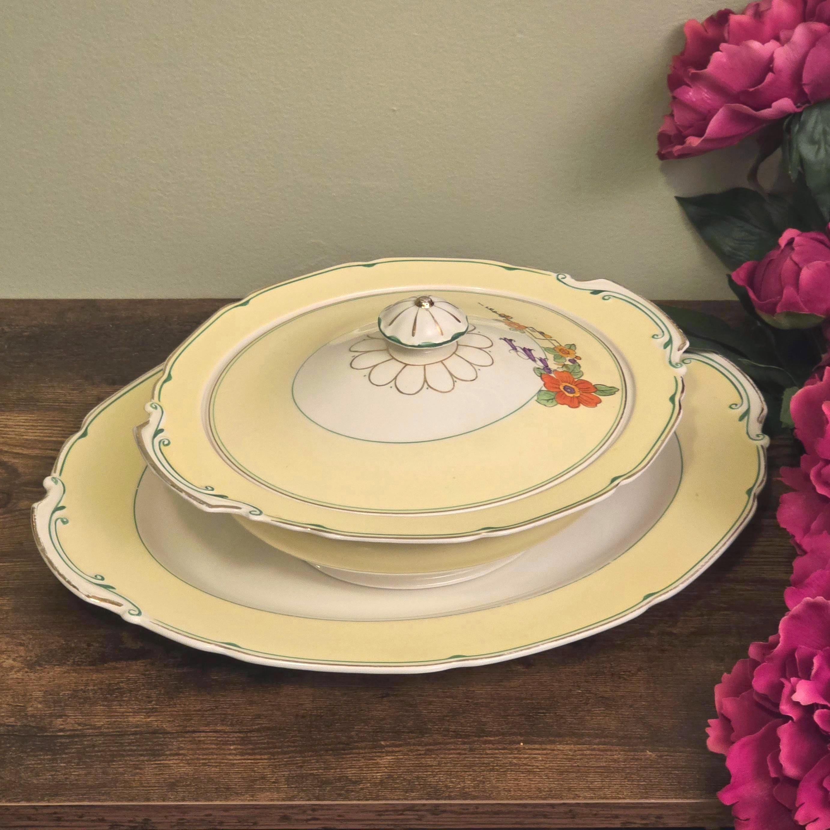 Staffordshire Floral Covered Vegetable Bowl and Platter – Vintage Art Deco Pottery England