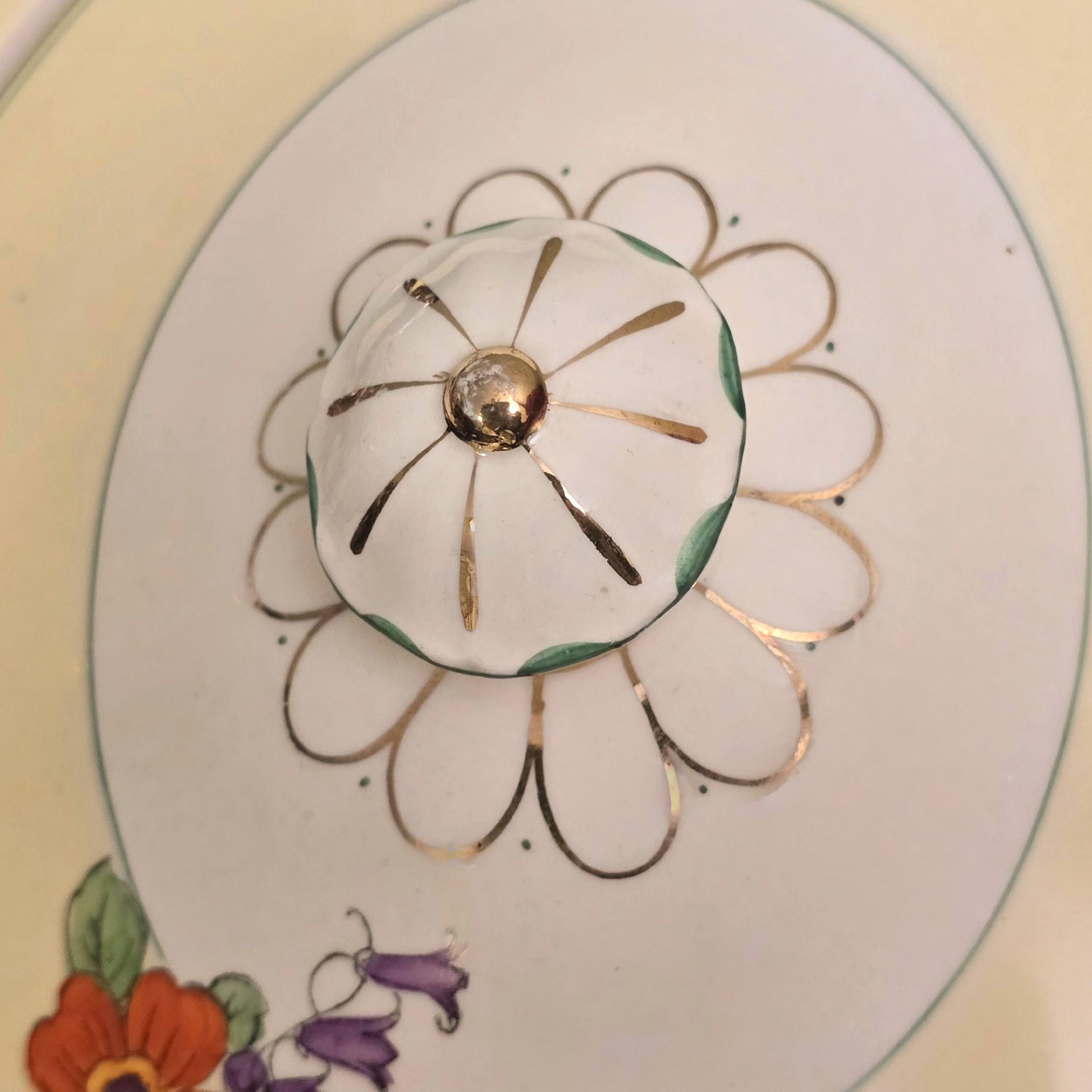 A hand-painted English earthenware lidded vegetable dish and matching platter from the Art Deco era. Crafted in creamy ivory glaze with lemon-yellow borders, green scrollwork, and stylized floral sprays in orange, purple, and gold tones, accented with fine gold detailing. Stamped ENGLAND from the Staffordshire region.
