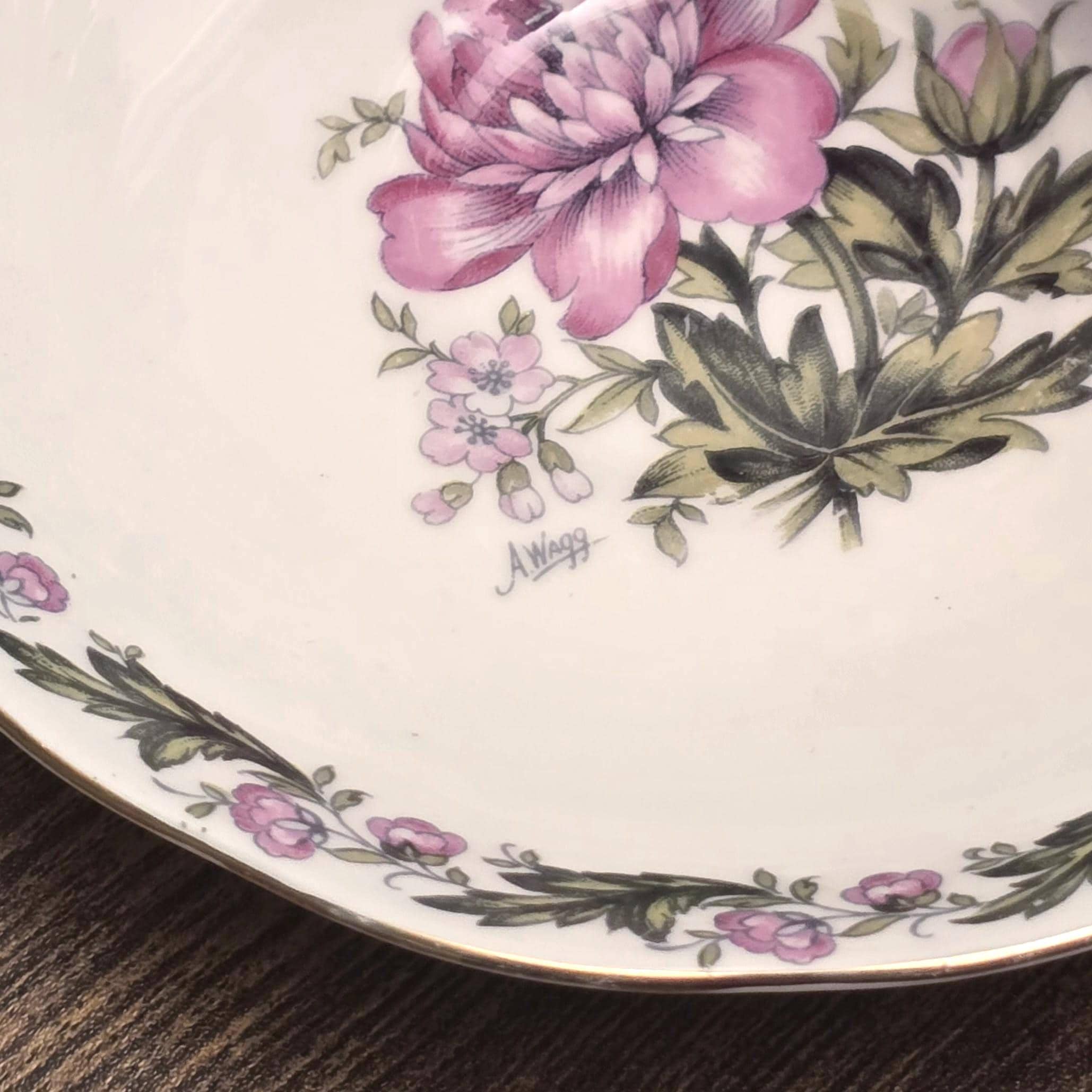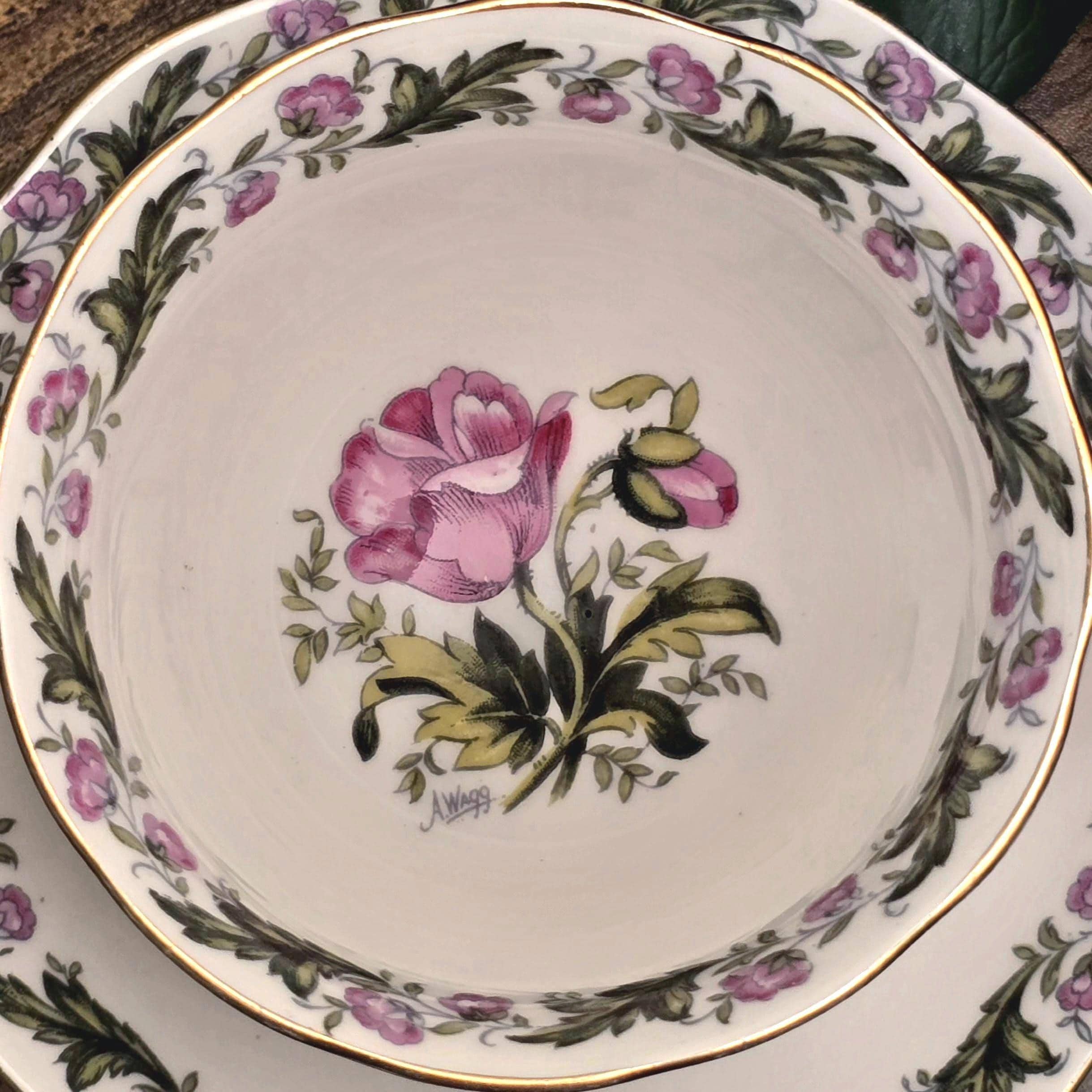 A vintage tea set featuring delicate florals with trailing rose garlands and fine gilded accents. The pattern is credited to A. Wagg, whose signature appears on several Royal Albert designs from the mid-twentieth century.