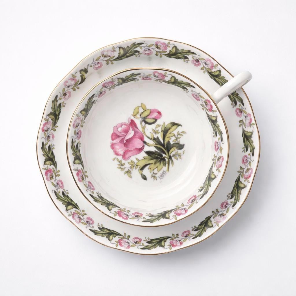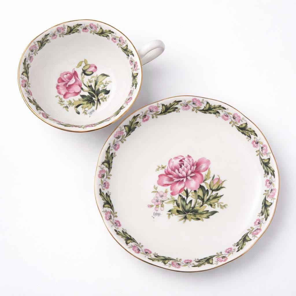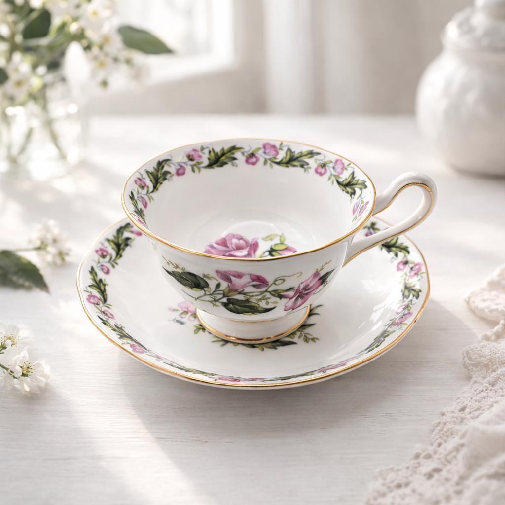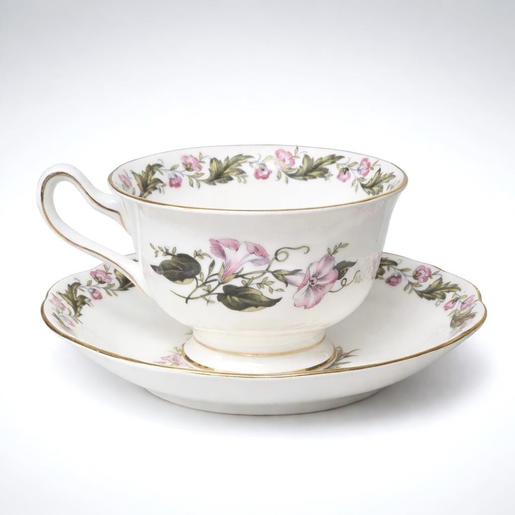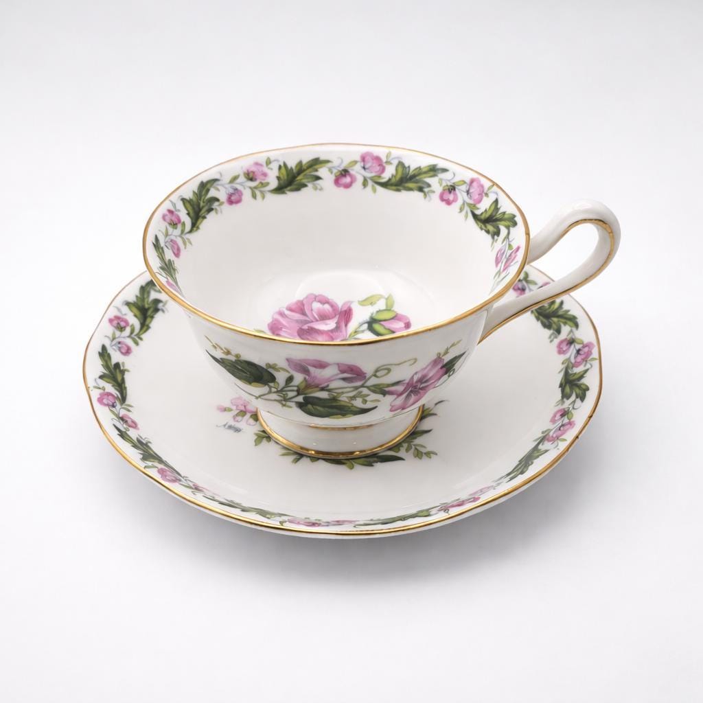 A mid century Royal Albert Cotswold fine bone china cup and saucer, ideal for cottage style tea tables or refined English china displays. Decorated with soft trailing rose garlands and finished with delicate gilded accents, this signed design reflects the romantic floral tradition for which Royal Albert is celebrated.