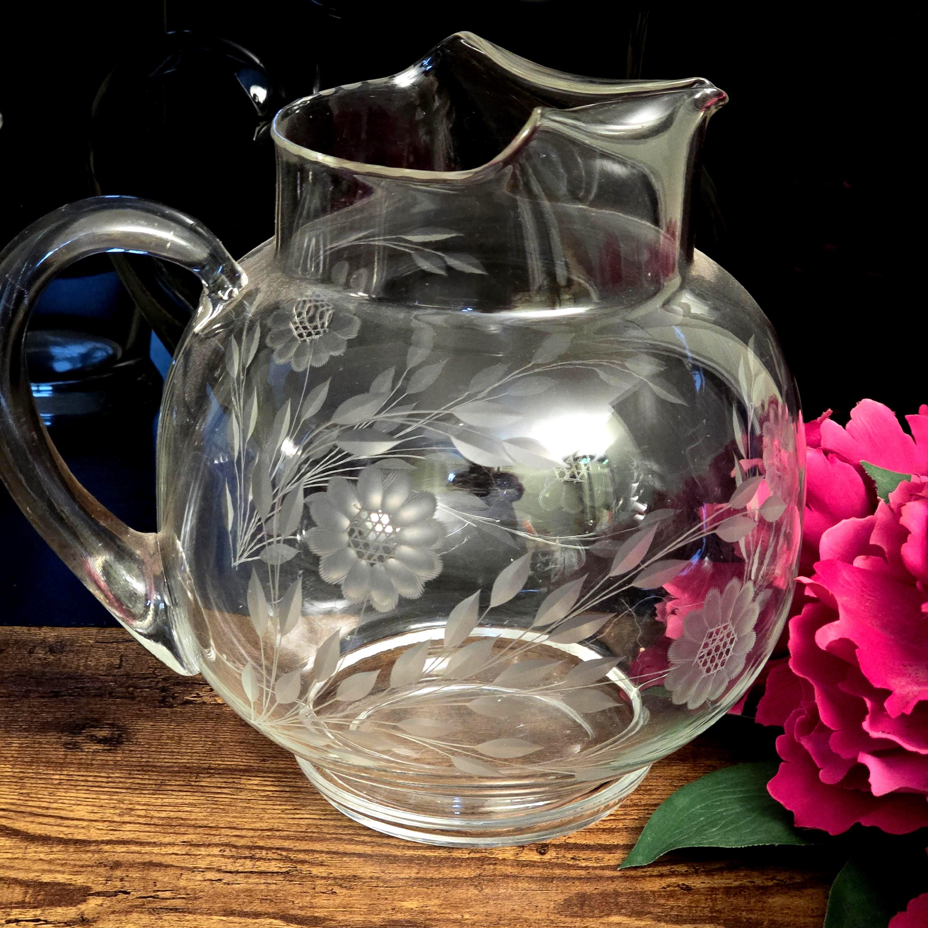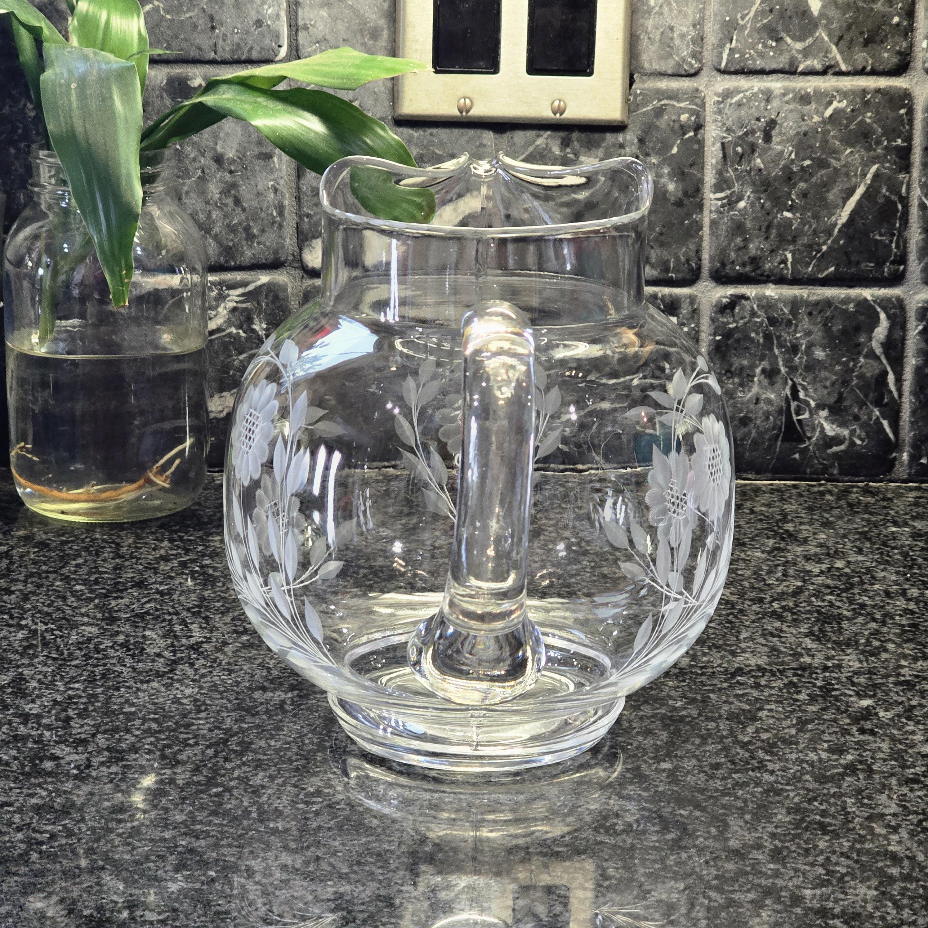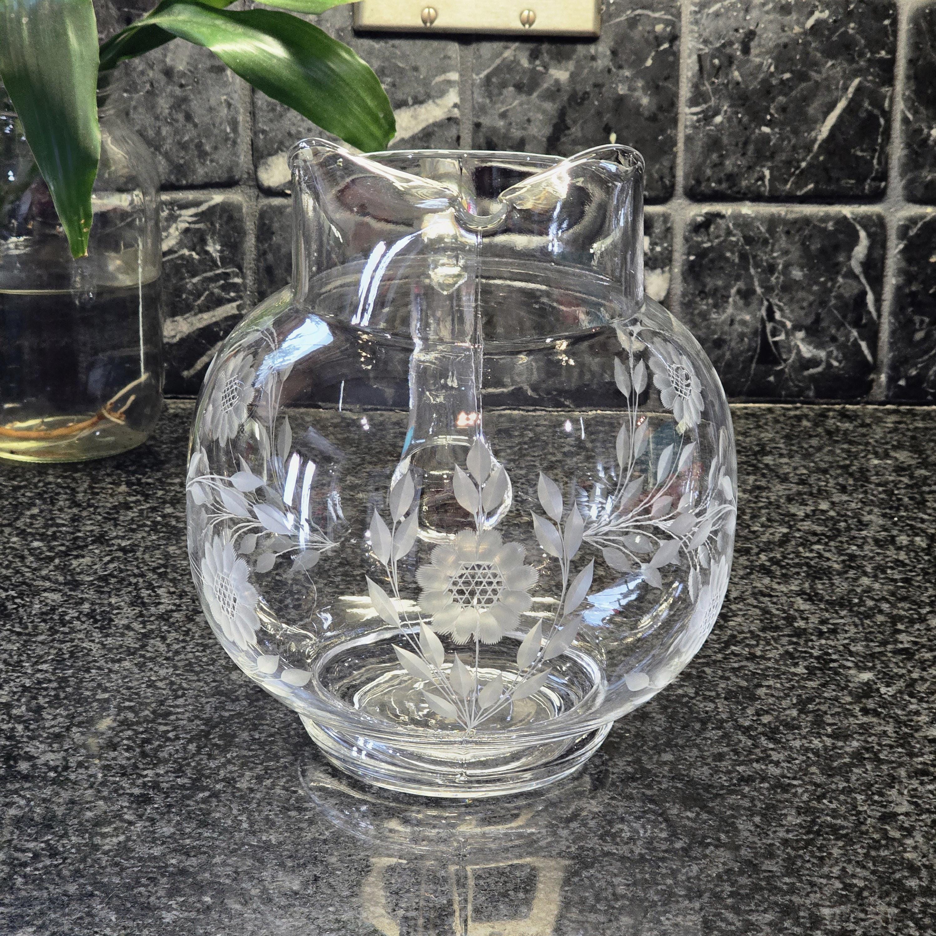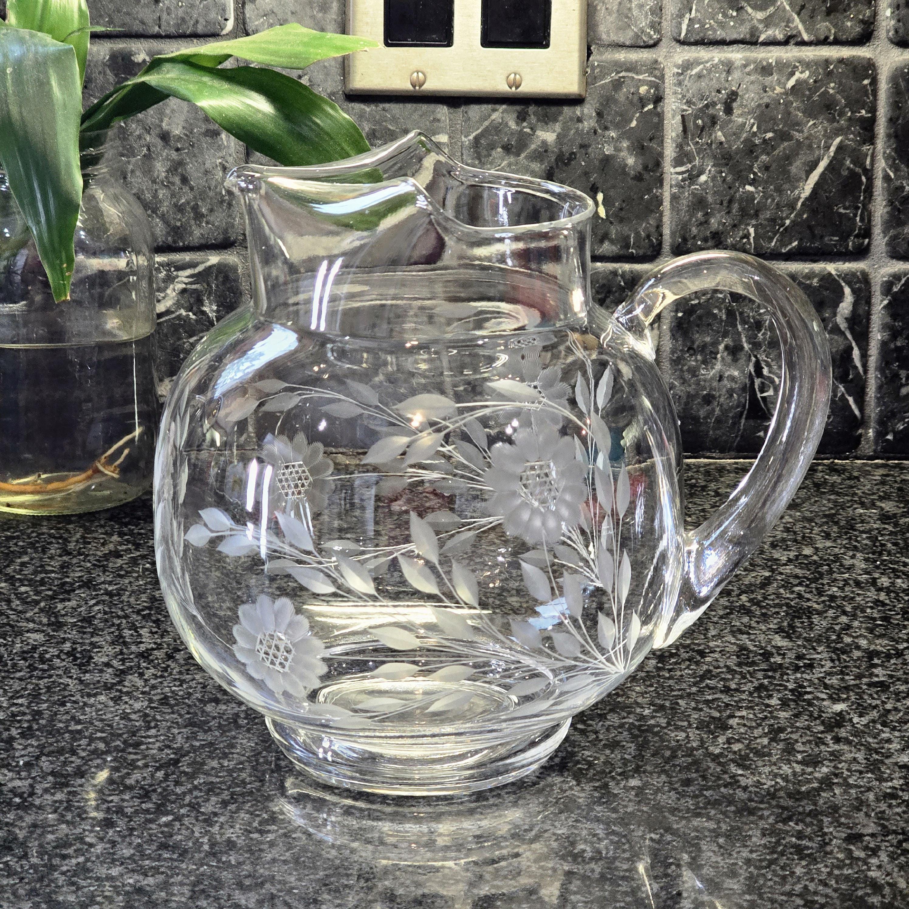 Hughes Cornflower Glass Water Pitcher – Early Mid Century Hand Cut Etched Floral Design Canada