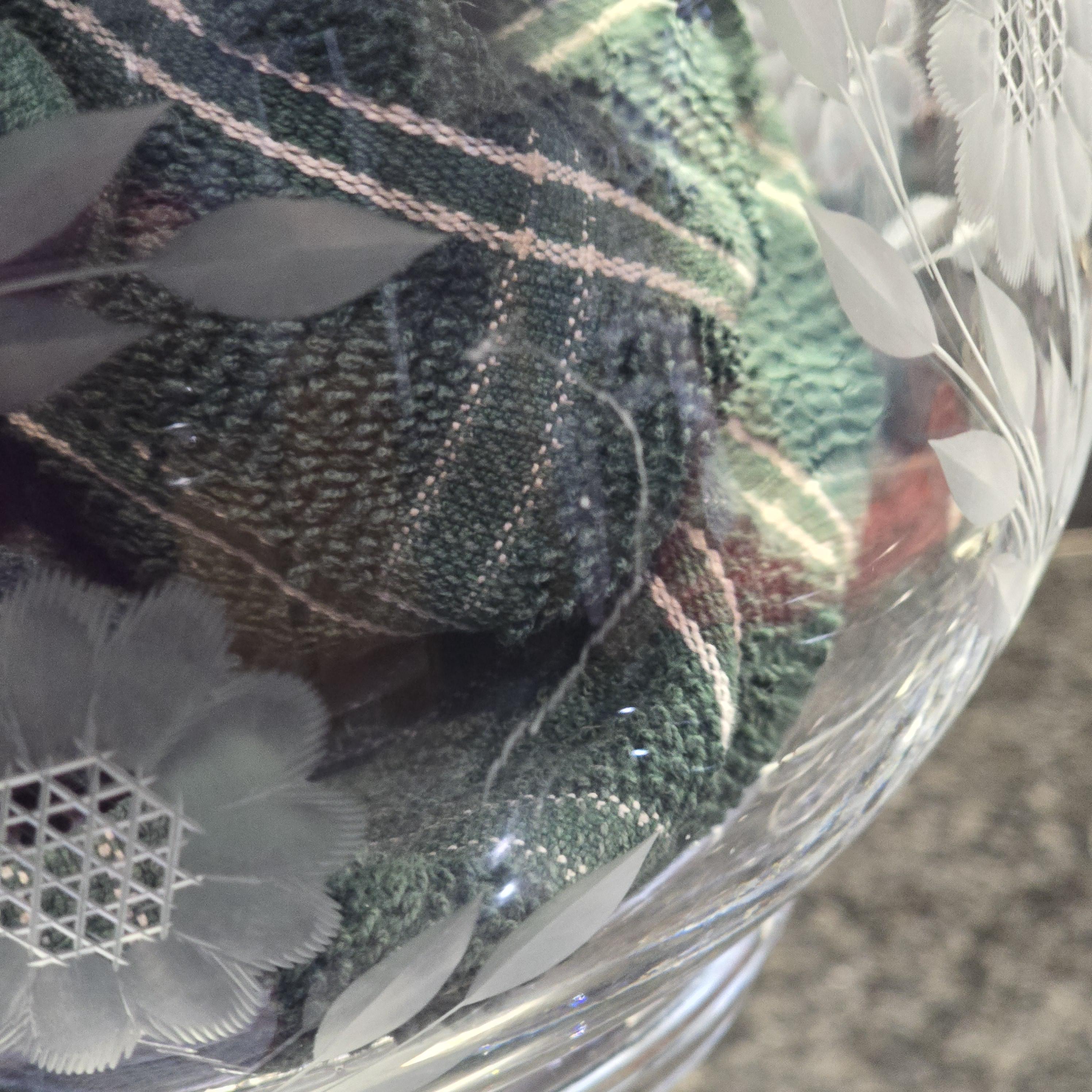 W. J. Hughes founded his Toronto workshop in 1914 and developed the Cornflower pattern that became one of Canada’s most recognizable glass embellishments. Skilled artisans etched each piece by hand onto undecorated blanks sourced primarily from American elegant glass manufacturers and, in later years, selected European glasshouses. Cornflower production continued until the mid 1980s, and early examples like this pitcher remain highly collectible today.