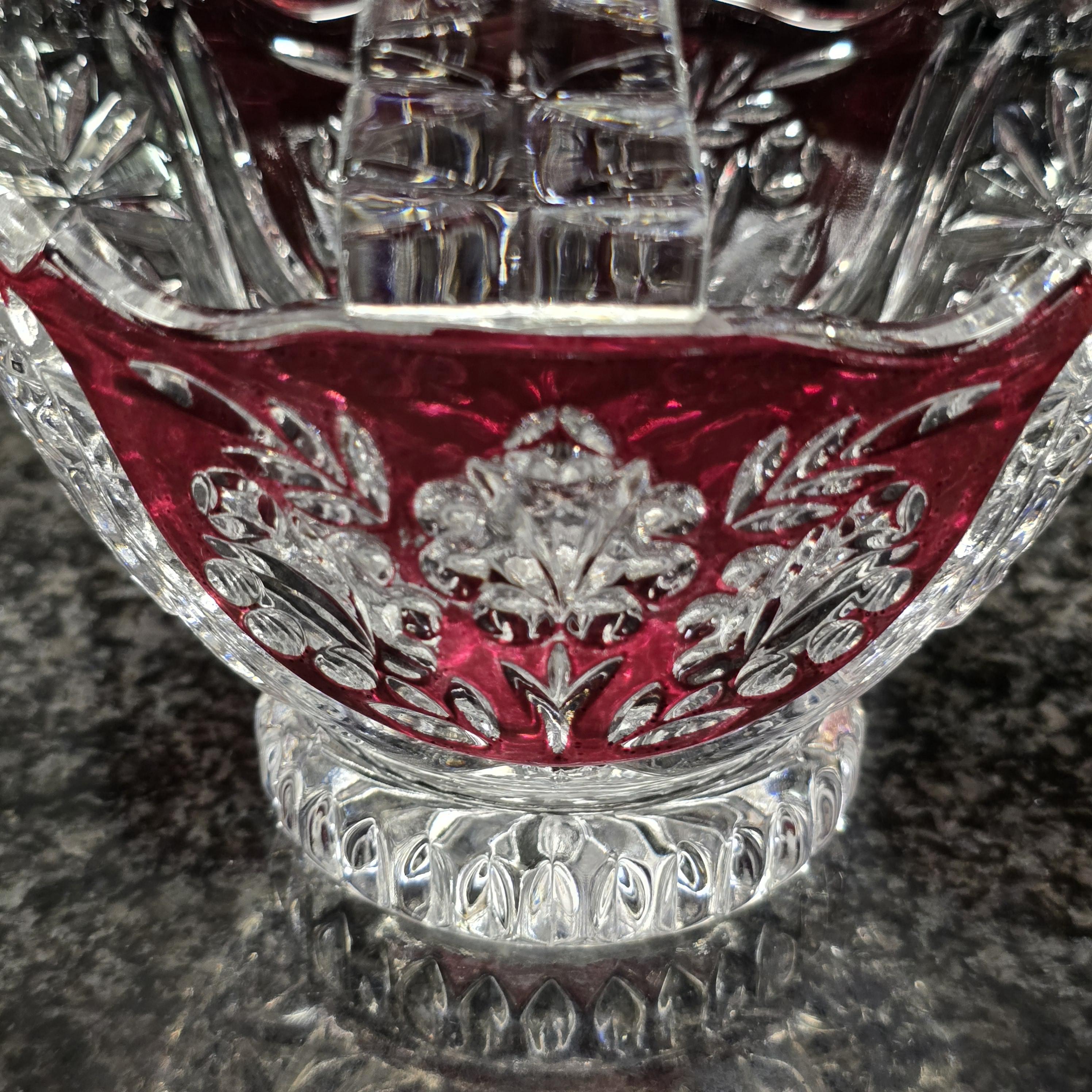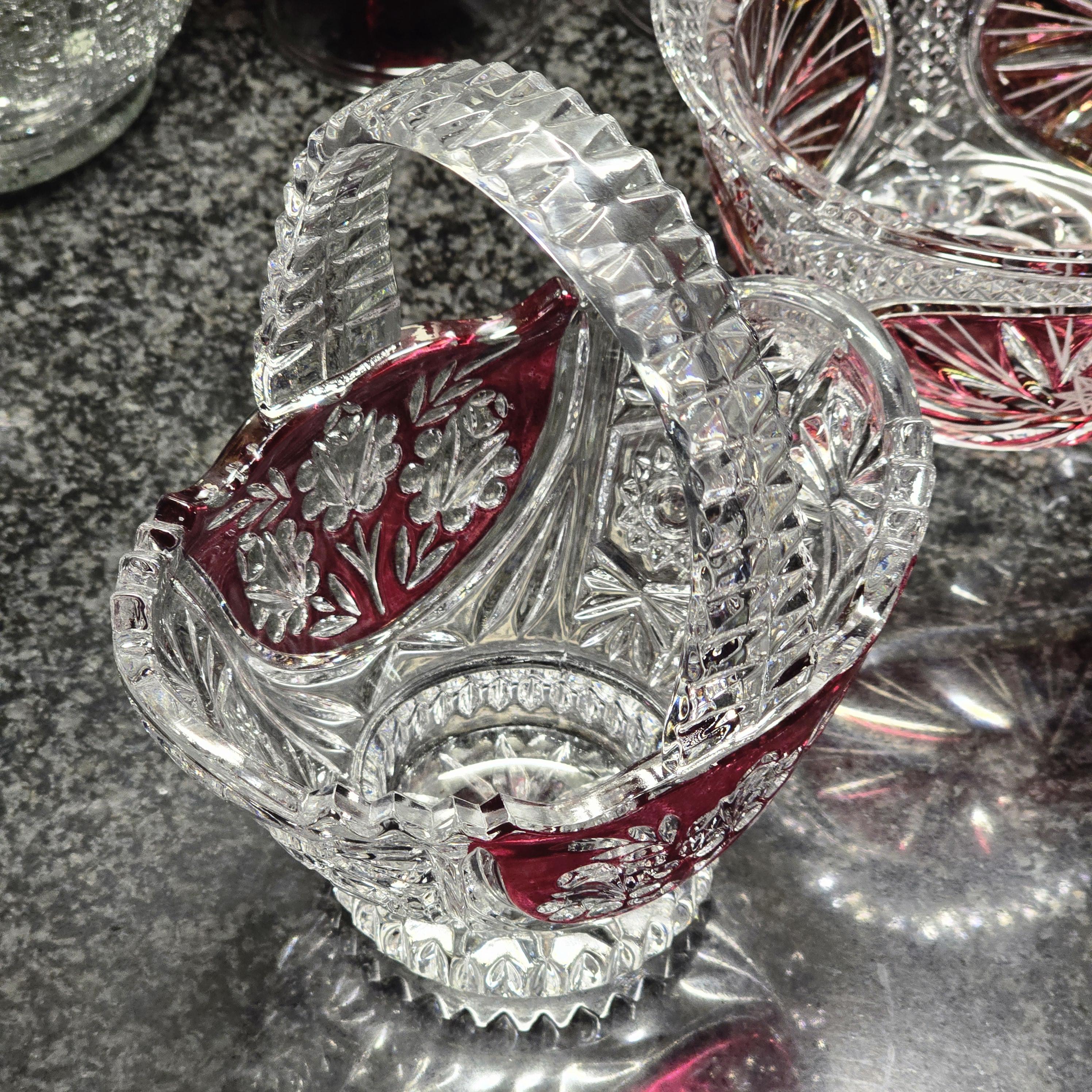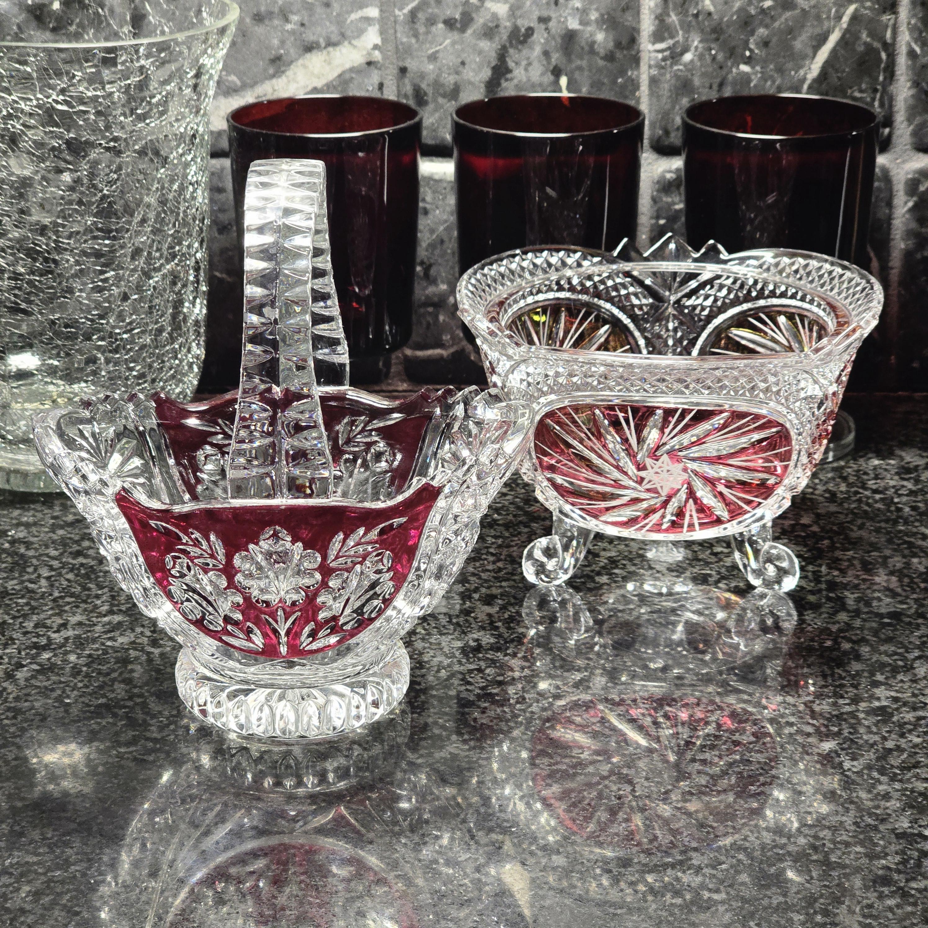 A coordinated pair of handcut crystal bowls, with the basket confirmed as Anna Hütte Bleikristall in the Oxford Rose Ruby pattern and the footed bowl likely from the same workshop based upon its shape, ruby overlay, and pinwheel cutting.