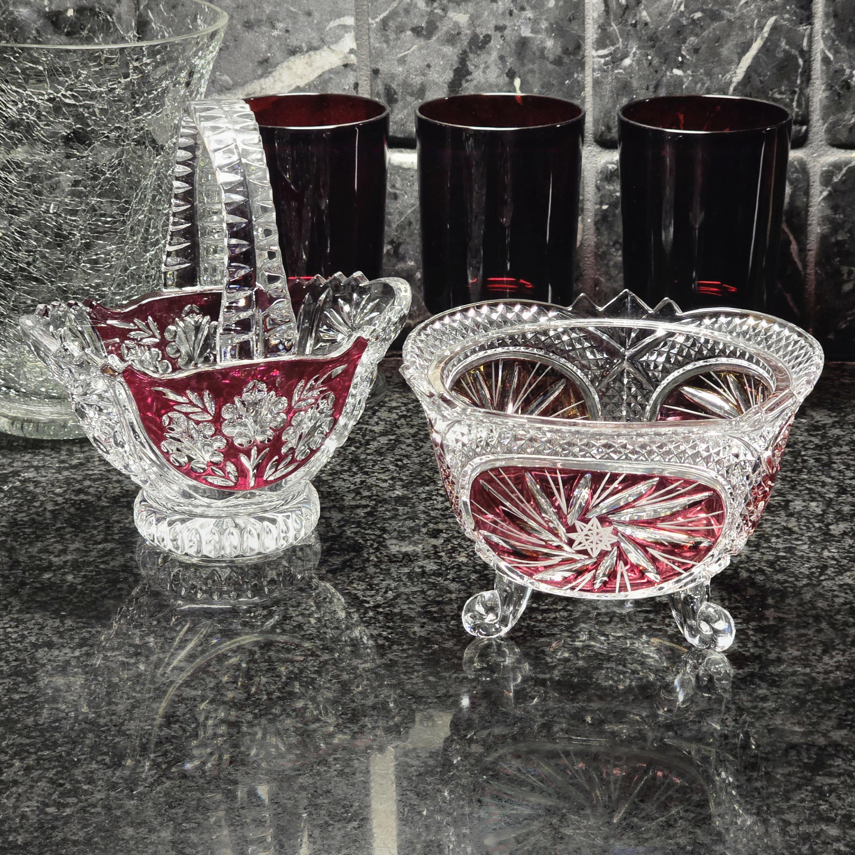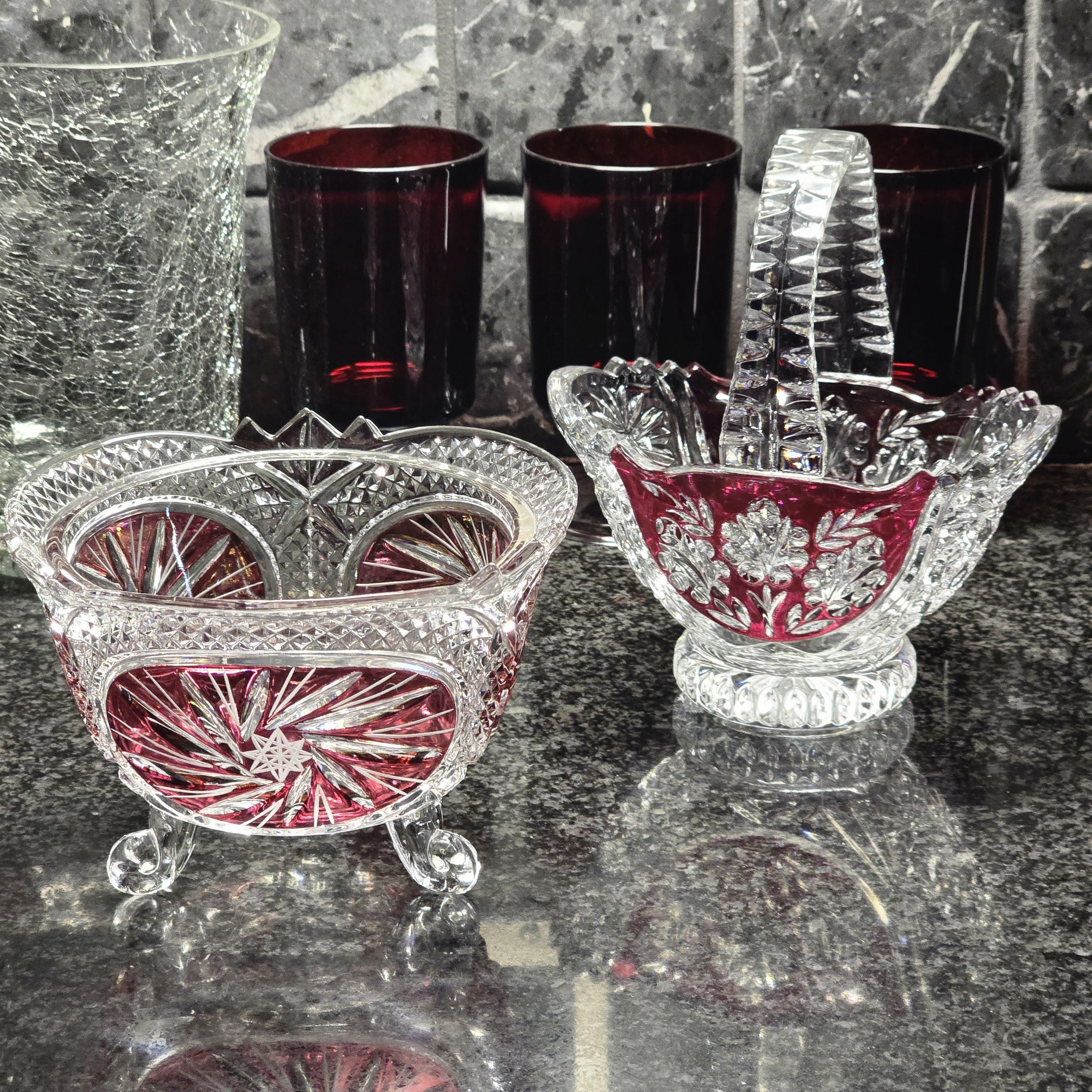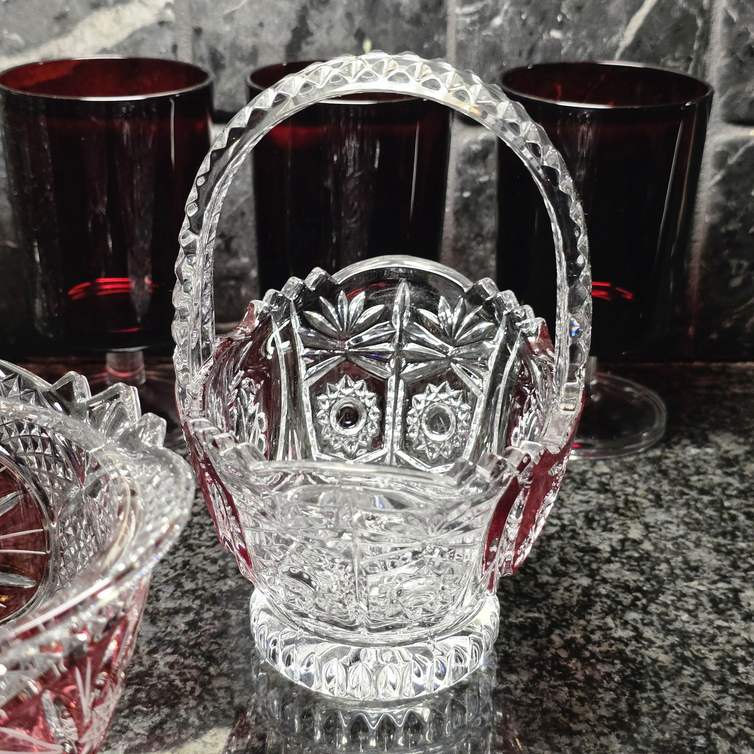 A coordinated pair of handcut crystal bowls, with the basket confirmed as Anna Hütte Bleikristall in the Oxford Rose Ruby pattern and the footed bowl likely from the same workshop based upon its shape, ruby overlay, and pinwheel cutting.