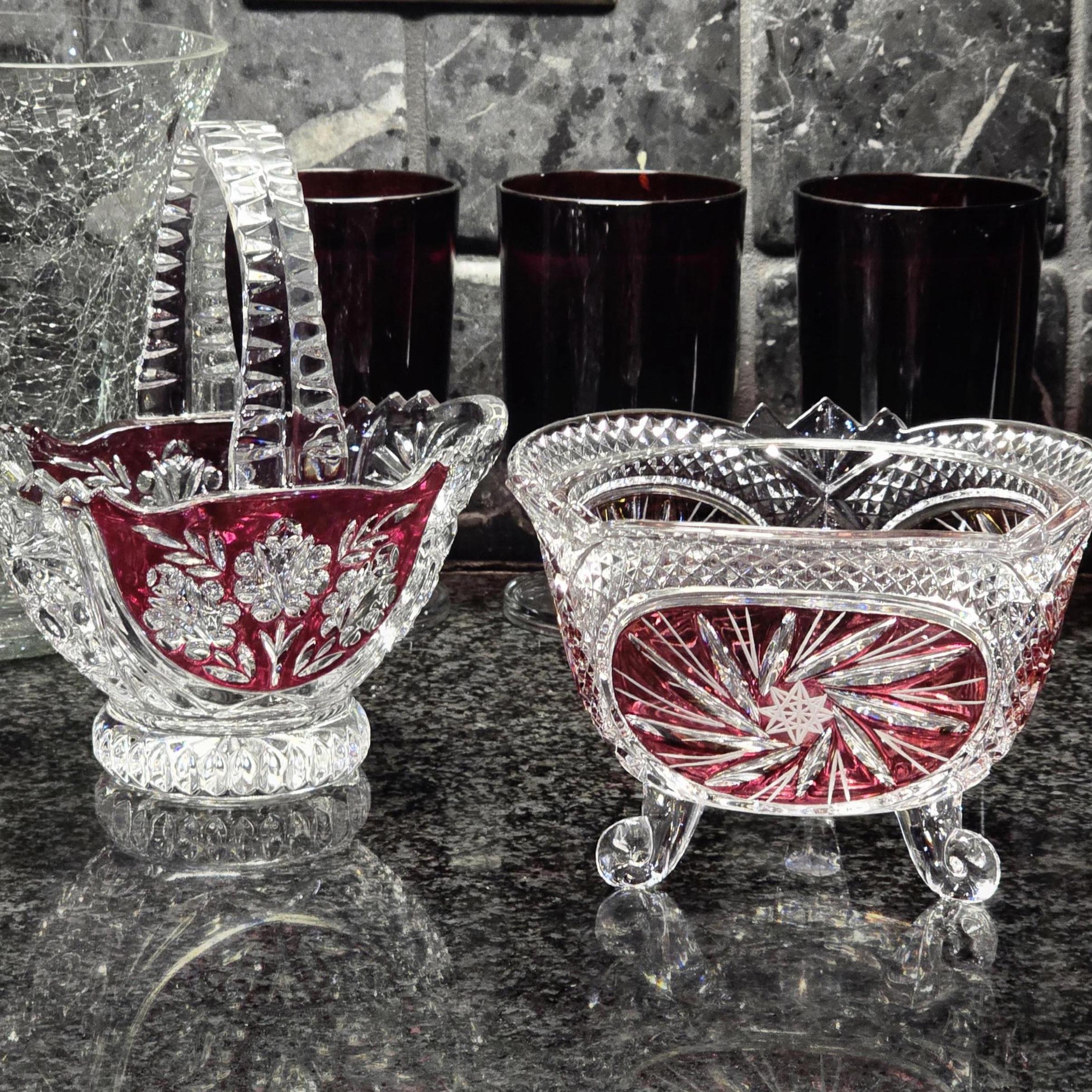 A striking pair of ruby-flash 24% lead crystal bowls ideal for holiday décor, styled on dining tables, sideboards, and display cabinets where rich jewel-tone colour creates brilliant displays.