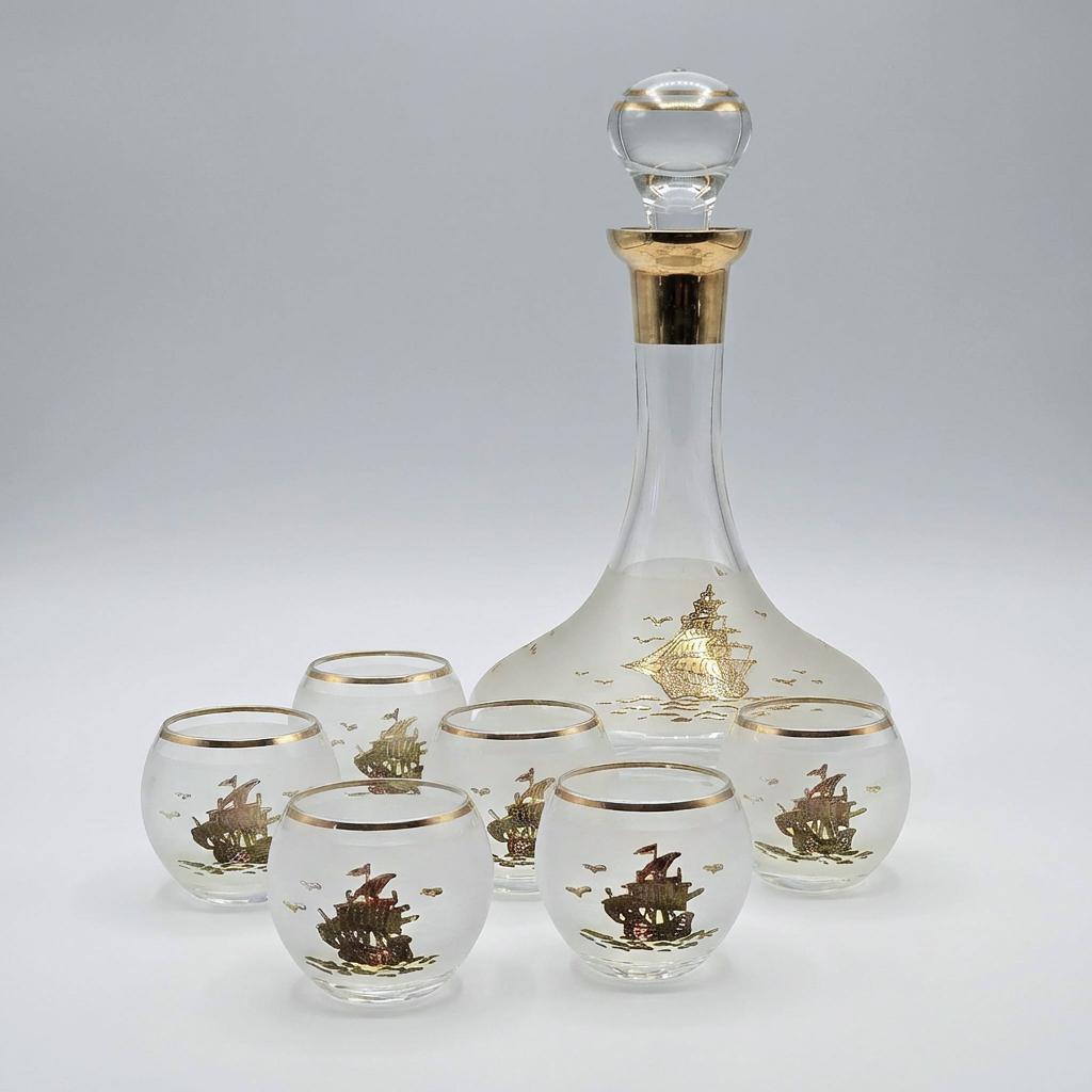 This eight piece decanter set showcases hand blown glass forms attributed to Bohemia Crystal, though its label was removed. Frosted satin bands and detailed gold galleon motifs reflect regional decorative traditions, while the sculptural decanter and rounded liqueur glasses highlight mid century design principles, creating an elegant and cohesive display of nautical themed barware.