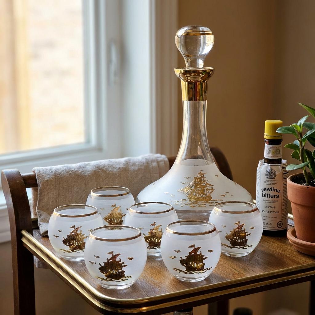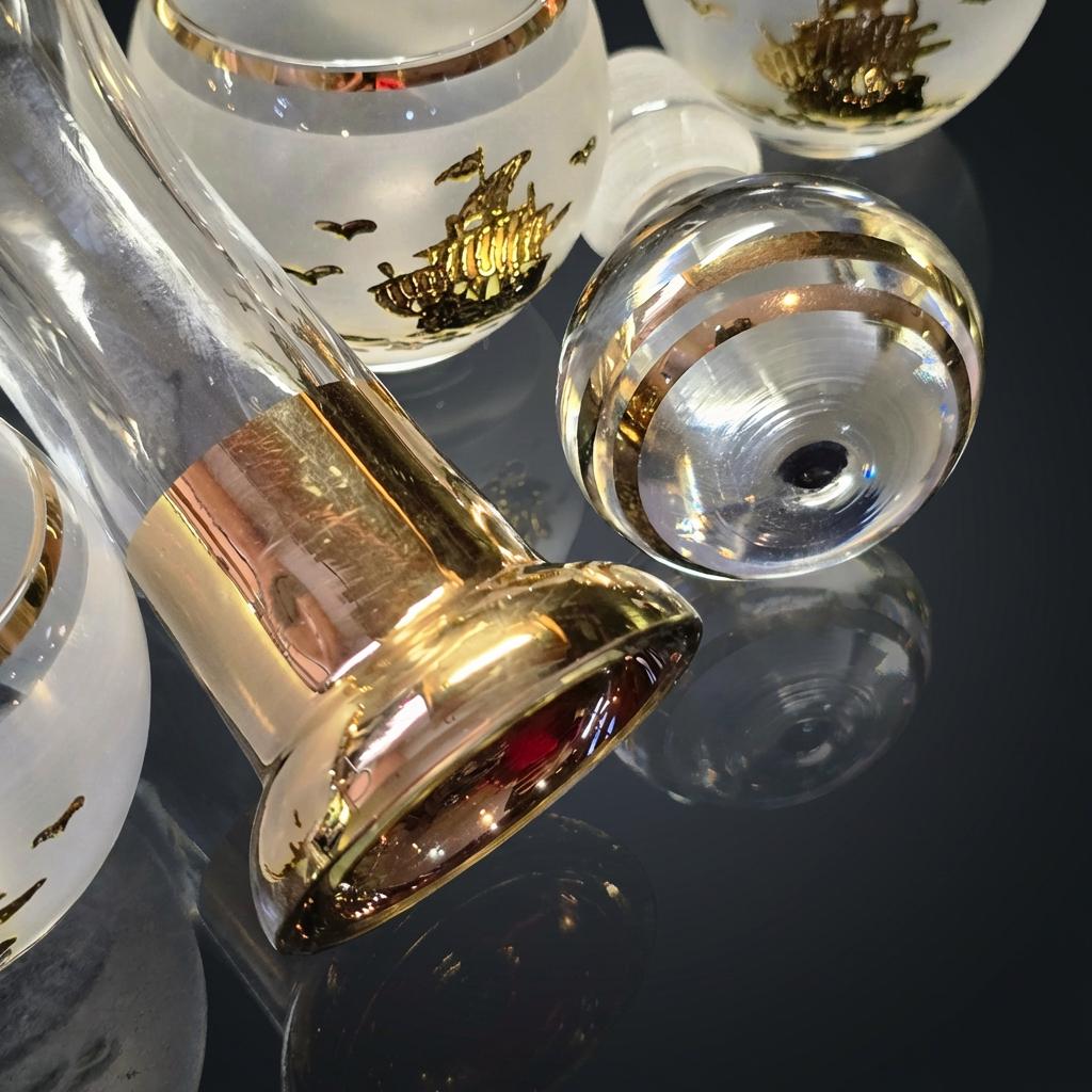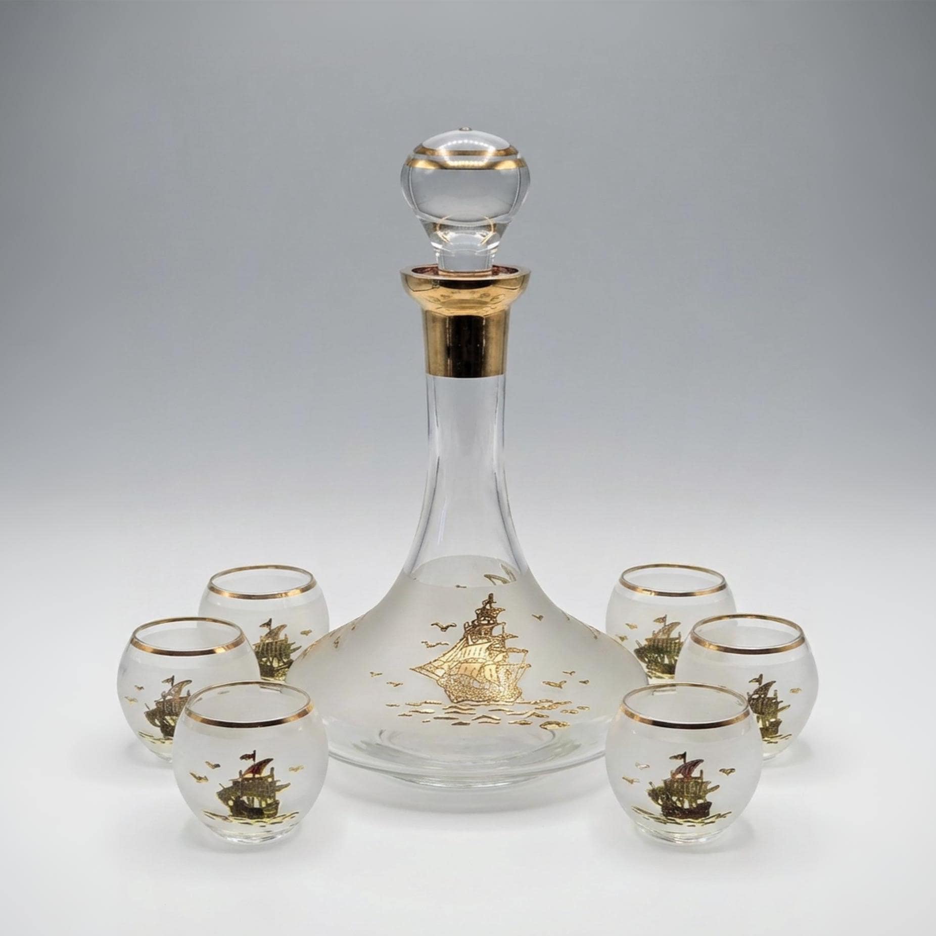 Mid Century Bohemian Tall Ship Decanter Set – 8 Piece Frosted Gold Enamel Glass