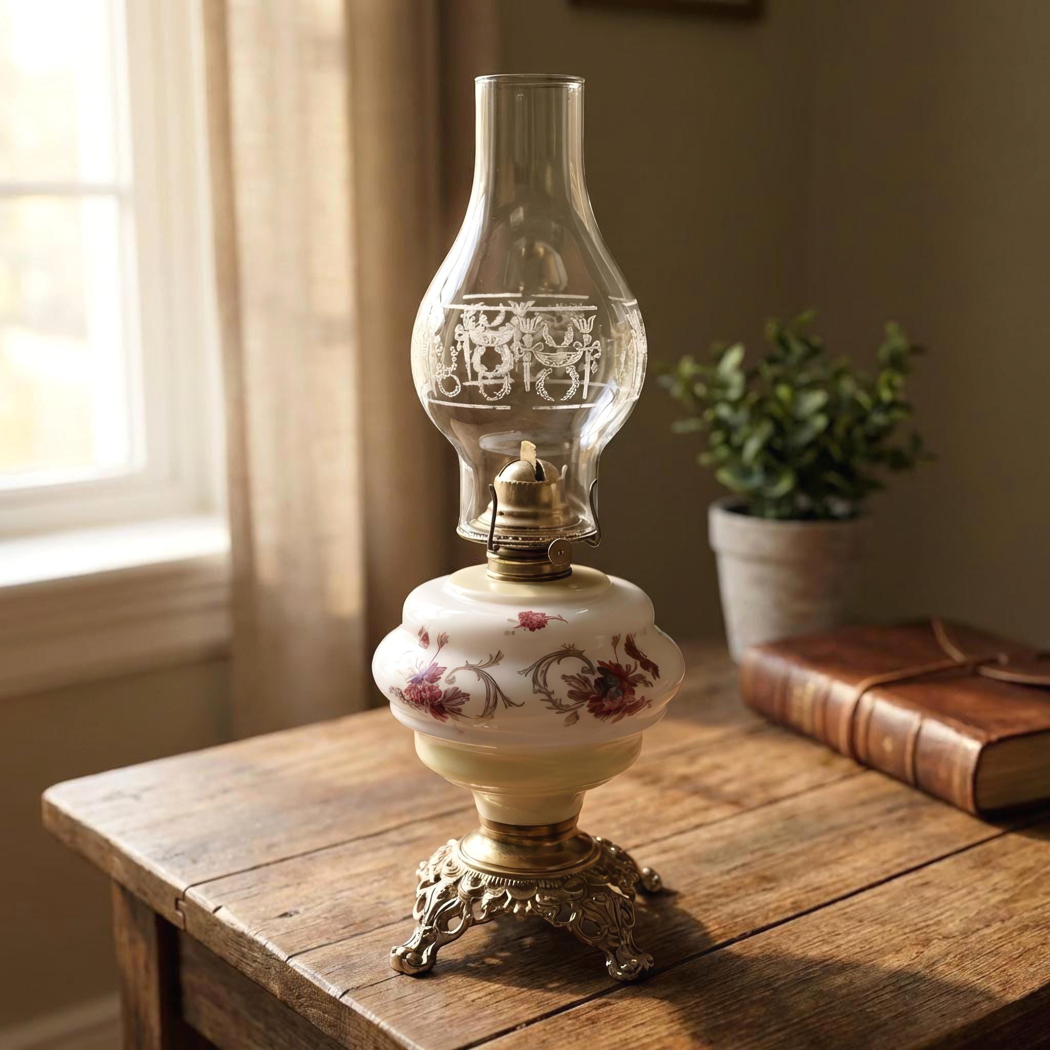 A lovingly restored early twentieth century oil lamp that echoes memories of years past. An ornate accent for mantles, sideboards, or cottage inspired interiors.