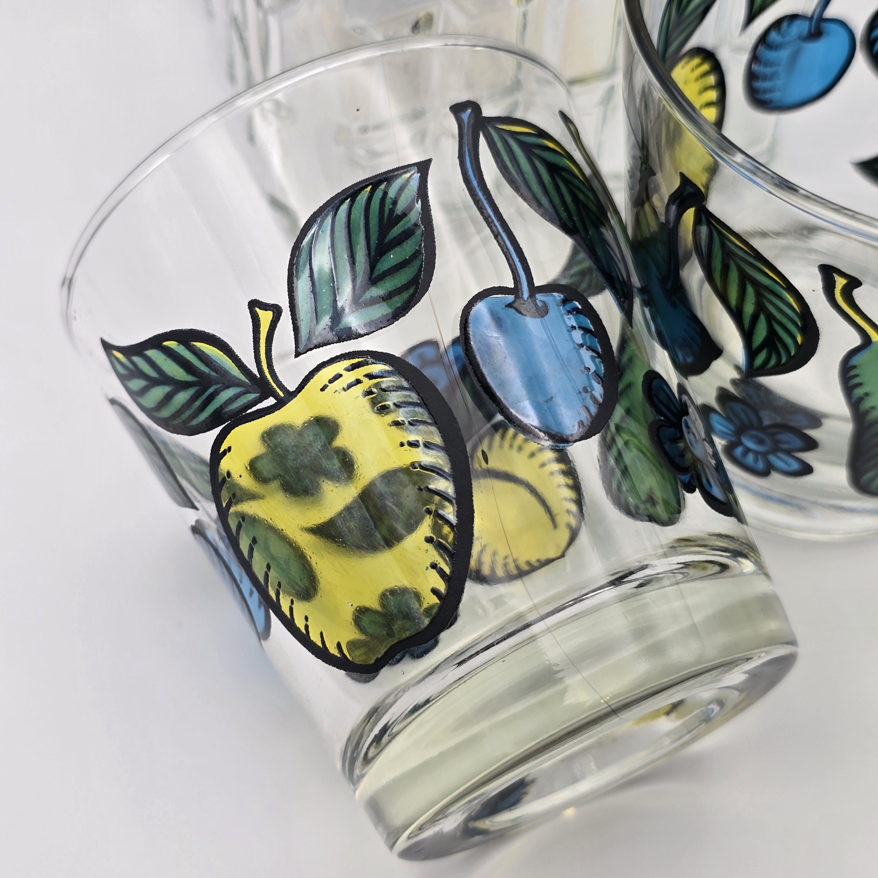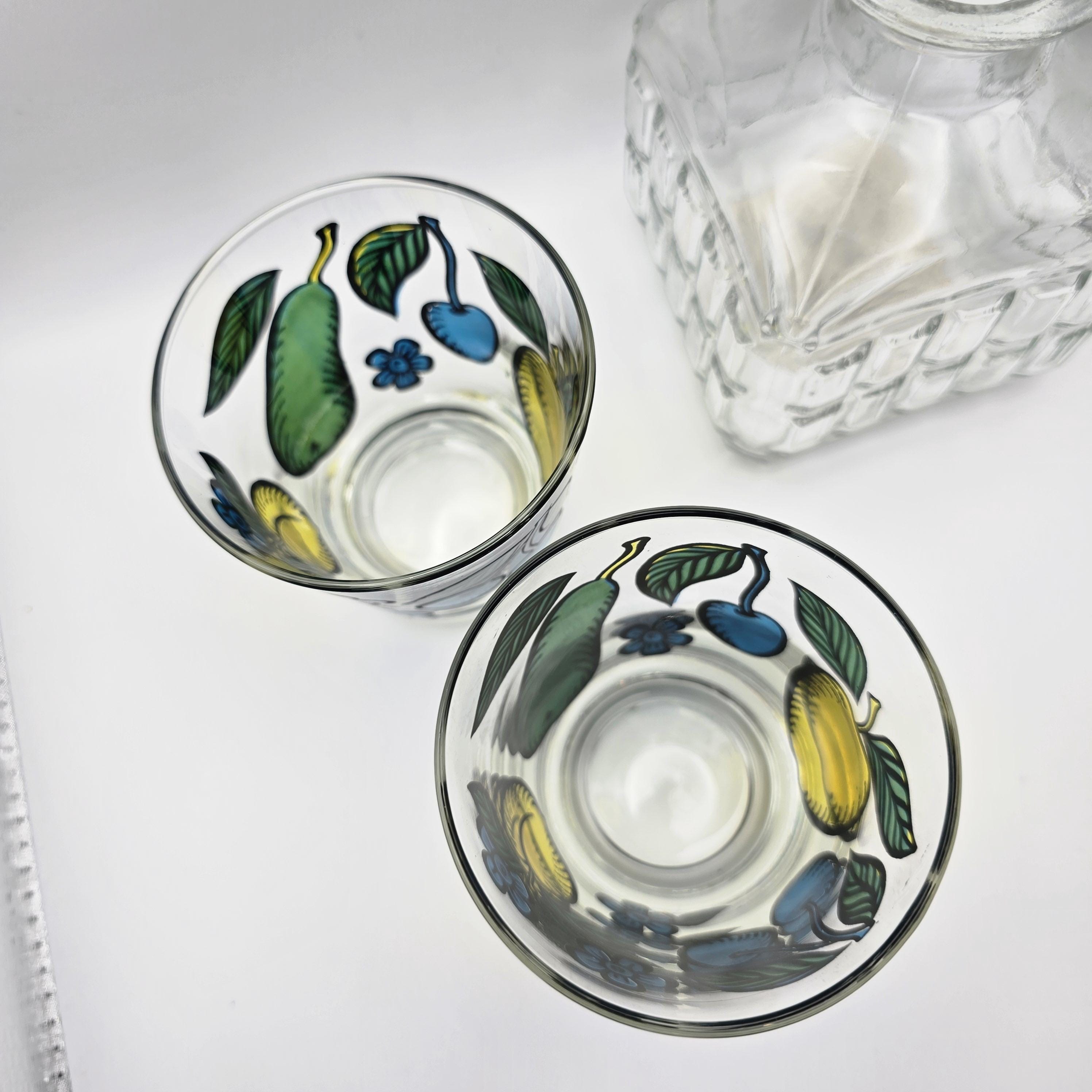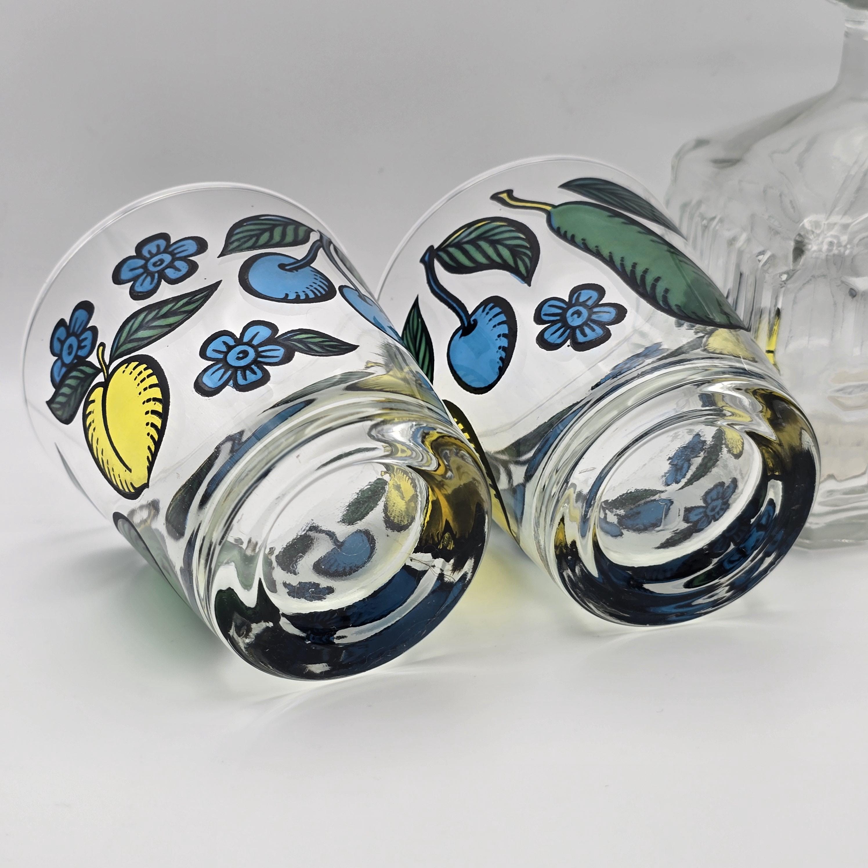 A cheerful pair of mid 20th century clear glass tumblers by Dominion Glass Company, hand painted with stylized fruit and floral motifs in saturated yellow, blue, and green tones, well suited for everyday drinks, casual bar service, or curated display.