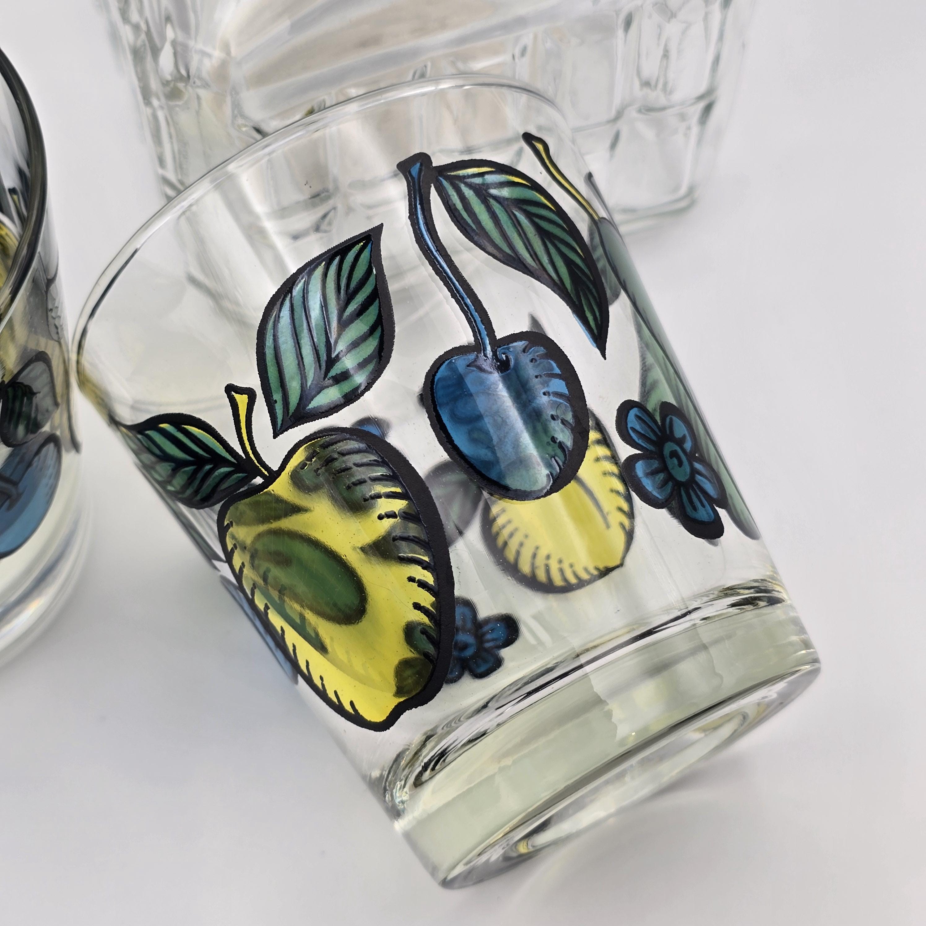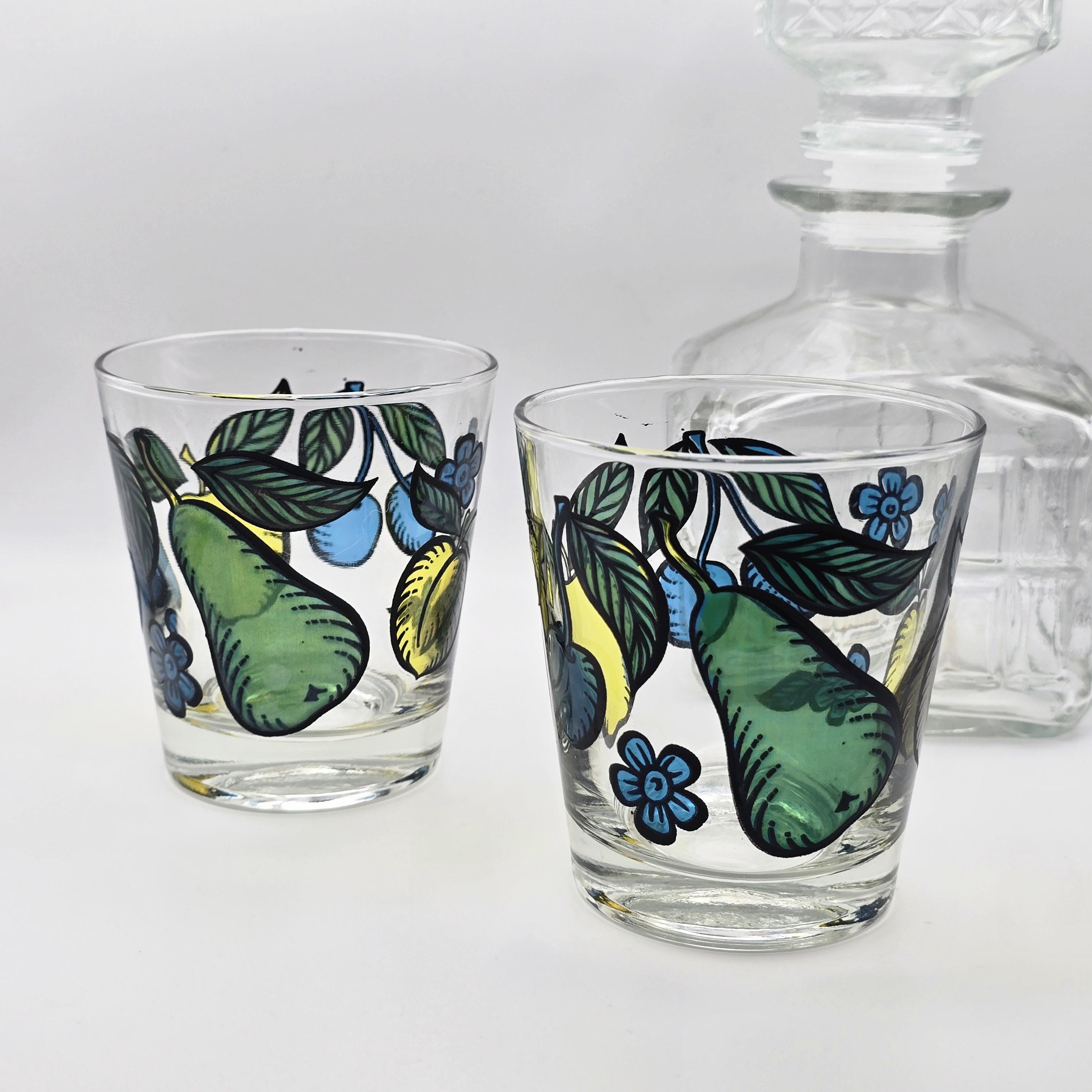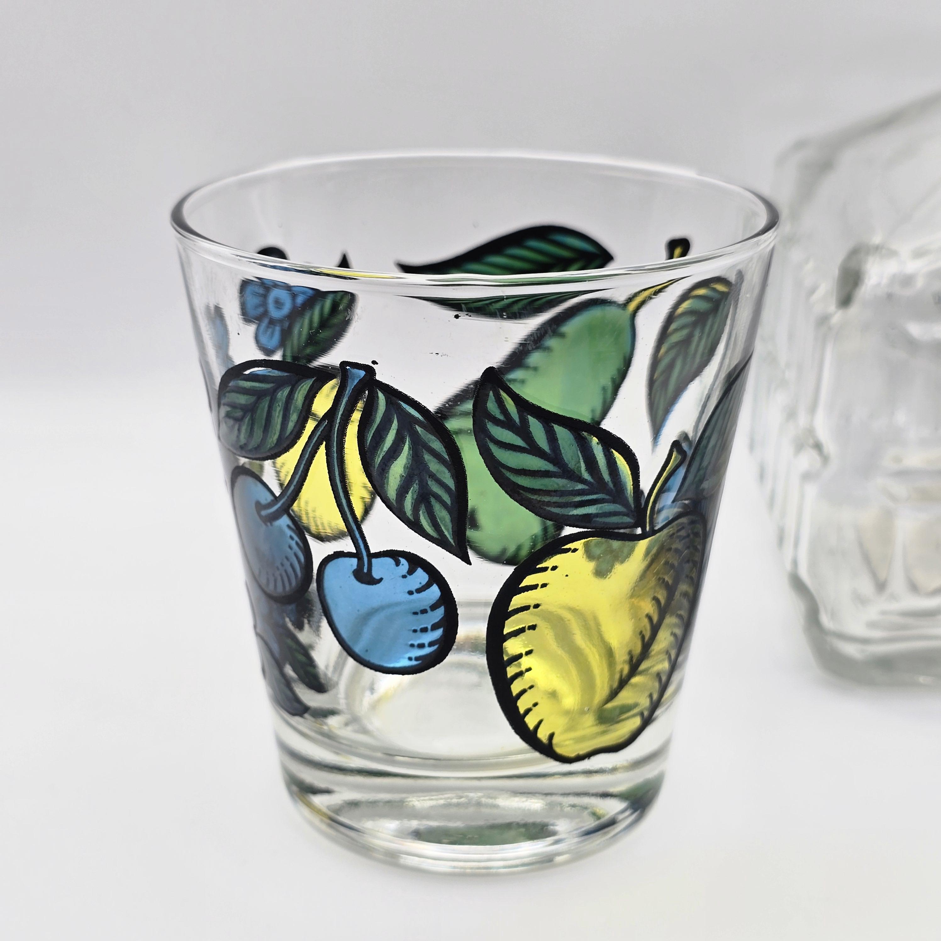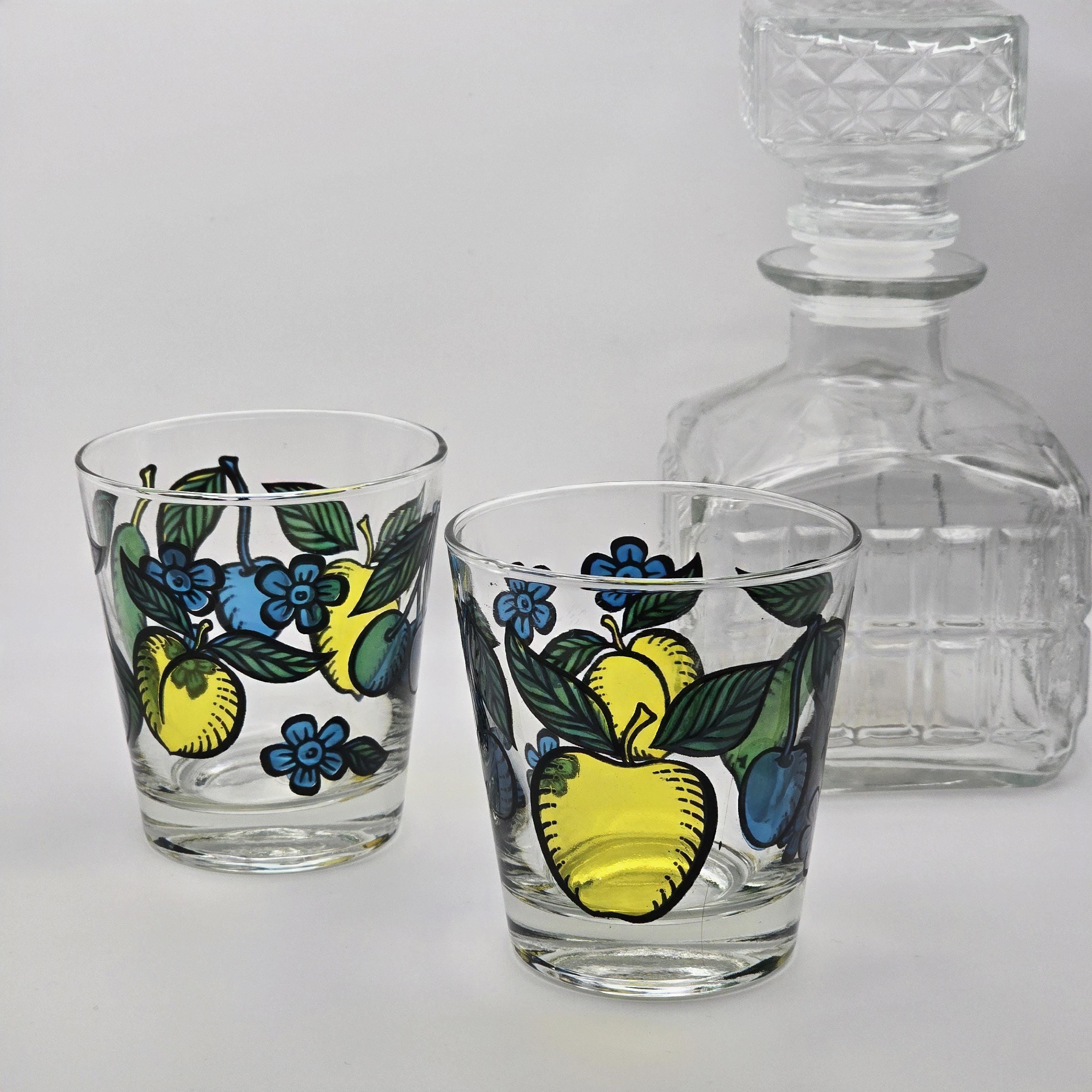 A cheerful pair of mid 20th century clear glass tumblers by Dominion Glass Company, hand painted with stylized fruit and floral motifs in saturated yellow, blue, and green tones, well suited for everyday drinks, casual bar service, or curated display.
