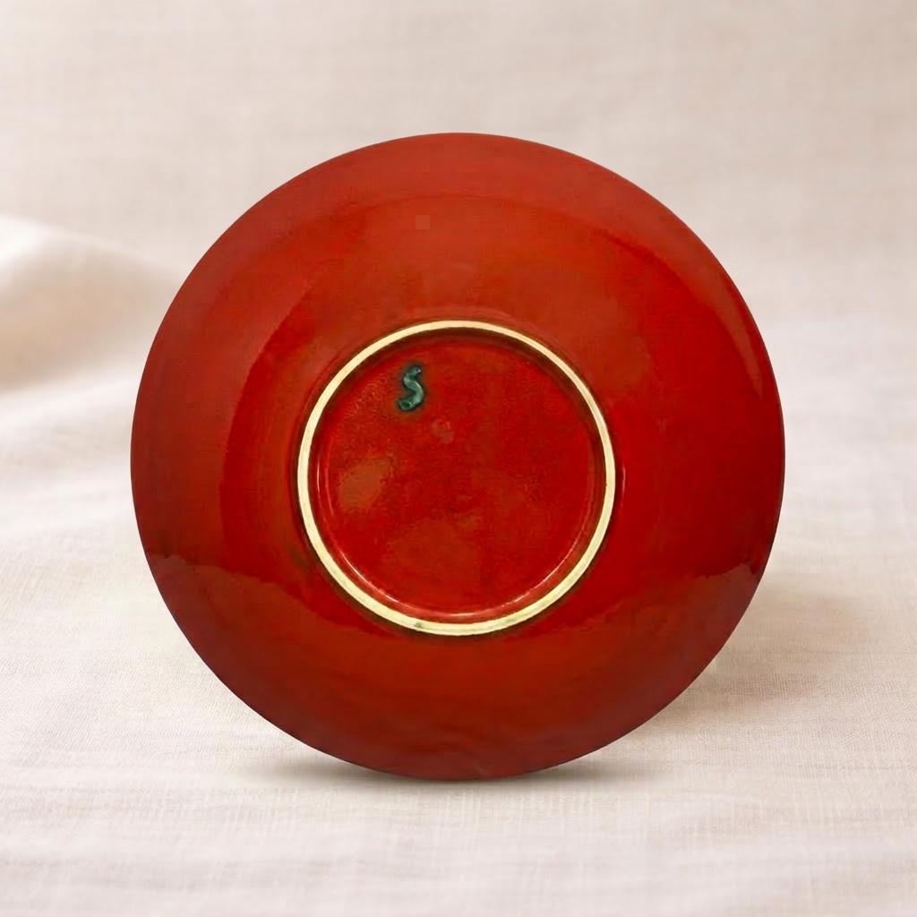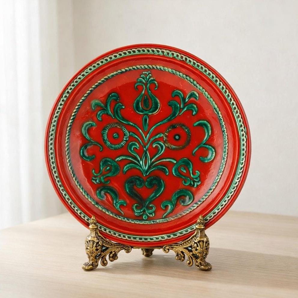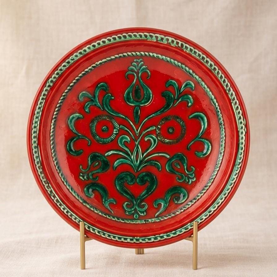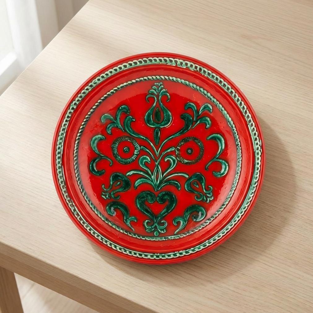 A striking Vintage Gmundner Keramik wall plate from Austria, crafted in the Mid 20th century. This 13 inch decorative bowl features a vivid red glaze accented with raised emerald green folk inspired scrollwork and heart motifs, finished with a dimensional rope border. The glossy glaze and bold contrast create a dramatic, sculptural presence ideal for wall display. This piece makes a bold statement in a gallery wall arrangement, above a console, or layered into a European inspired interior.