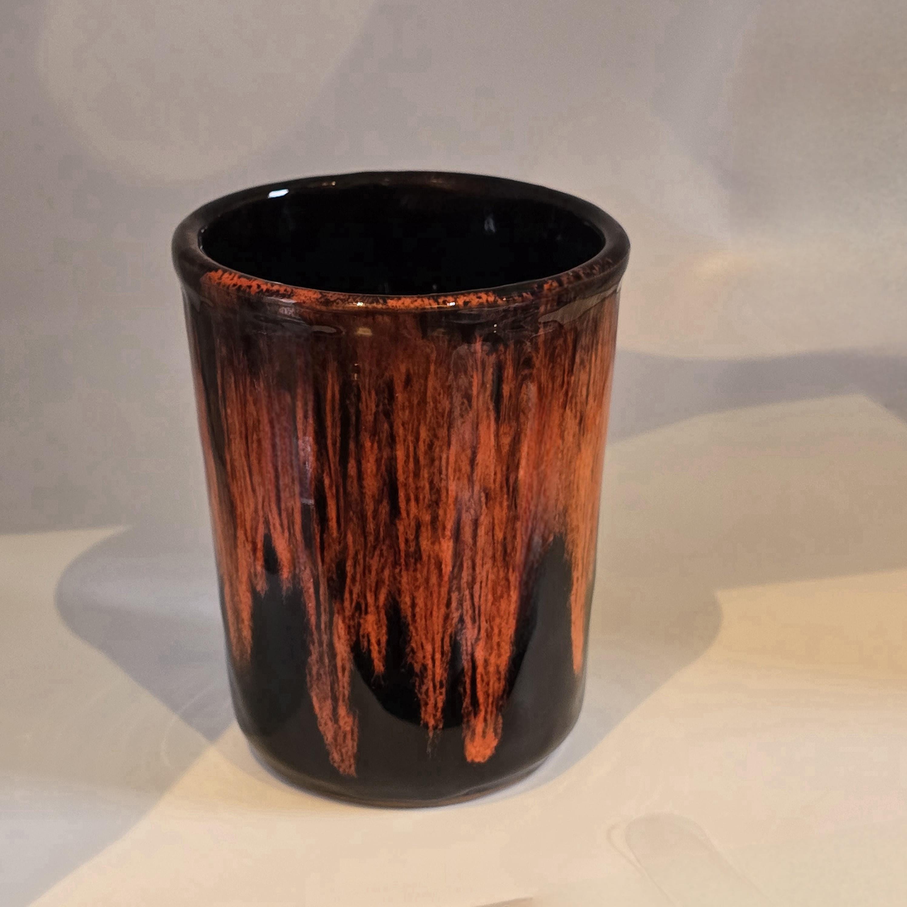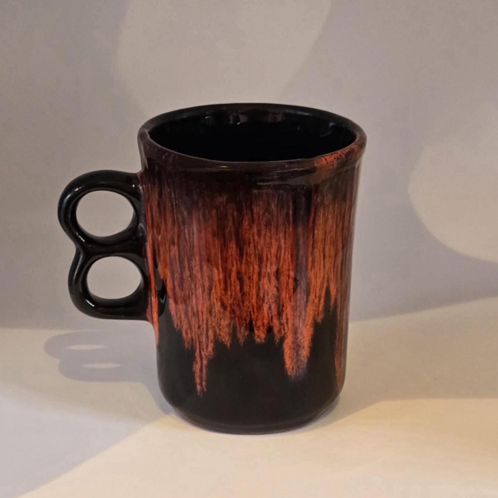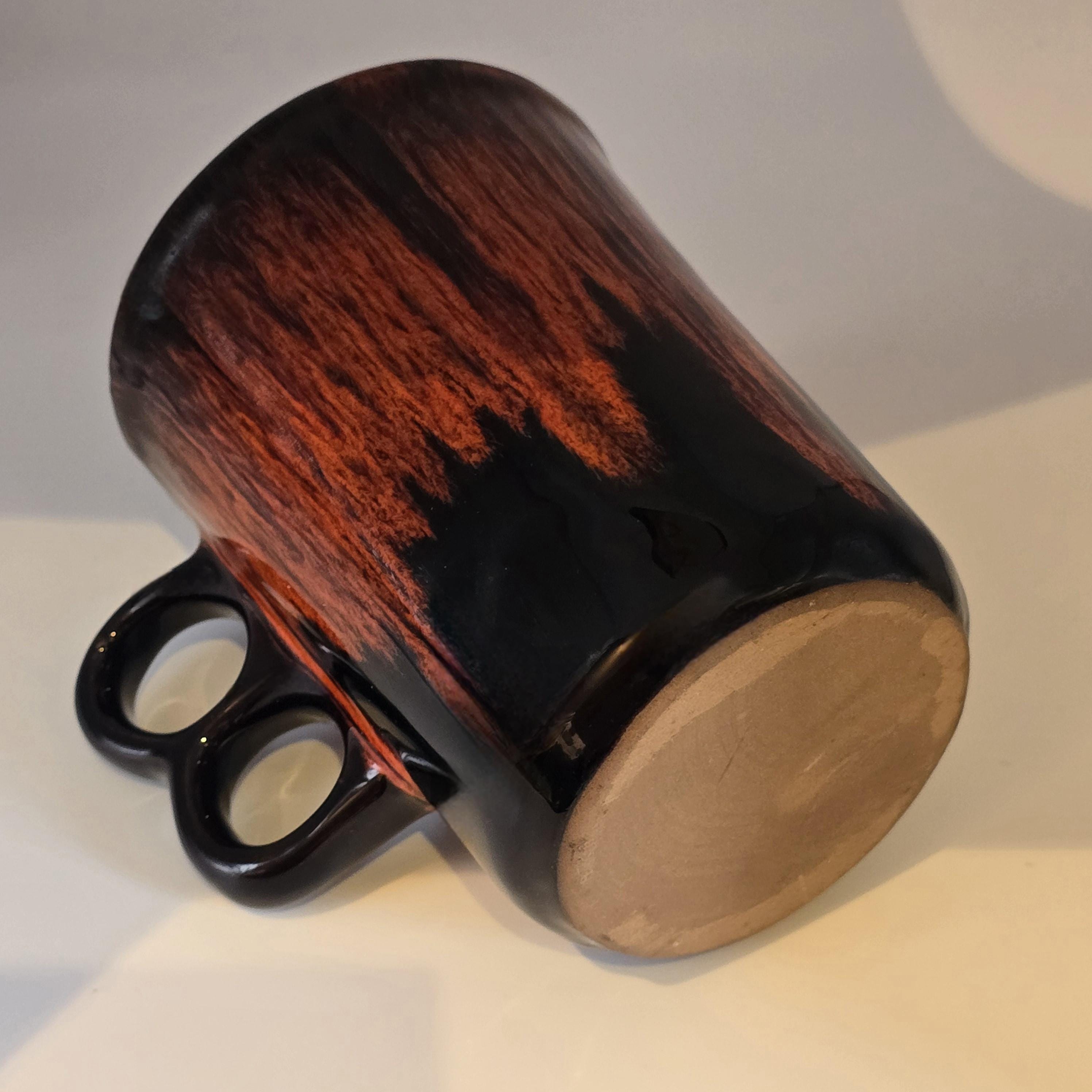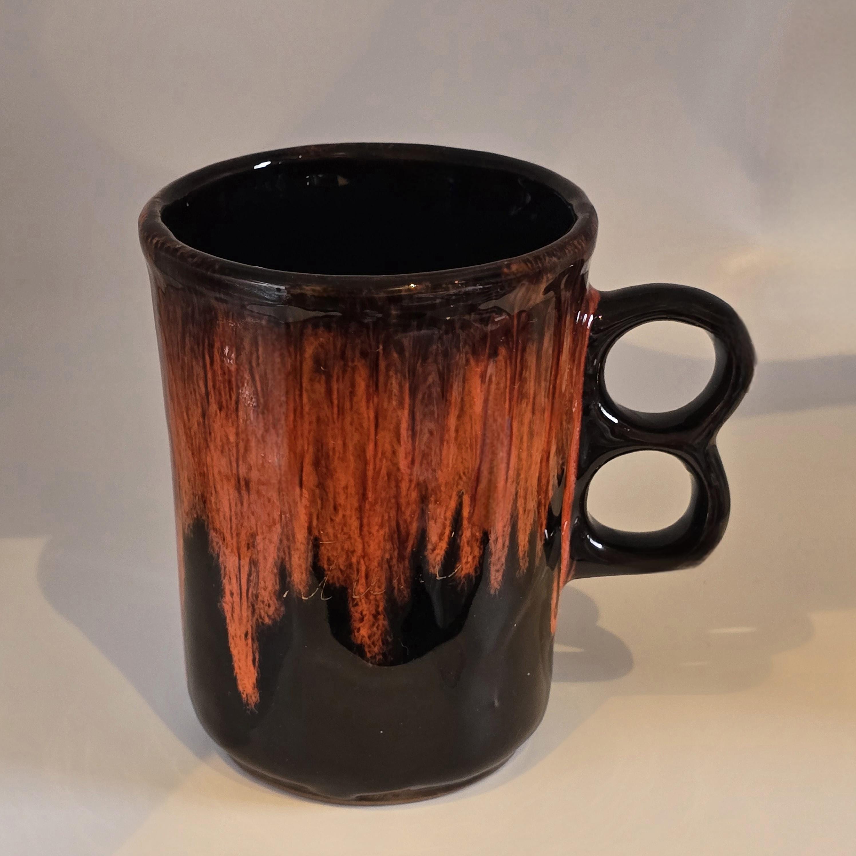 A bold mid century Canadian ceramic mug paired with a coordinating Royal Canadian Art Pottery sugar bowl in rich oxblood red cascading over deep black glaze. Sculptural and expressive, the duo adds depth and contrast to a morning coffee ritual, styled kitchen shelf, or curated tabletop display.