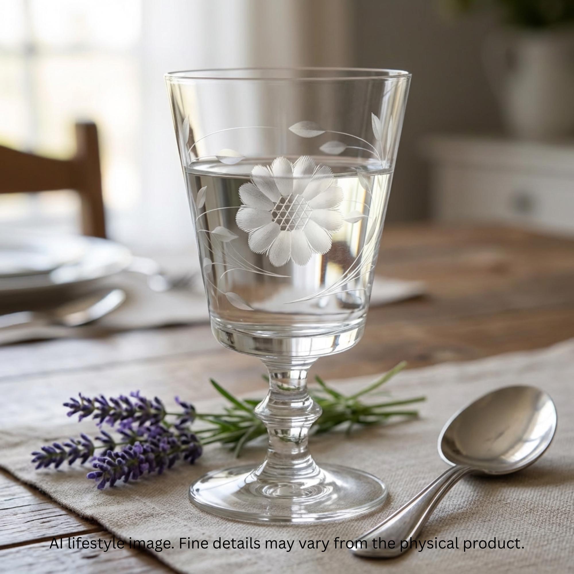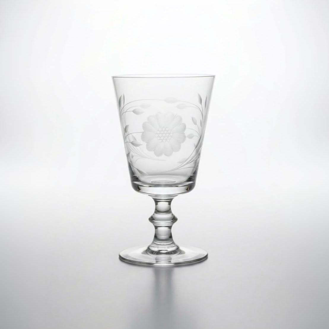 A vintage Hughes Cornflower etched water goblet with distinctive wafer stem. Finely hand etched florals bloom across luminous clear crystal, creating graceful balance and refined proportion. Perfect for intimate gatherings, heirloom inspired table settings, or elevating a traditional bar with historic Canadian charm.