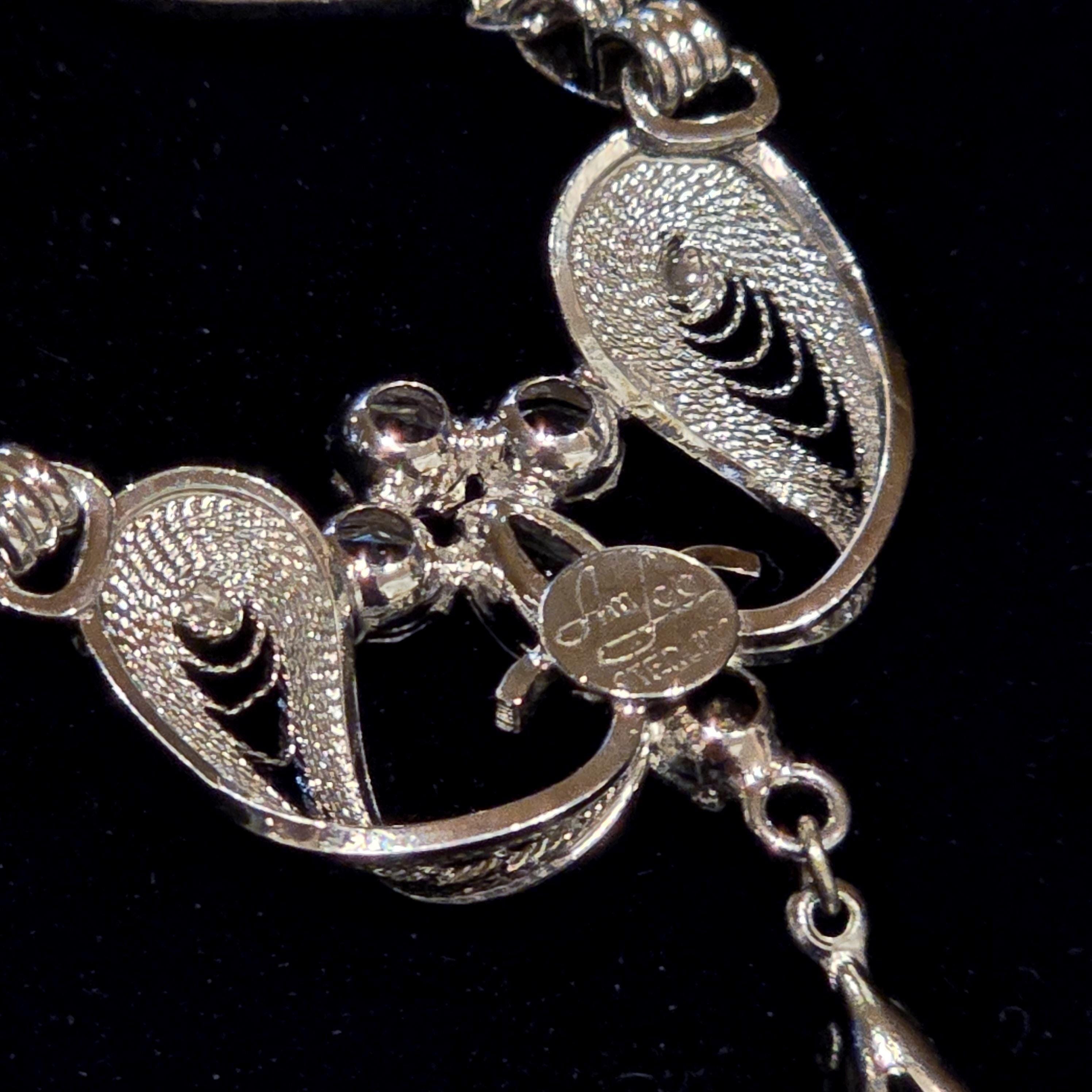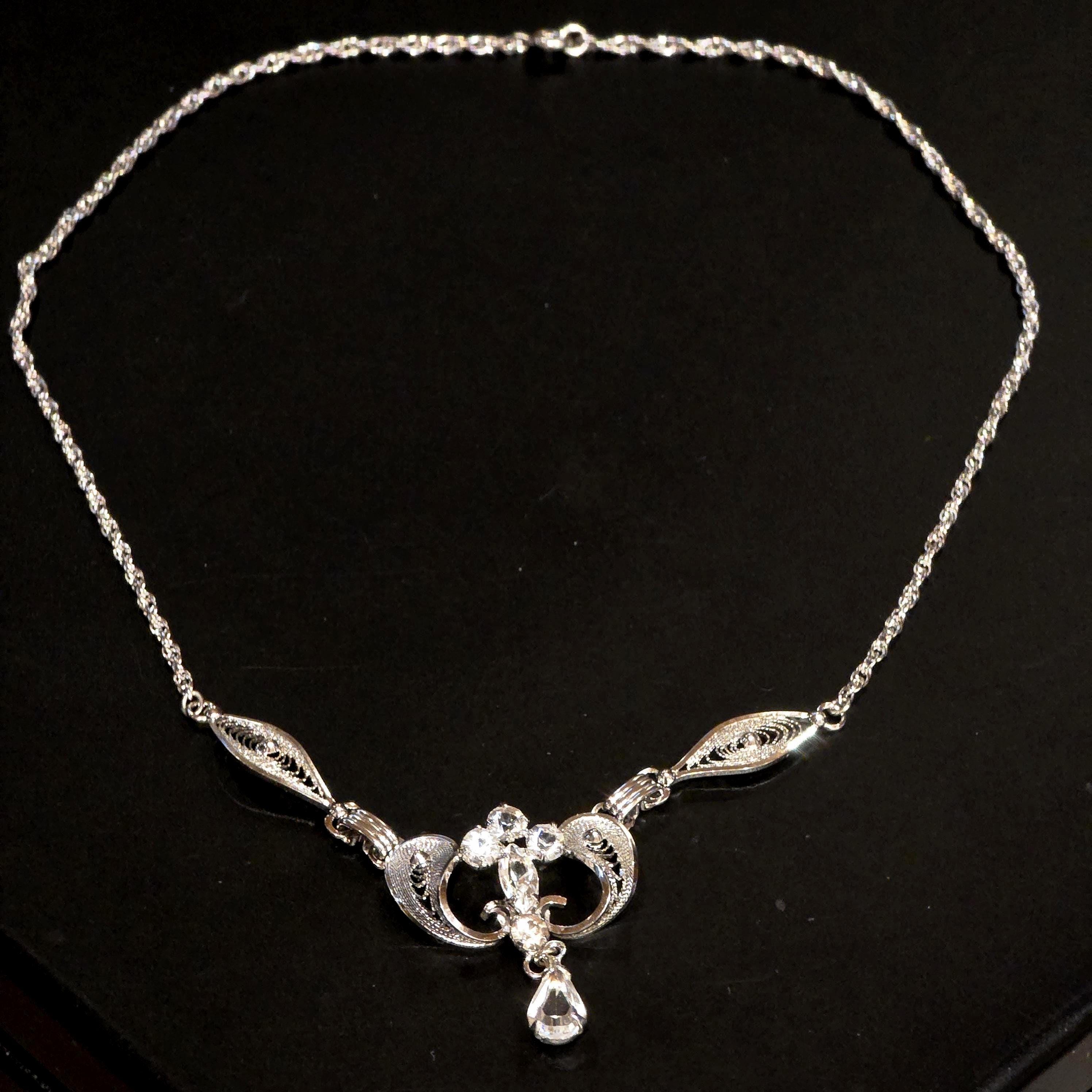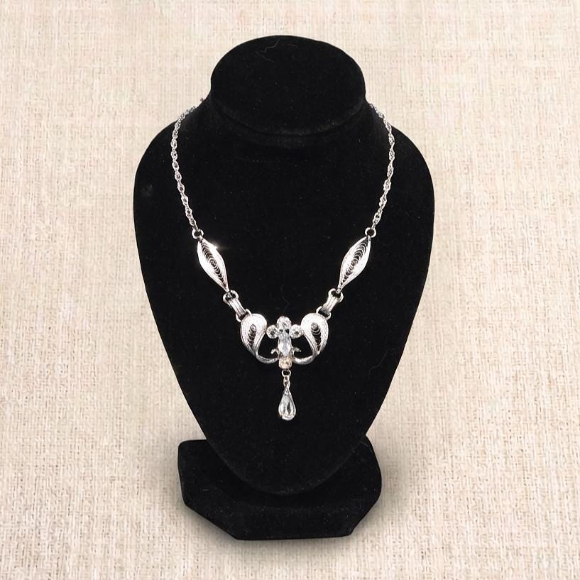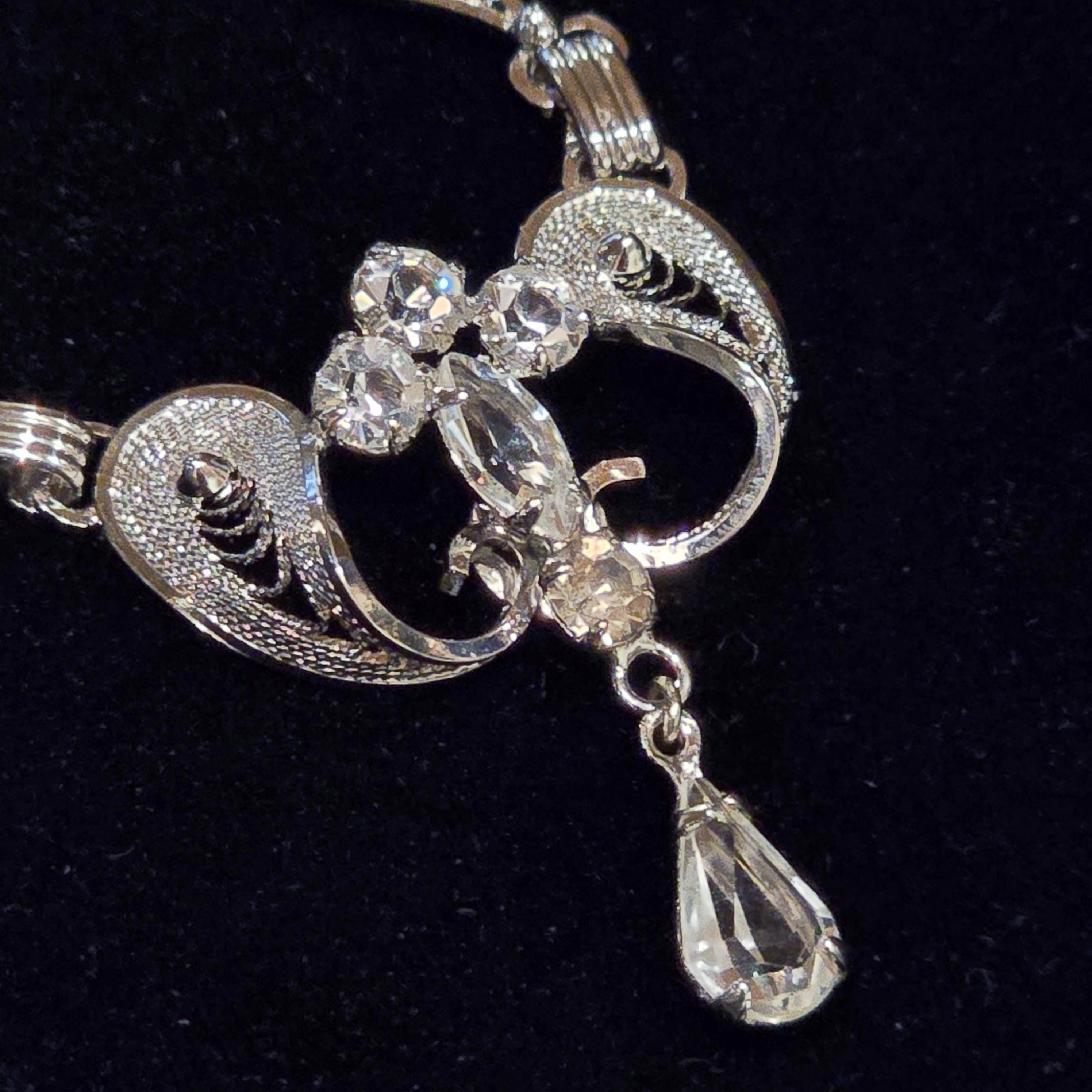 A vintage sterling silver rhinestone necklace by Am Lee, featuring graceful scrollwork panels accented with sparkling clear stones and a marquise center. An articulated teardrop dangle adds refined movement, creating an elegant statement piece ideal for evening wear, bridal styling, or timeless vintage inspired occasions.