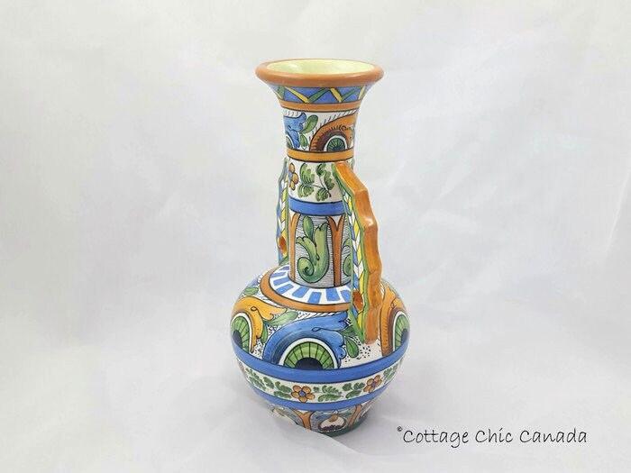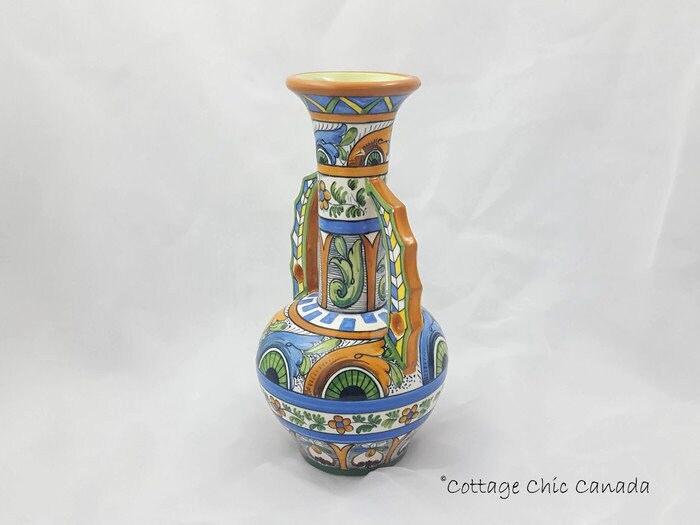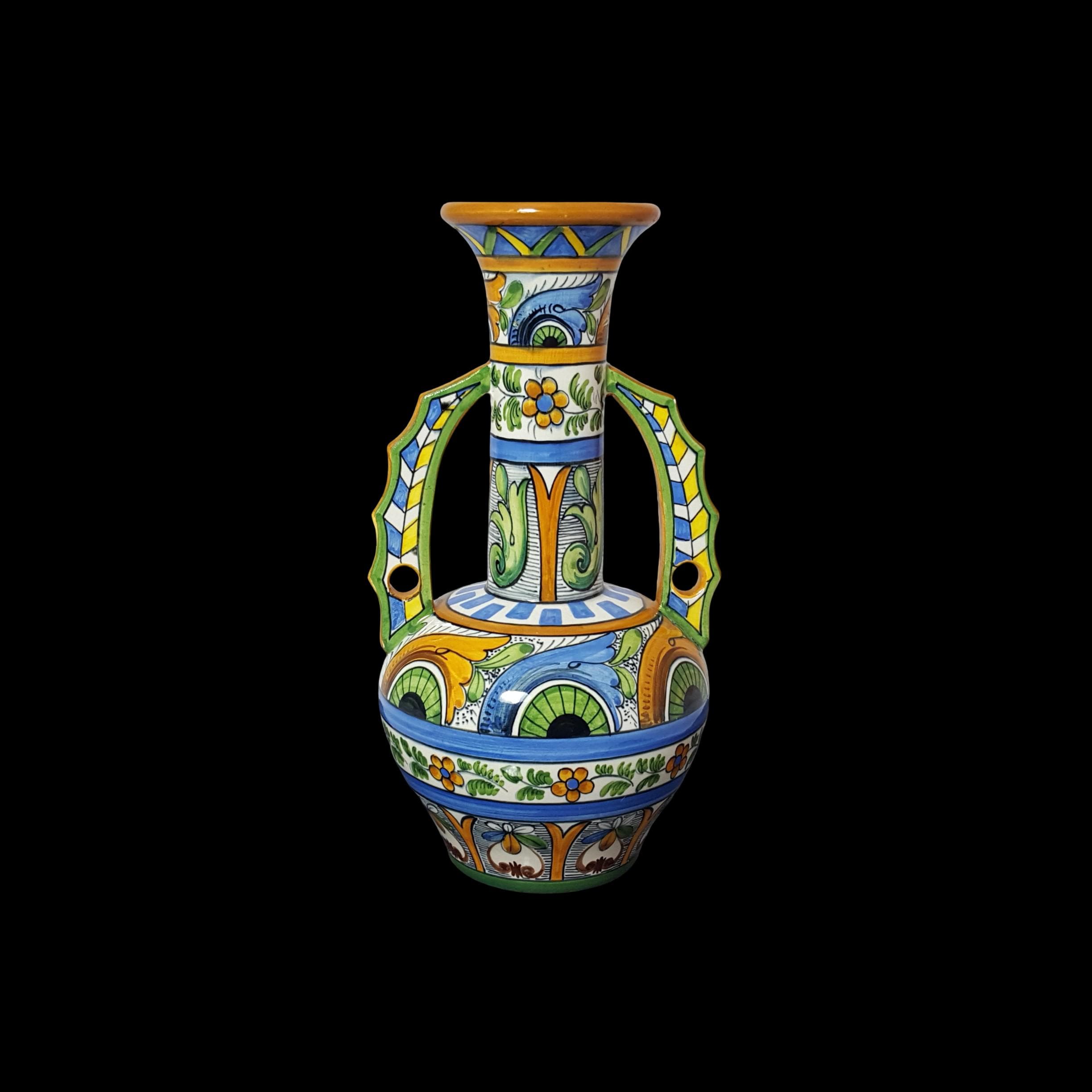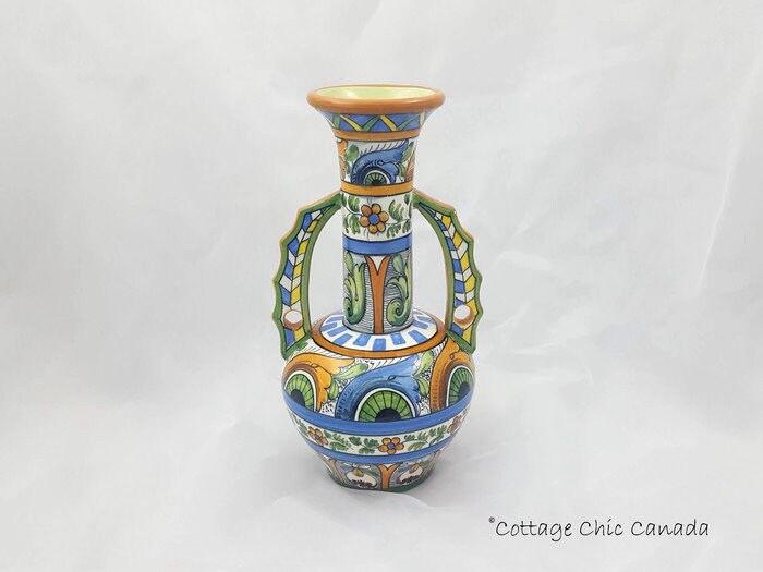 A hand painted Deruta majolica vase by the SACA studio featuring stylized florals, vibrant colourwork, and a sculptural open handled form. Ideal for display on shelves, consoles, or curated ceramic groupings where colour, pattern, and Italian craftsmanship create visual impact.