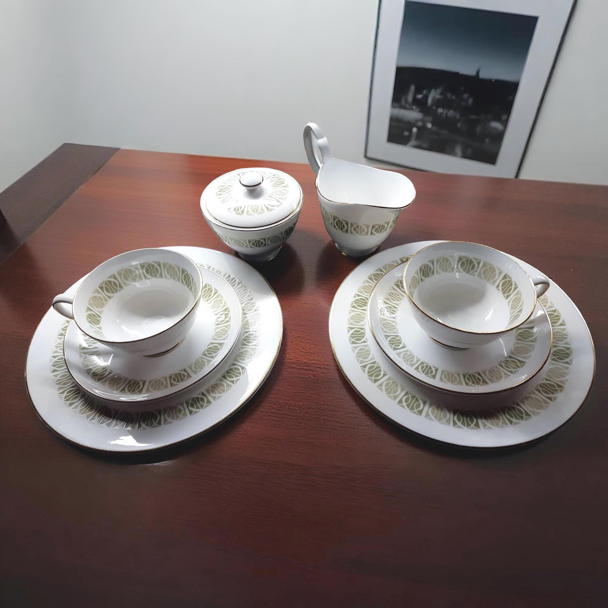 A mid-century tea service for six in the Contessa pattern, featuring a white ivory base with a pale green geometric leaf border and gold trim. The design reflects the balanced form, smooth glaze, fine translucence, and craftsmanship characteristic of Tuscan’s mid-century bone china.