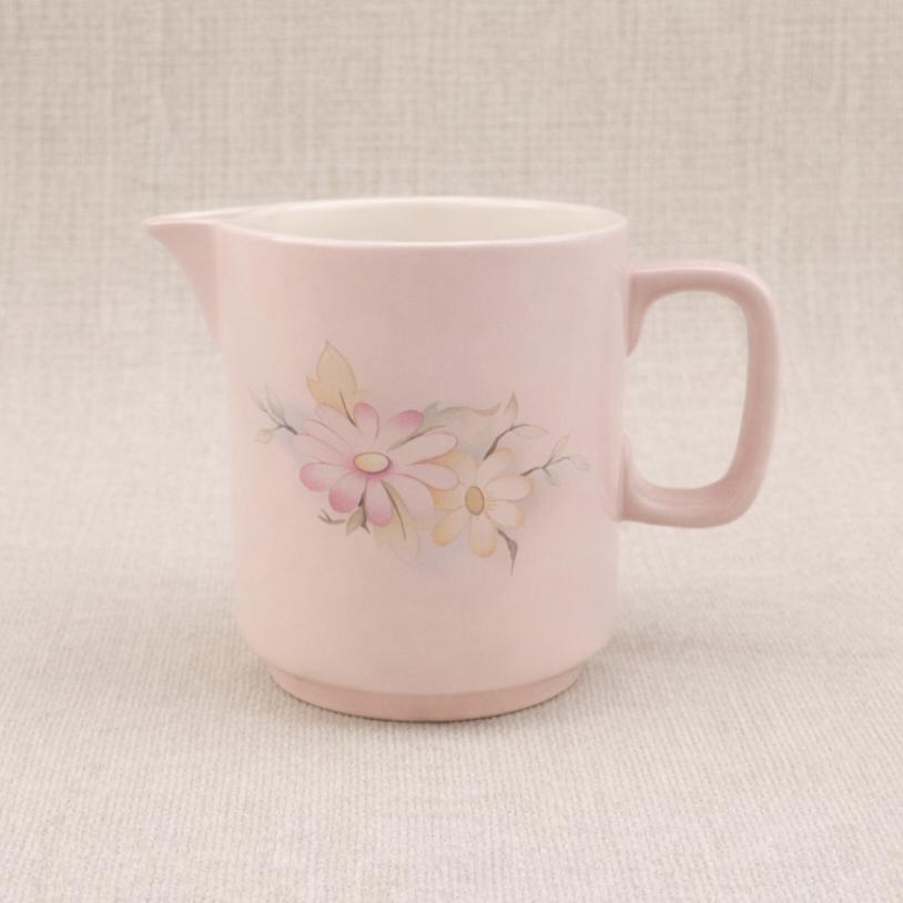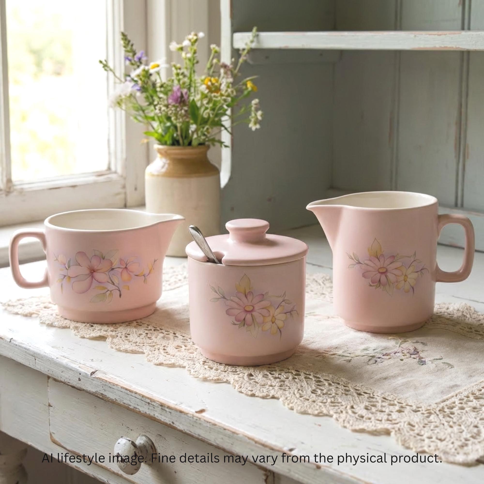 A vintage Hornsea Pottery tea service set in soft pastel pink matte glaze with delicate floral detailing. This charming trio includes a creamer, milk jug, and lidded sugar bowl, perfect for serving tea or coffee or displaying in a cottage style kitchen.