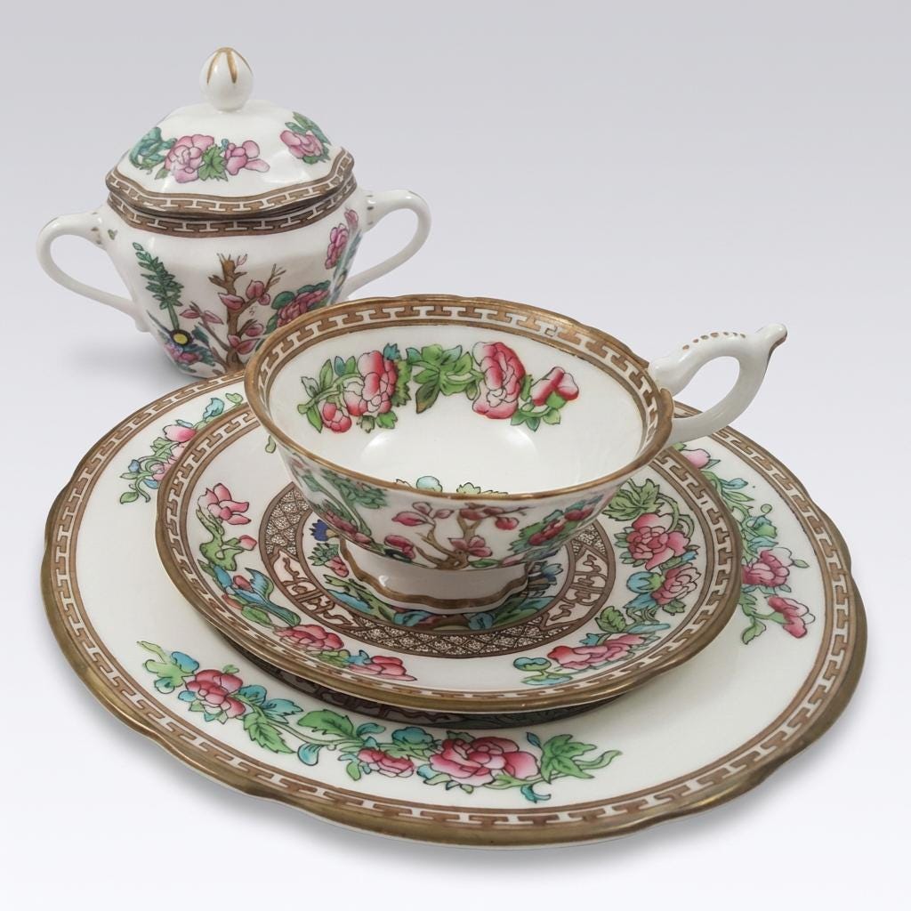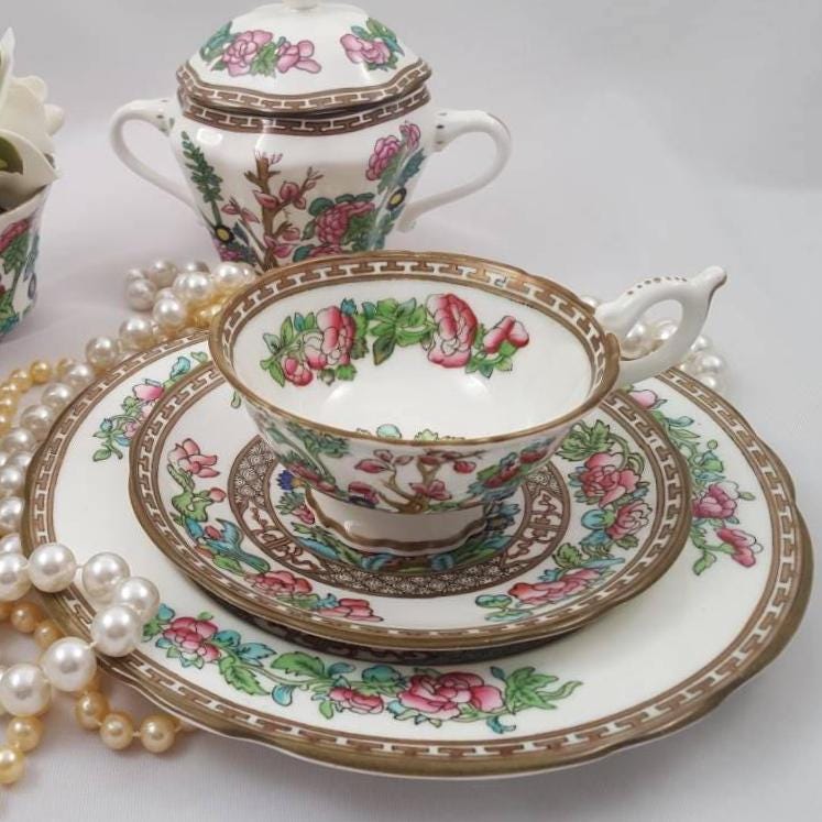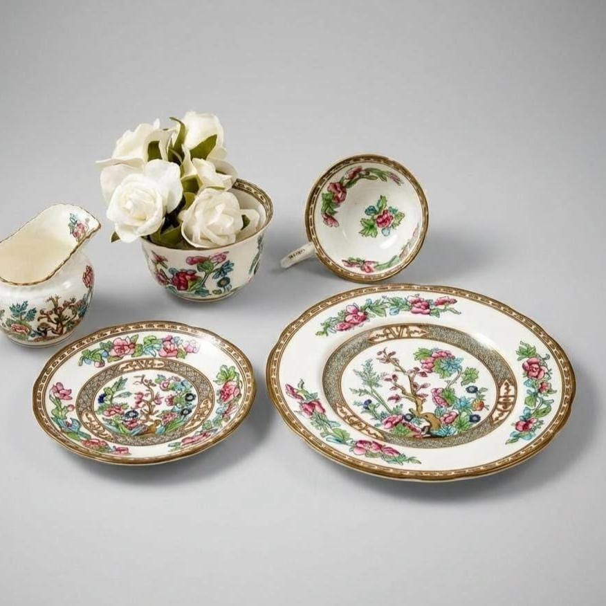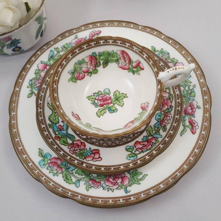 A vintage Coalport Indian Tree tea trio in fine English bone china, comprising a footed teacup, matching saucer, and coordinating salad plate. Decorated in the iconic polychrome floral motif with pink petal tree and gilt accented trim, this elegant set serves beautifully for afternoon tea or refined display.