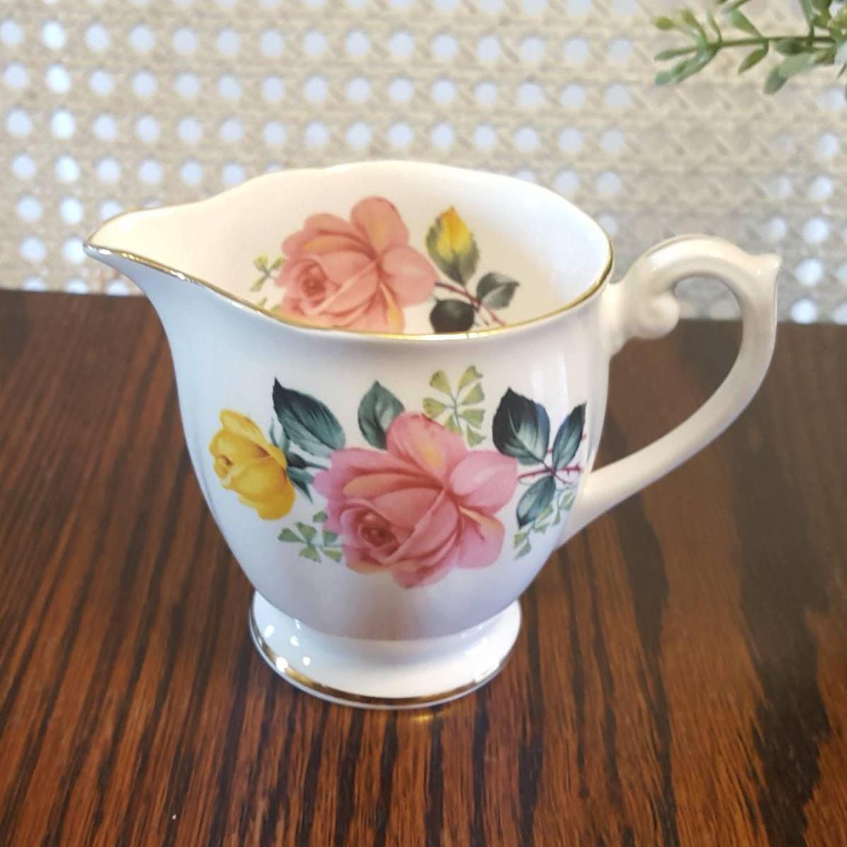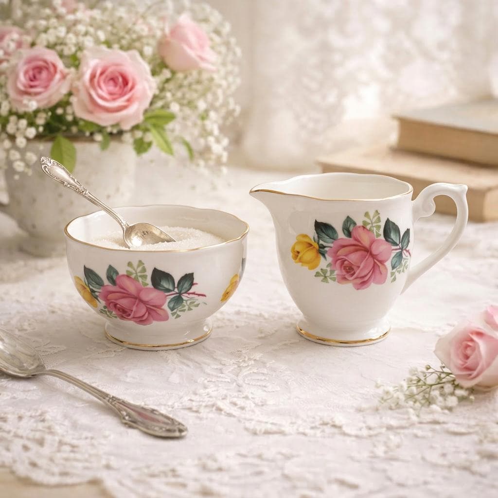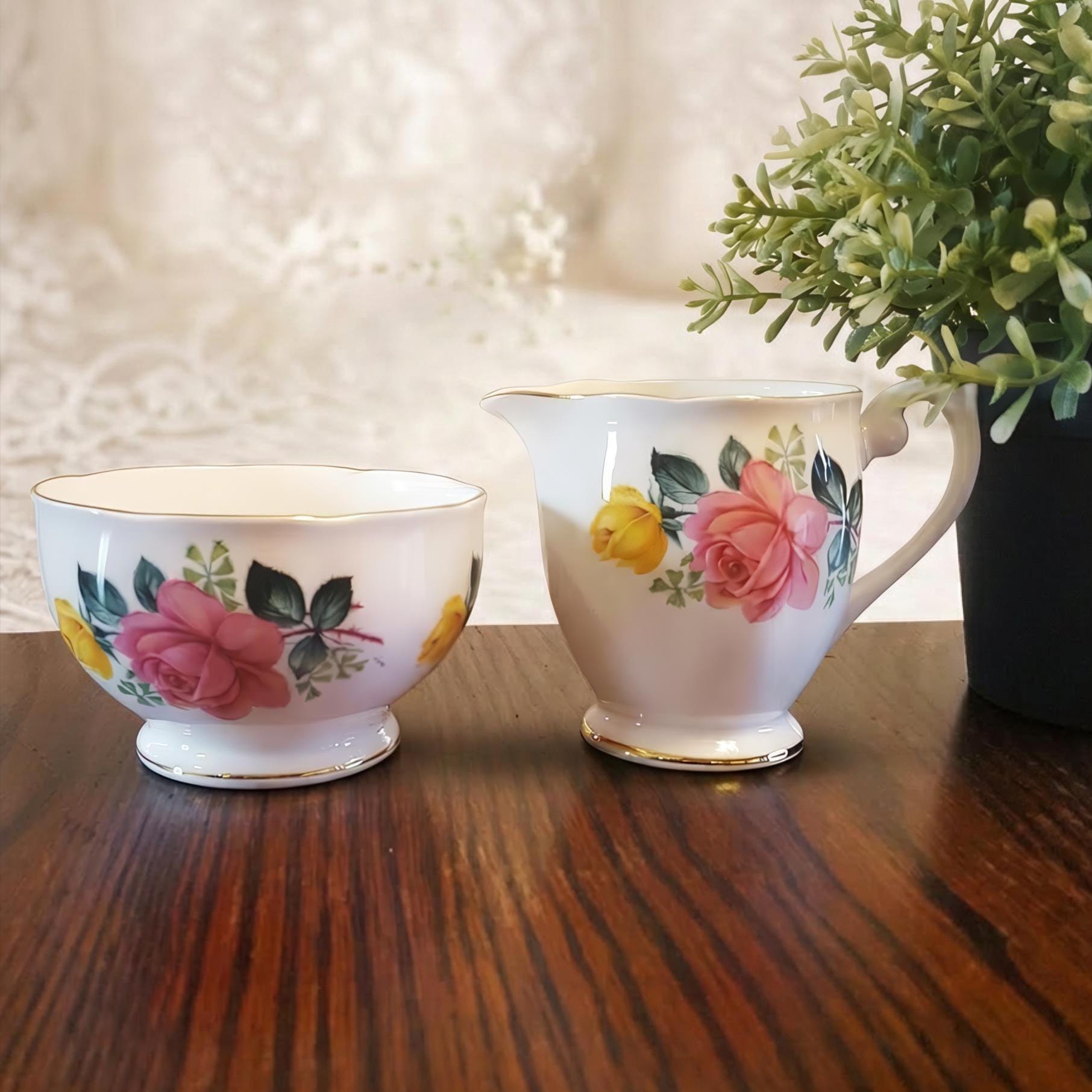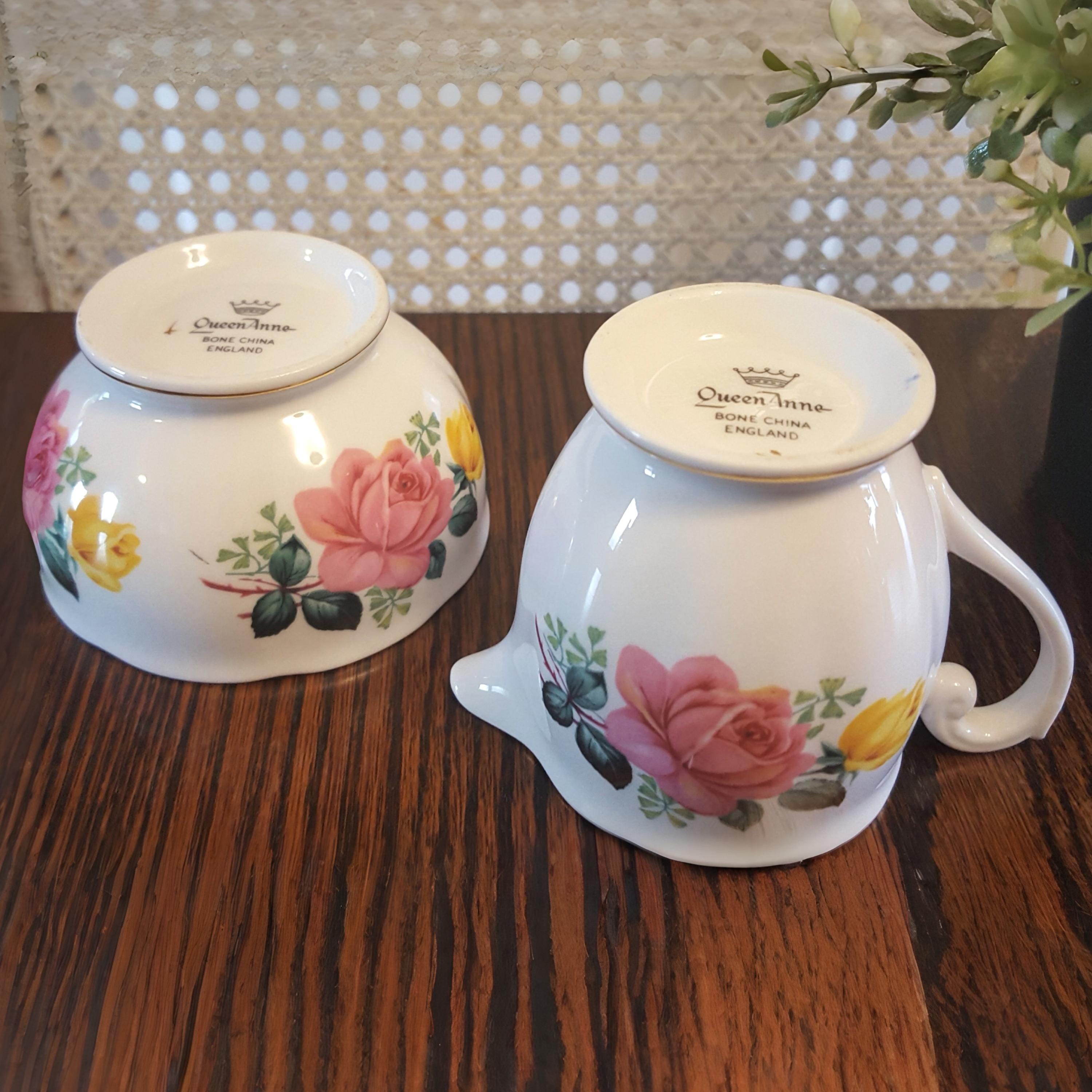A vintage Queen Anne fine bone china creamer and sugar bowl set, adorned with soft pink and yellow roses and finished with delicate gold trim. This charming duo serves beautifully with tea or coffee, and adds a gentle floral accent to breakfast trays, dessert service, or styled shelves in a cottage inspired space.