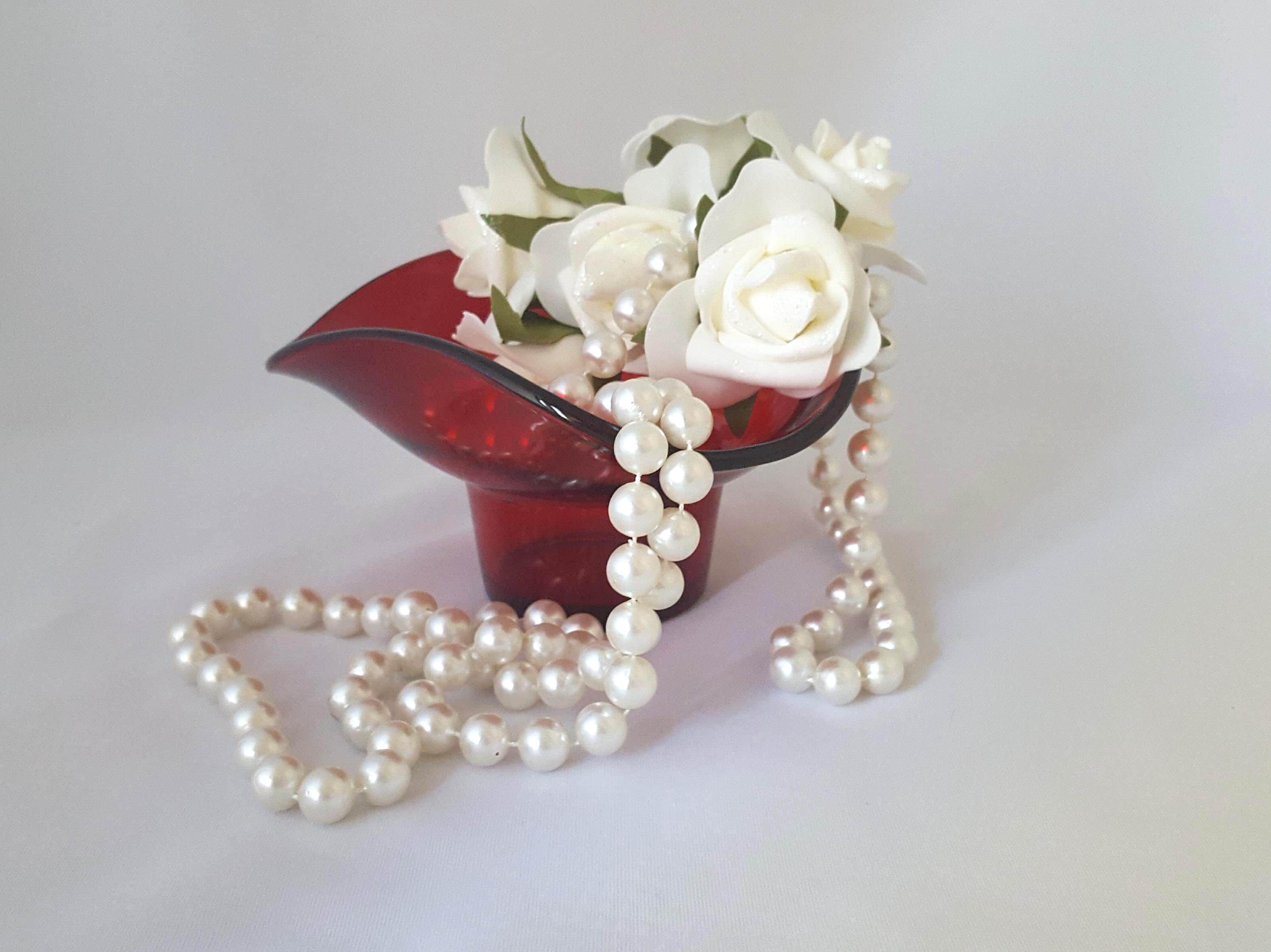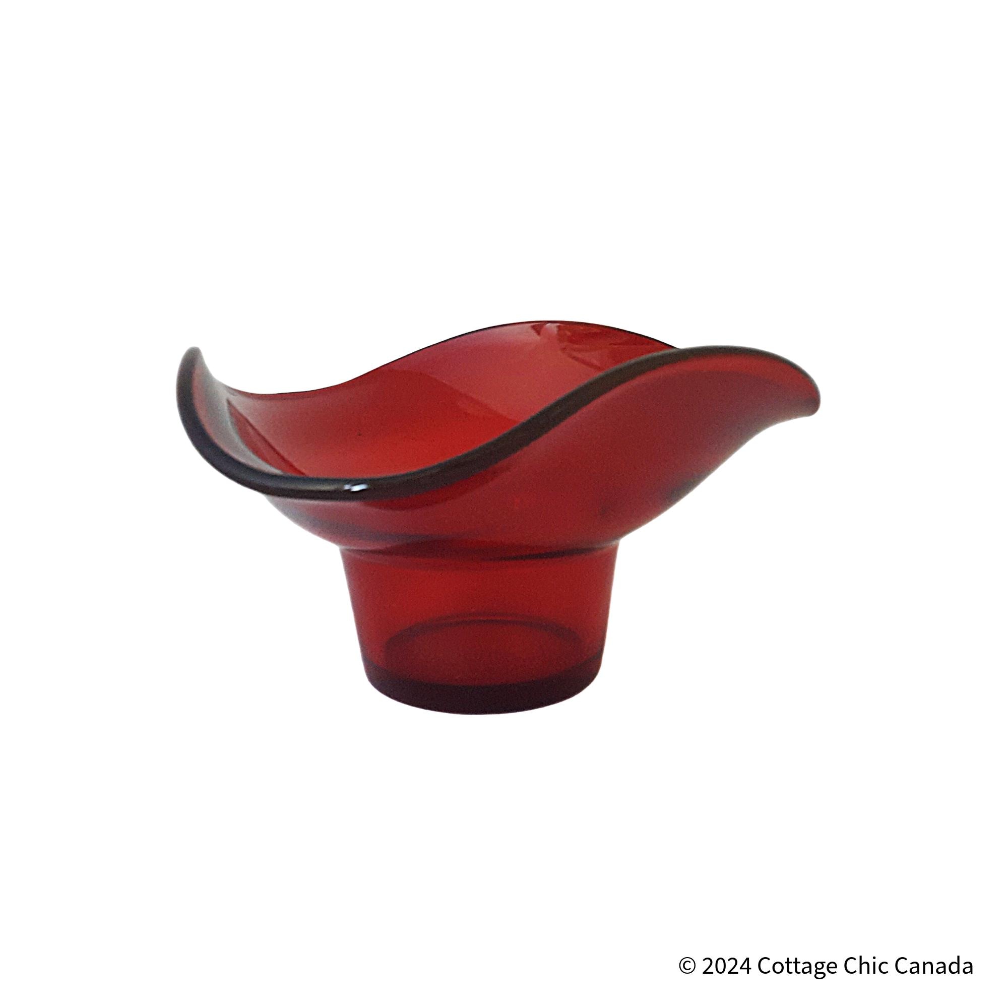 A striking ruby red pressed glass bowl with a freeform crimped rim, ideal as a candy dish, centerpiece, or accent for vintage-inspired holiday décor.