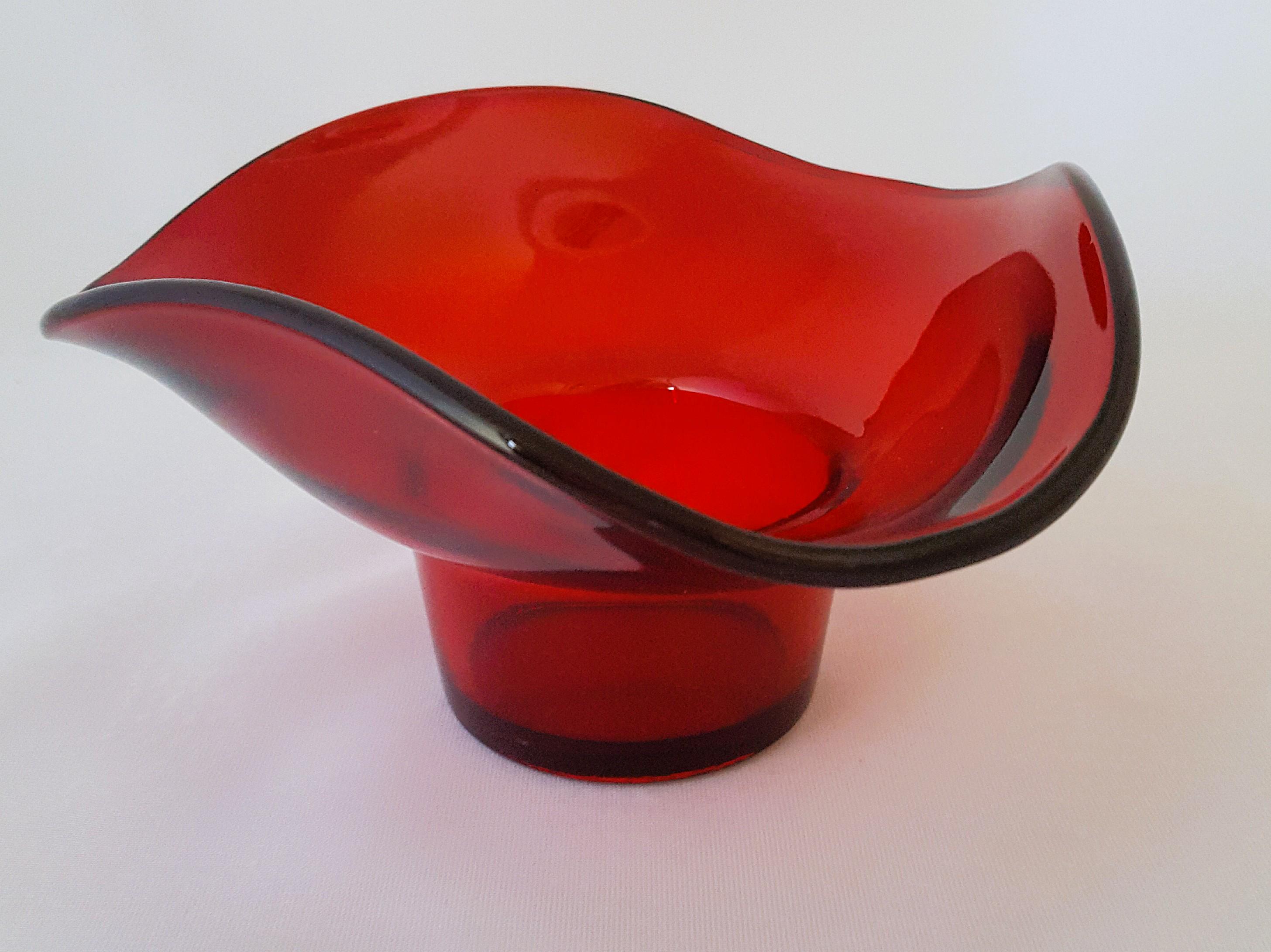 Sowerby Ruby Red Glass Bowl – Vintage Freeform Crimped Edge Dish, England
