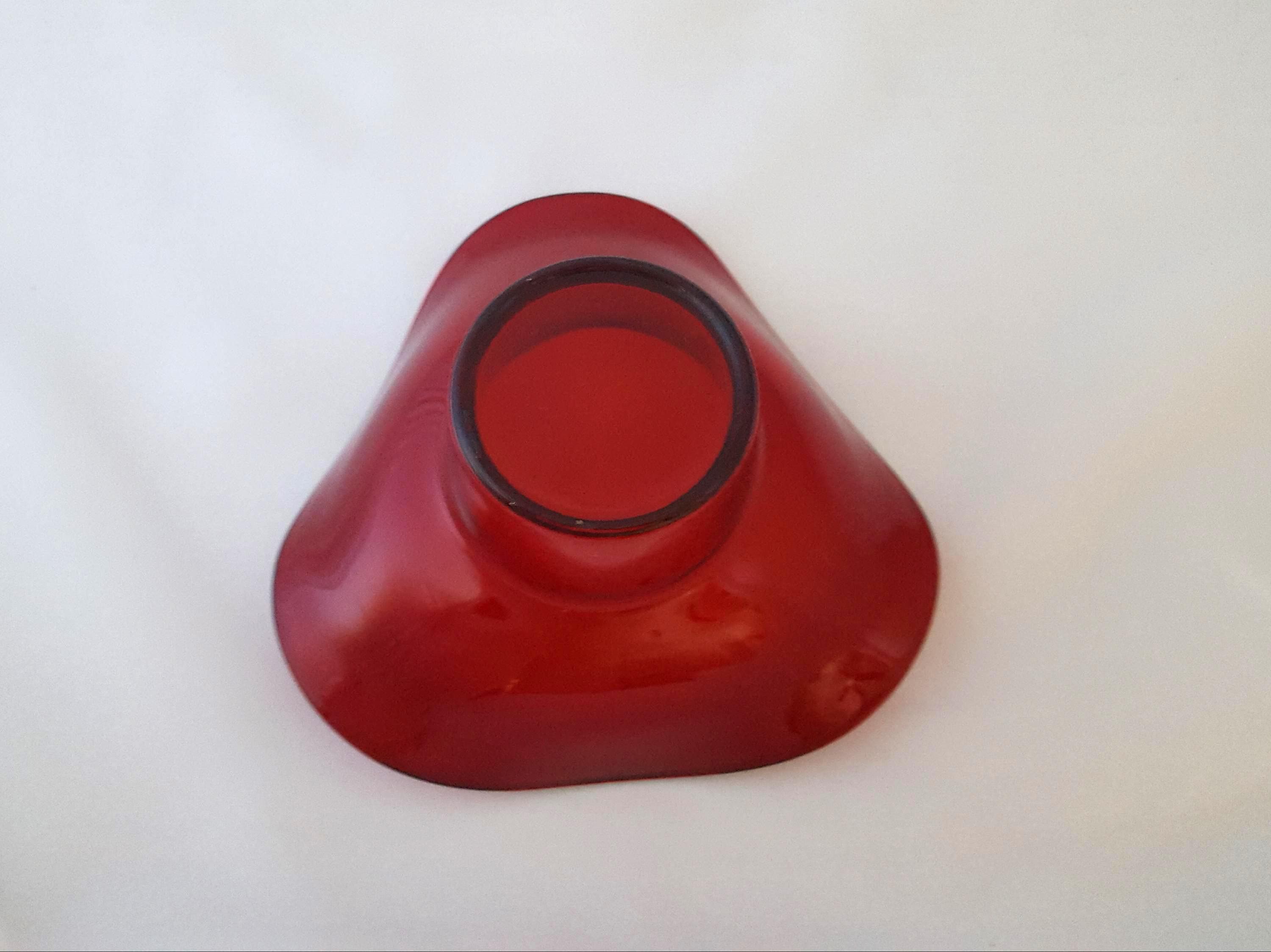 A sculptural red glass bowl attributed to Sowerby of England, known for its refined pressed glassware with fluid, organic silhouettes. This mid-century design features a gently flared rim that folds into curving waves, highlighting the vibrant transparency of ruby glass.