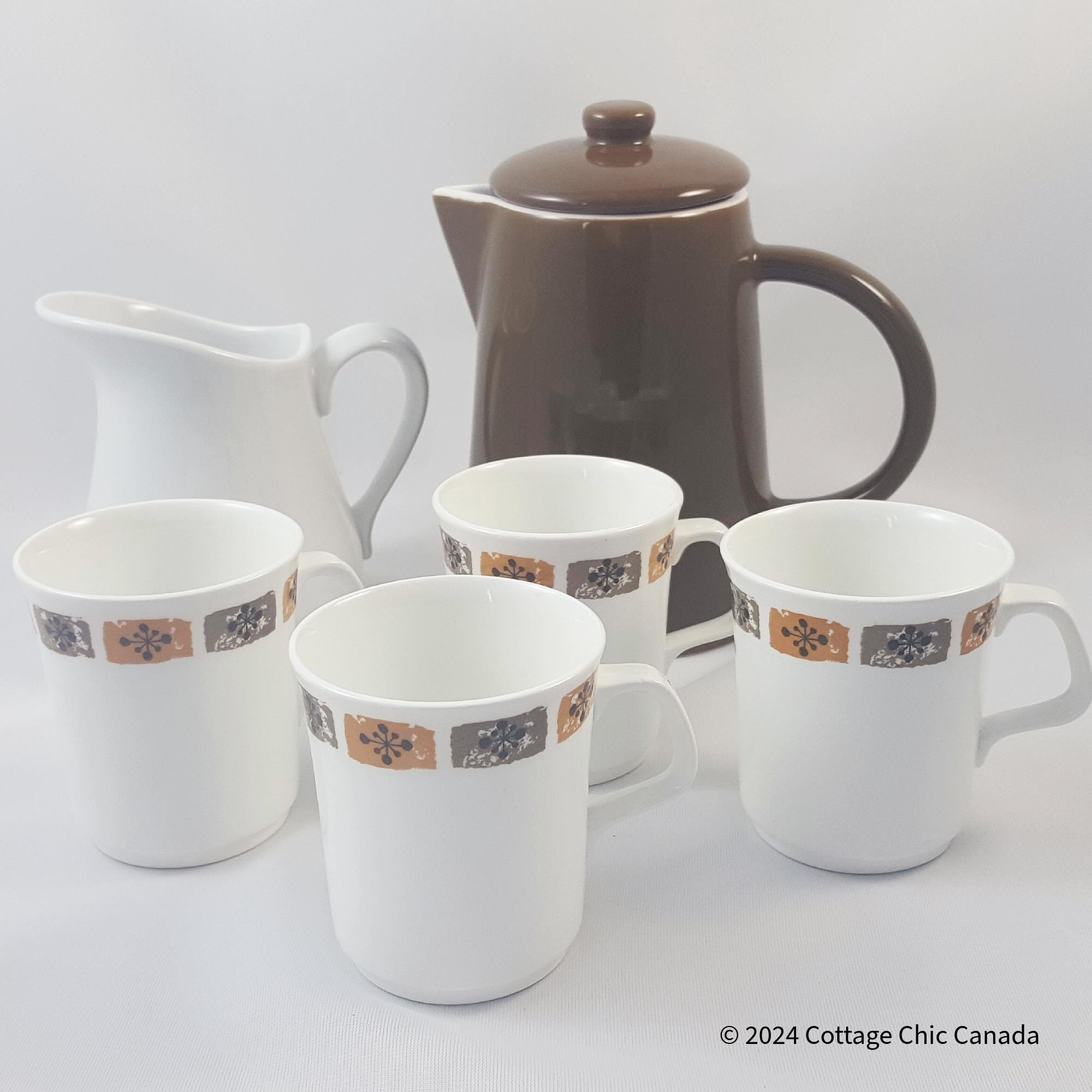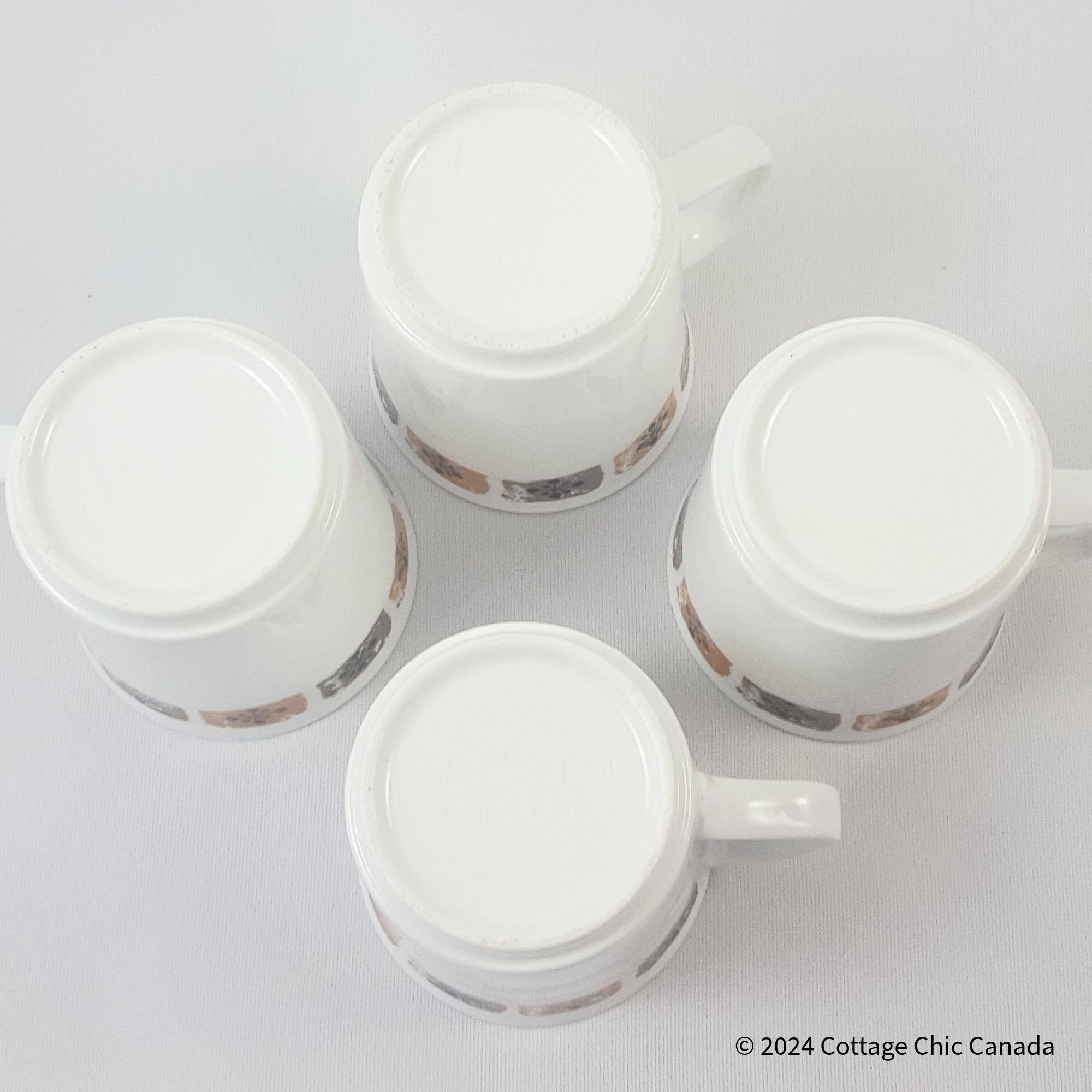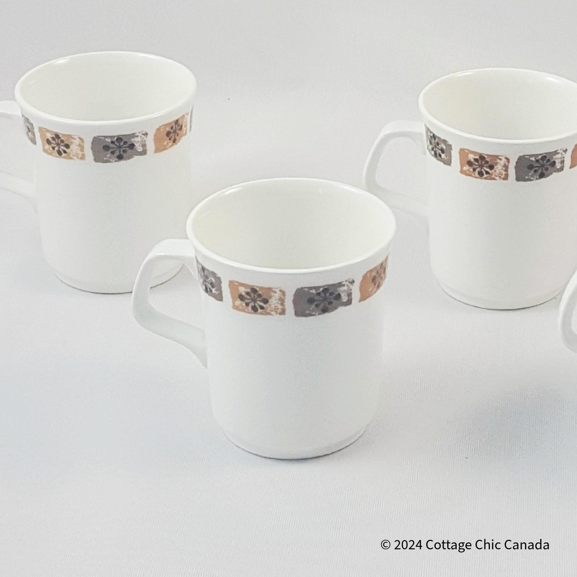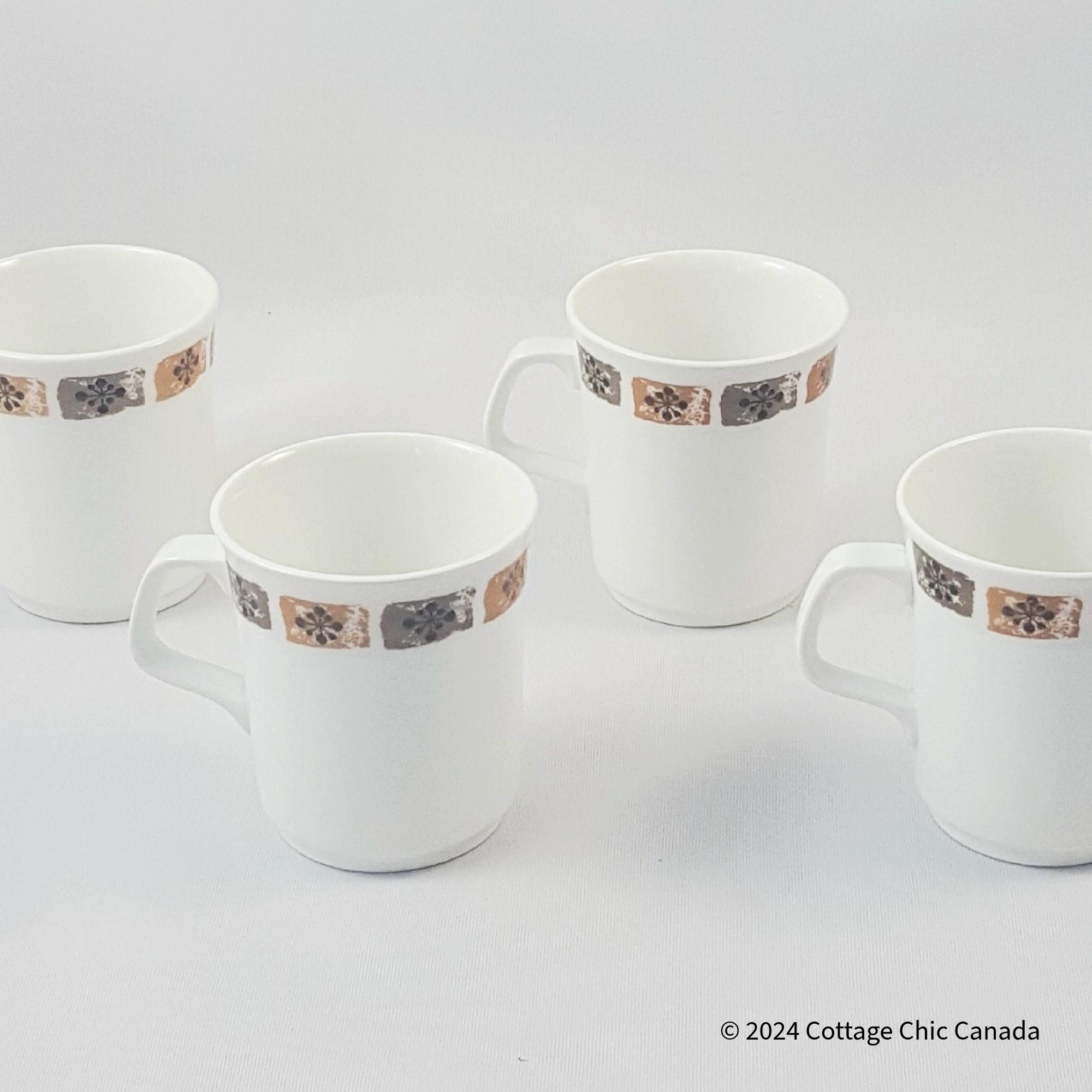 A delightful set of four vintage coffee mugs featuring an off-white glaze accented by a band of floral squares in muted brown and grey — a hallmark of 1960s British tableware design. The clean cylindrical form, flared rim, and angular handle reflect the mid-century transition toward simplicity and function. Their understated palette pairs beautifully with both retro and contemporary kitchens.