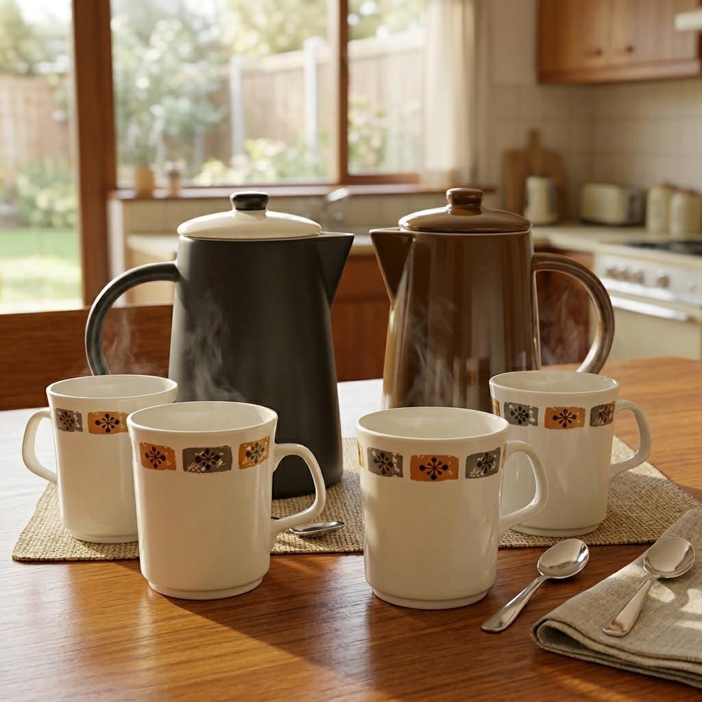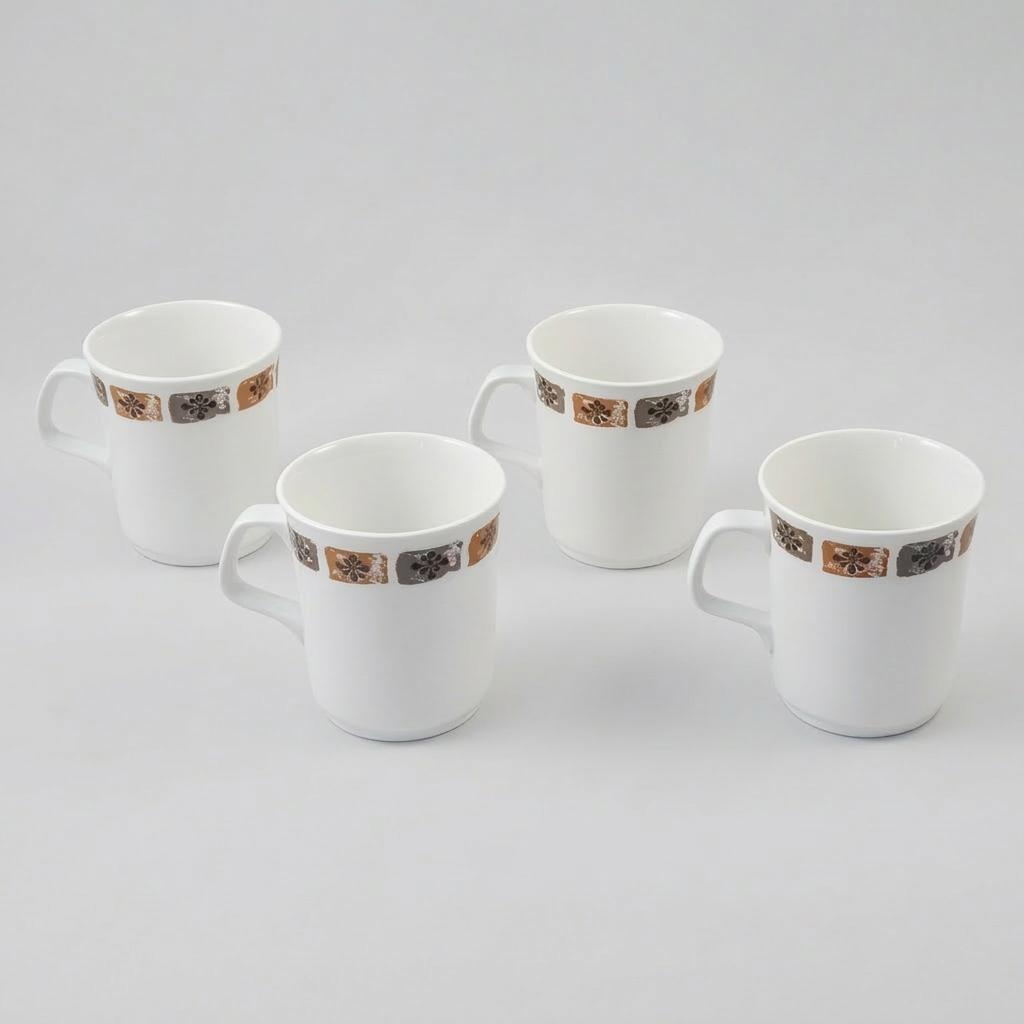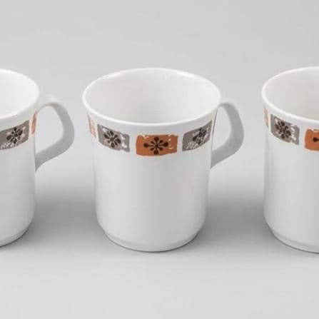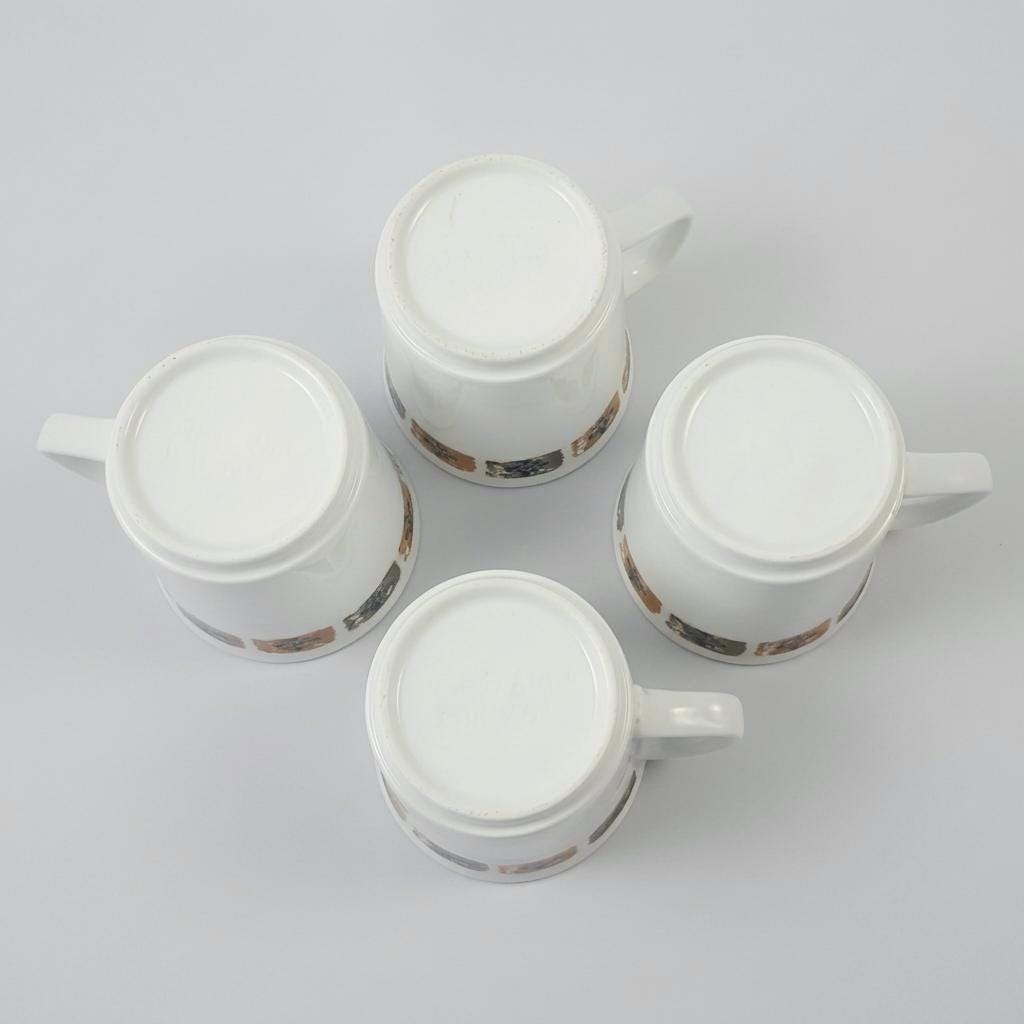 A delightful set of four vintage coffee mugs featuring an off white glaze accented by a band of floral squares in muted brown and grey, characteristic of 1960s–1970s British tableware design. The clean cylindrical form, flared rim, and angular handle reflect a shift toward simplicity and everyday function. Their understated palette pairs beautifully with both retro and contemporary kitchens.