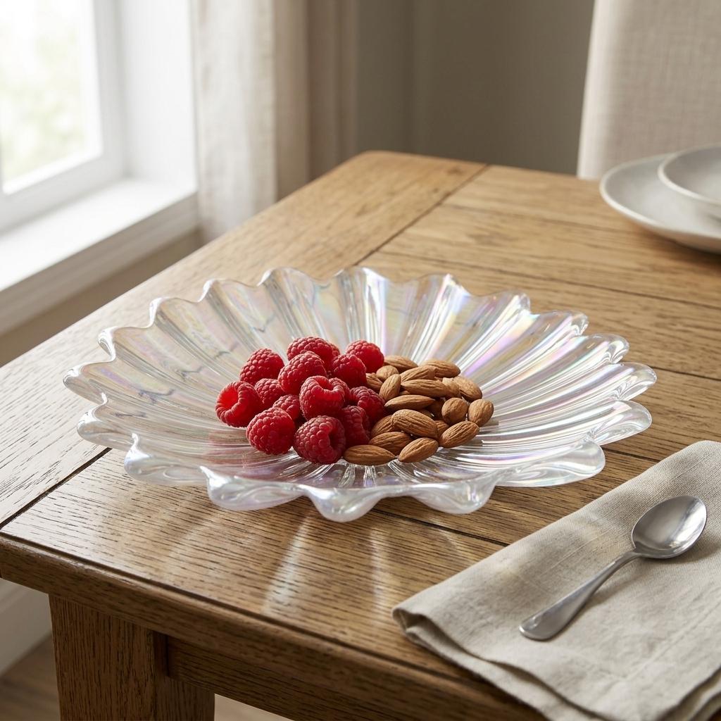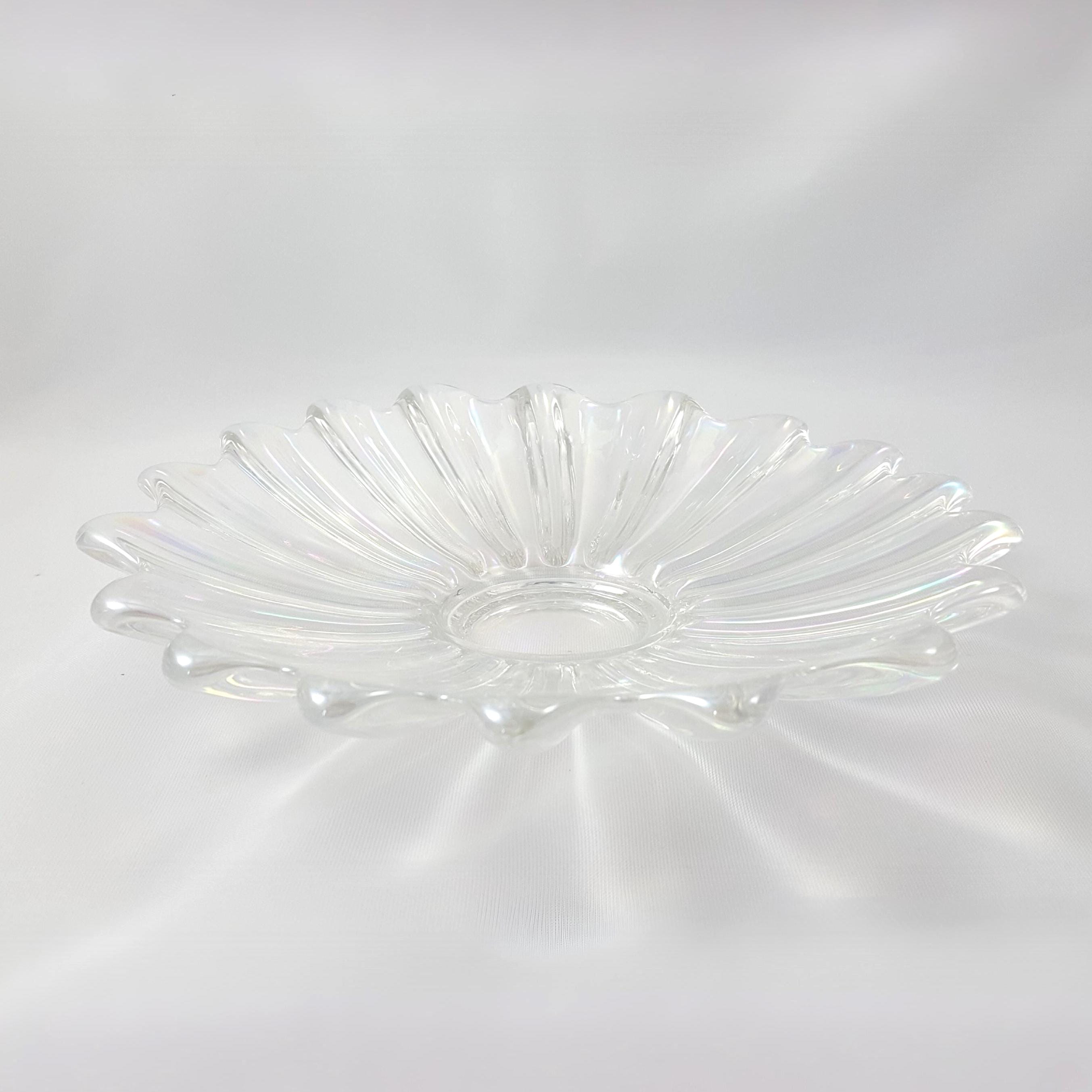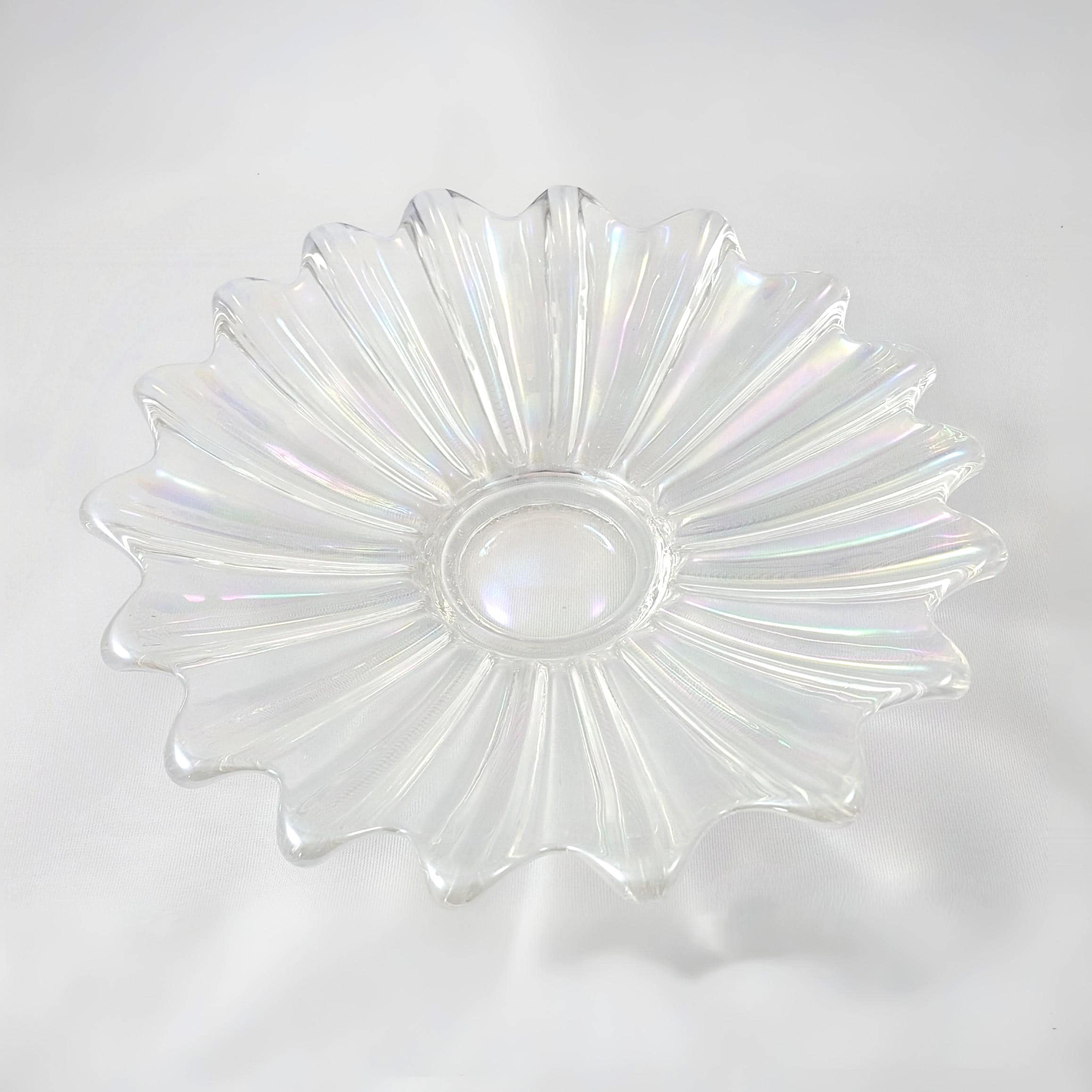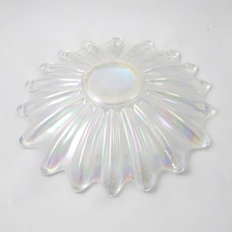 A vintage pressed glass dish by Federal Glass with a radiating petal design and domed center. Its iridescent finish catches the light in soft rainbow tones, creating a subtle celestial glow. Perfect for serving as a decorative centerpiece, candy tray, or elegant vanity bowl for small items and jewelry.