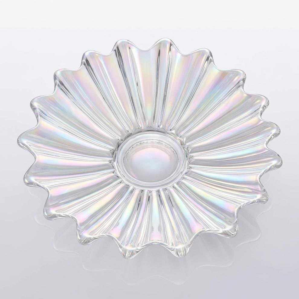 Federal’s iridescent glassware became popular in the 1950s–1960s for its combination of artistry and utility. The Celestial series exemplified the company’s commitment to refinement and quality, with this example representing the luminous clarity and sculptural detail that continue to appeal to collectors today.