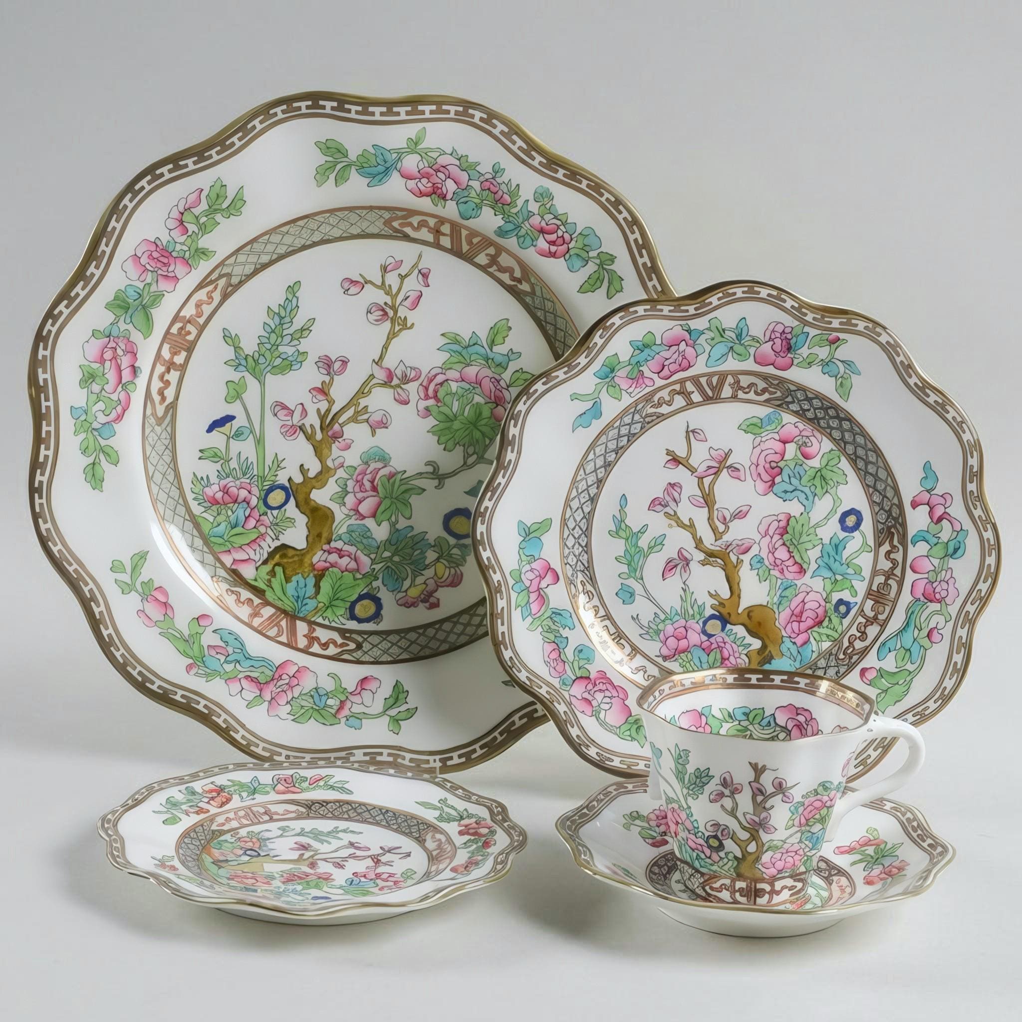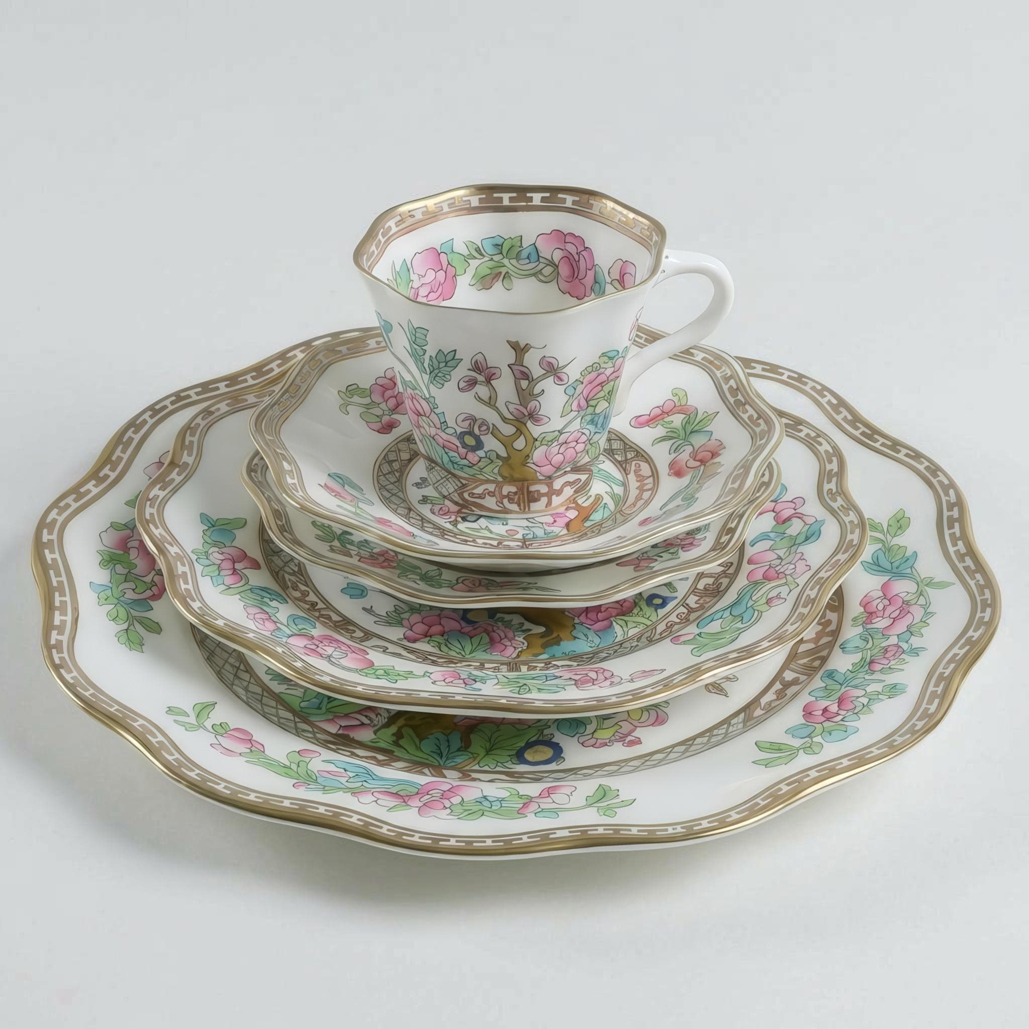 A beautiful five piece place setting in Coalport’s well loved Indian Tree Multicolor pattern, made from fine English bone china with hand painted florals and a soft gold Greek key border. The set includes a dinner plate, salad plate, bread and butter plate, teacup, and saucer, making it perfect for both everyday use and elegant, heritage inspired table settings.