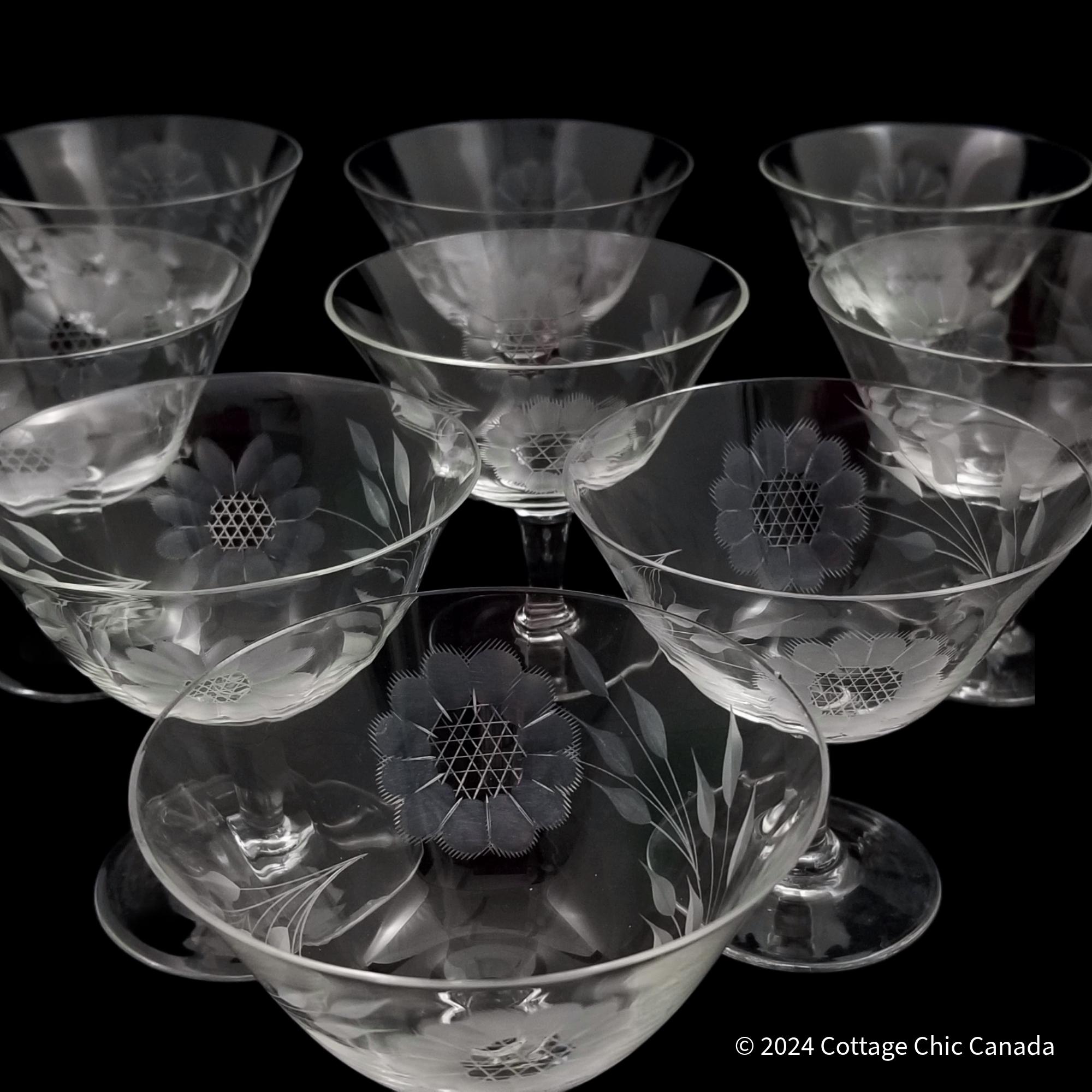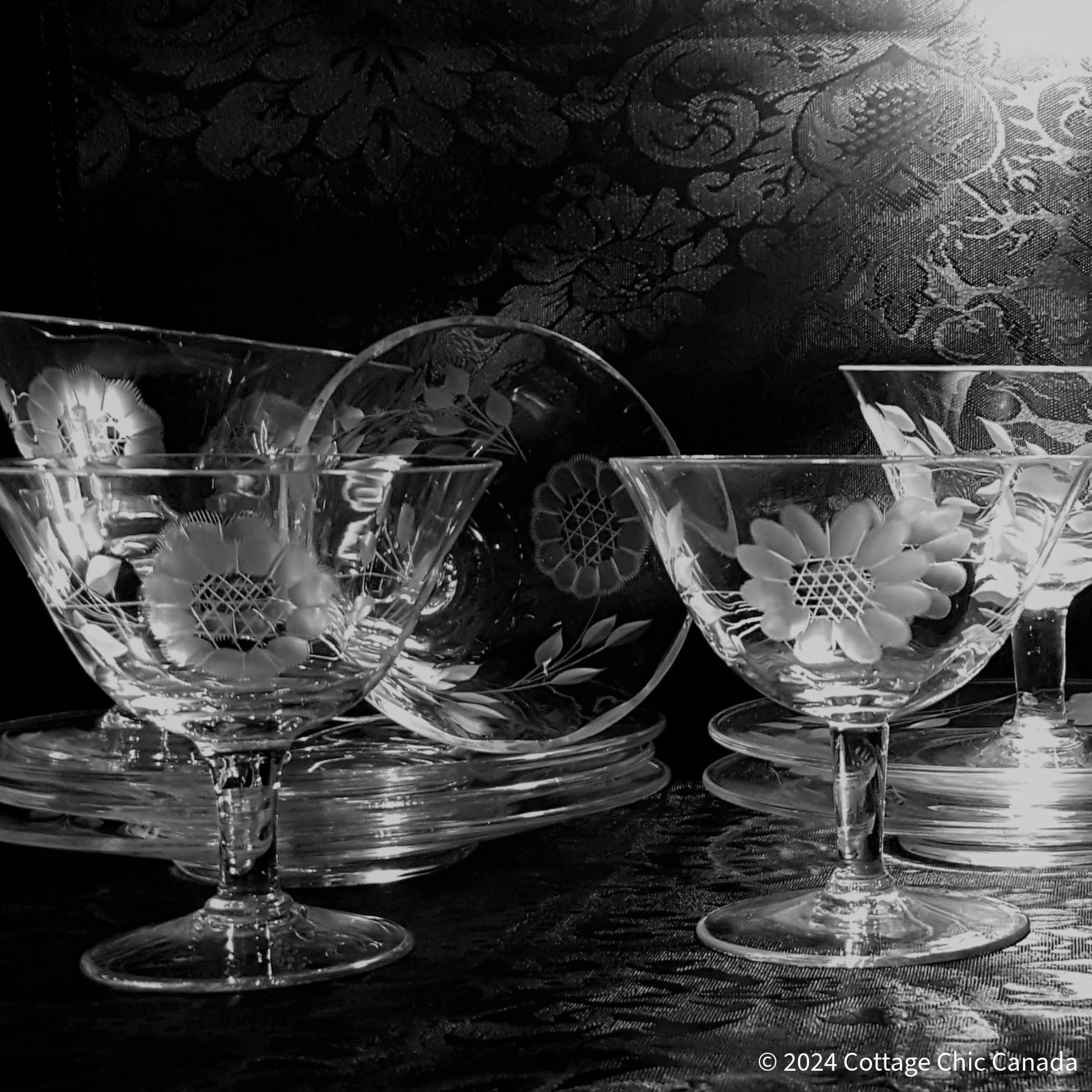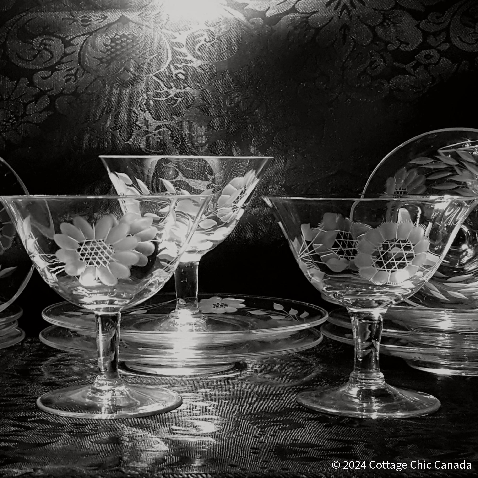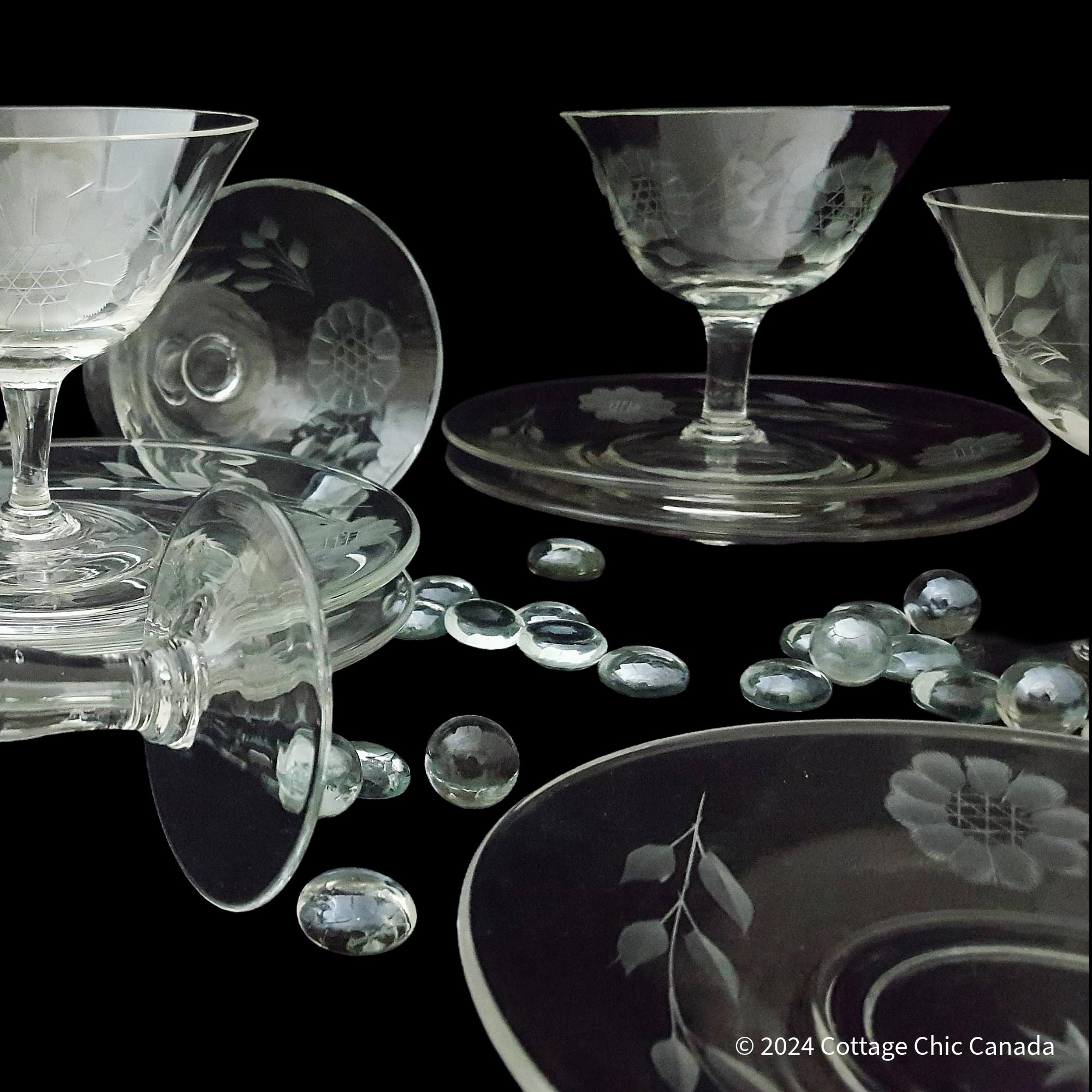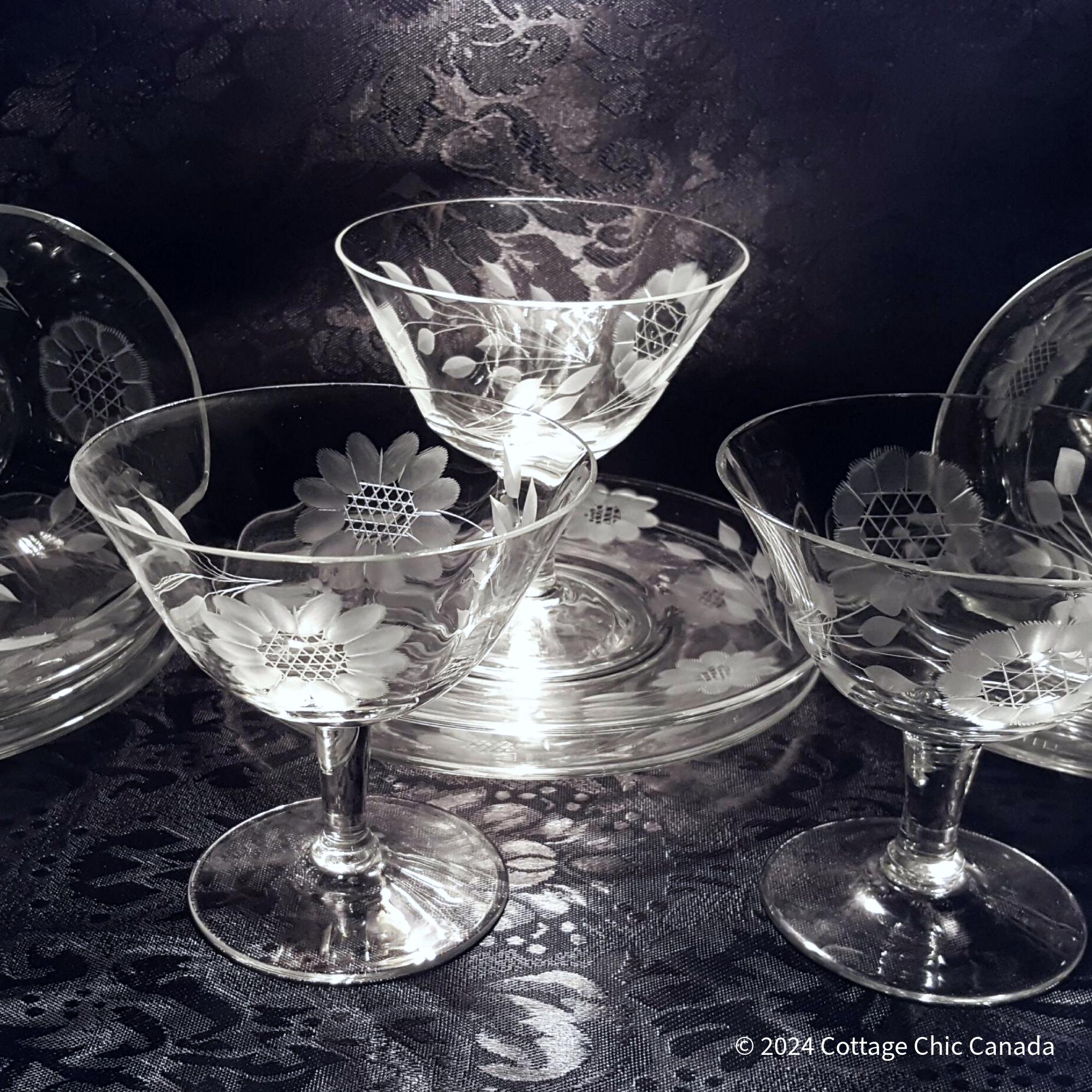 Hughes Cornflower Champagne Sherbet Glasses with Plates – Set of 8 Vintage Etched Crystal Canada