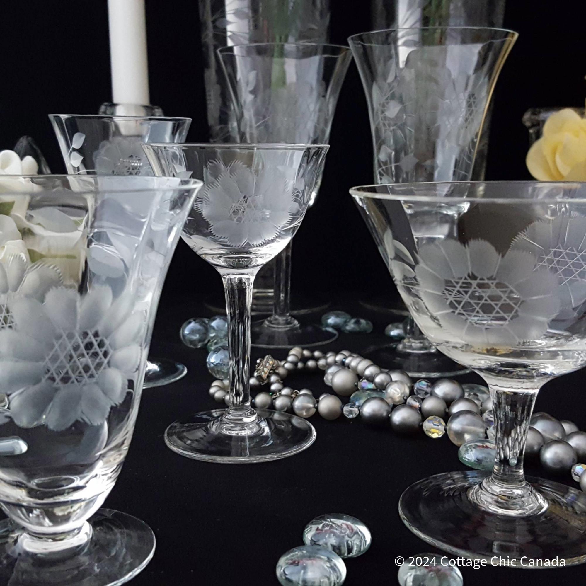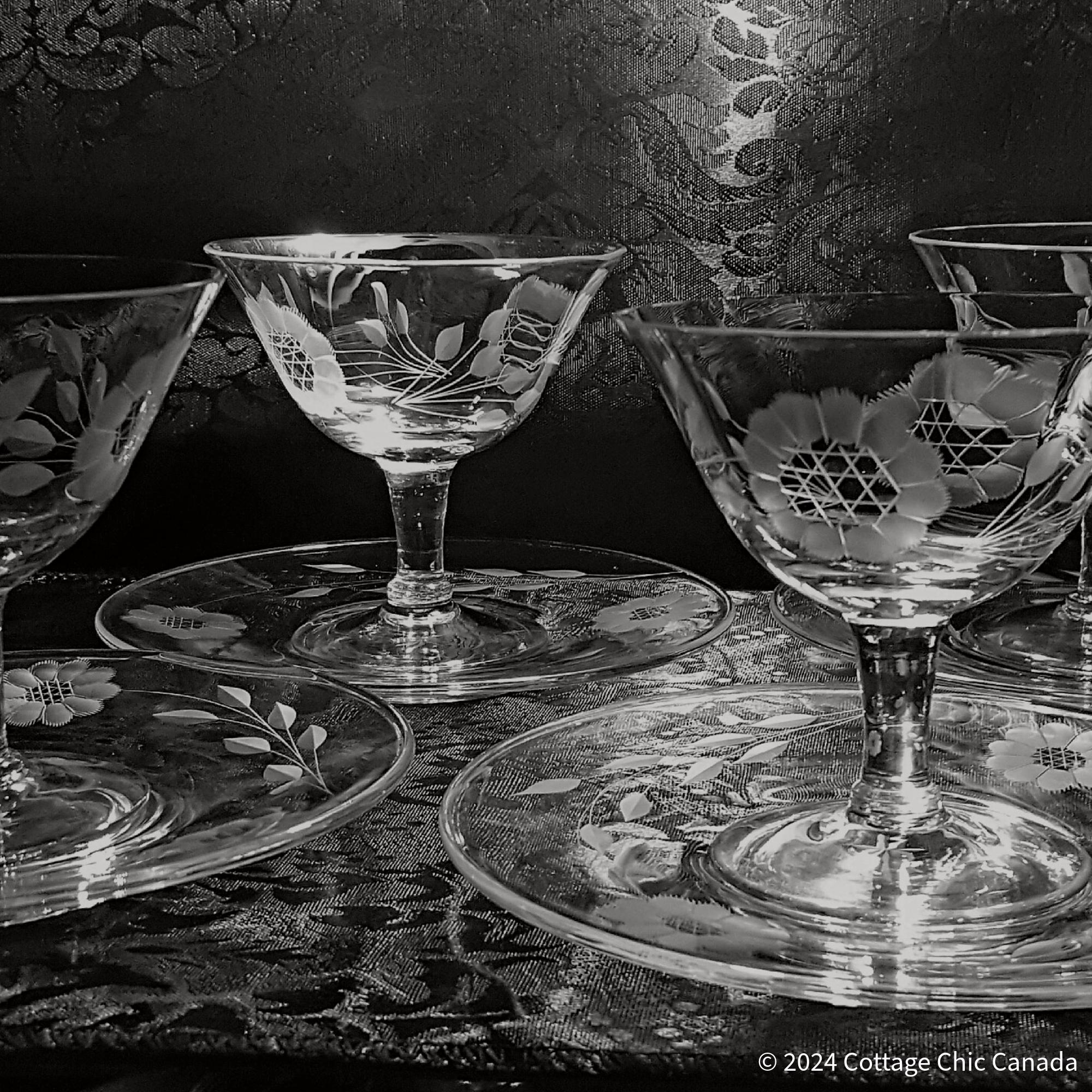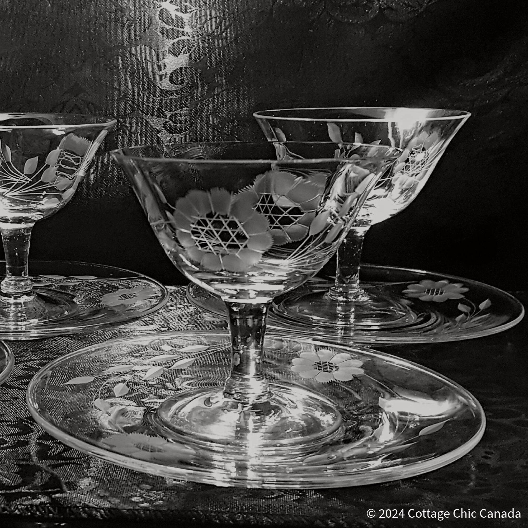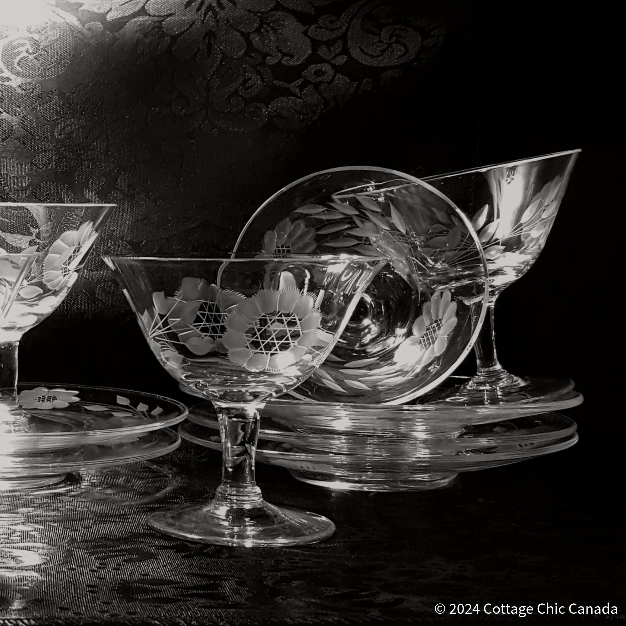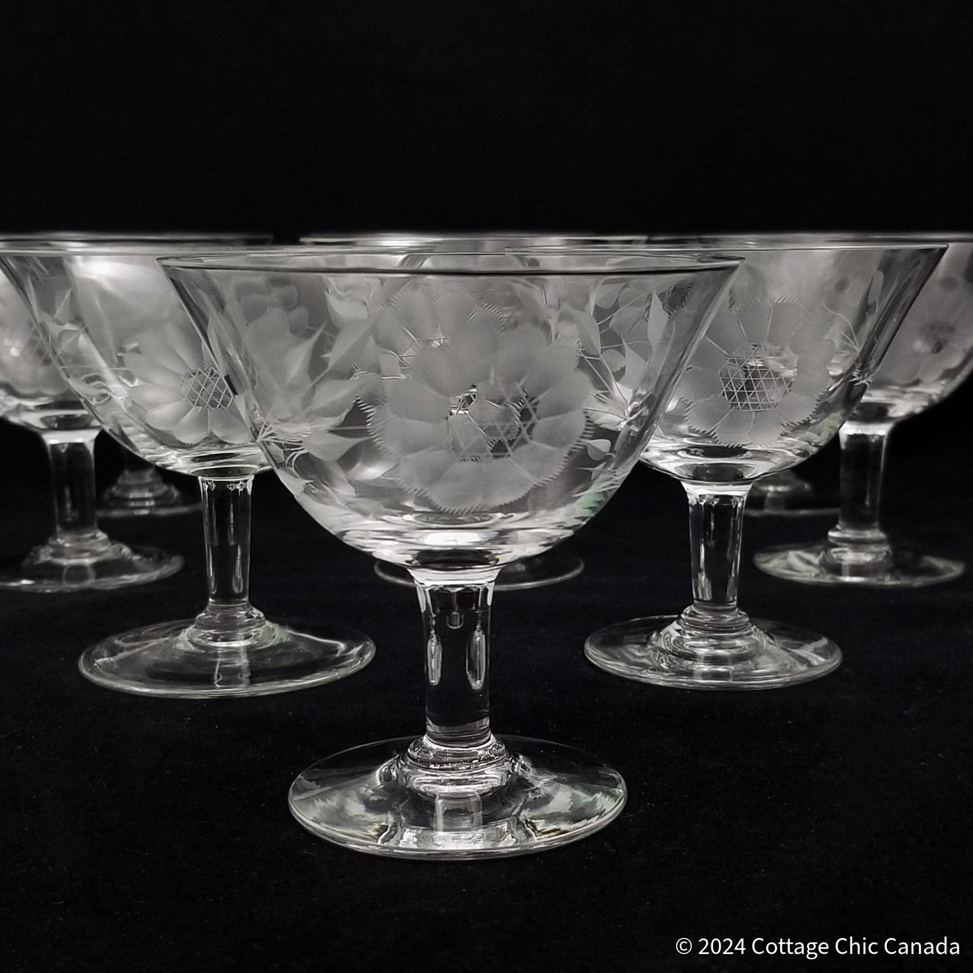 Hughes Cornflower Champagne Sherbet Glasses with Plates – Set of 8 Vintage Etched Crystal Canada