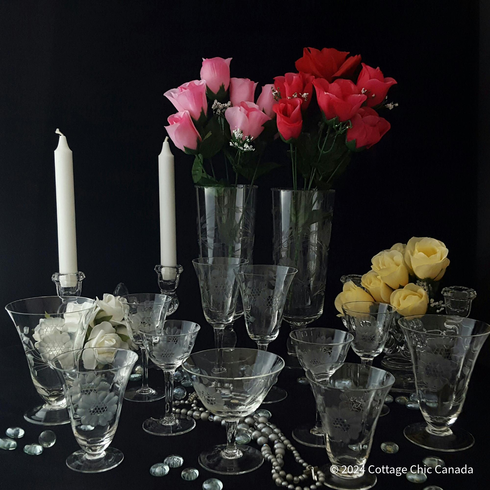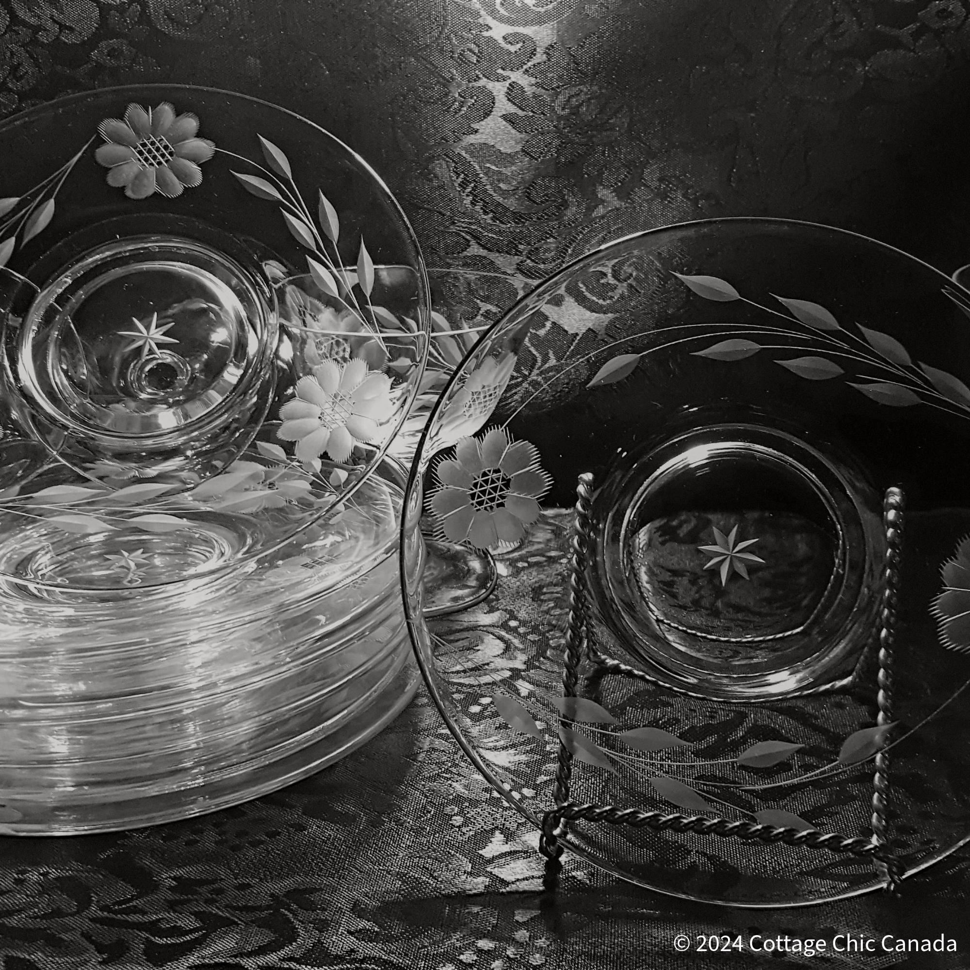 Hand-etched on clear Imperial blanks with radiant optic bowls and coordinating round plates, this set is adorned with the distinctive early Cornflower motif—twin blossoms framed by extended leaf sprays.