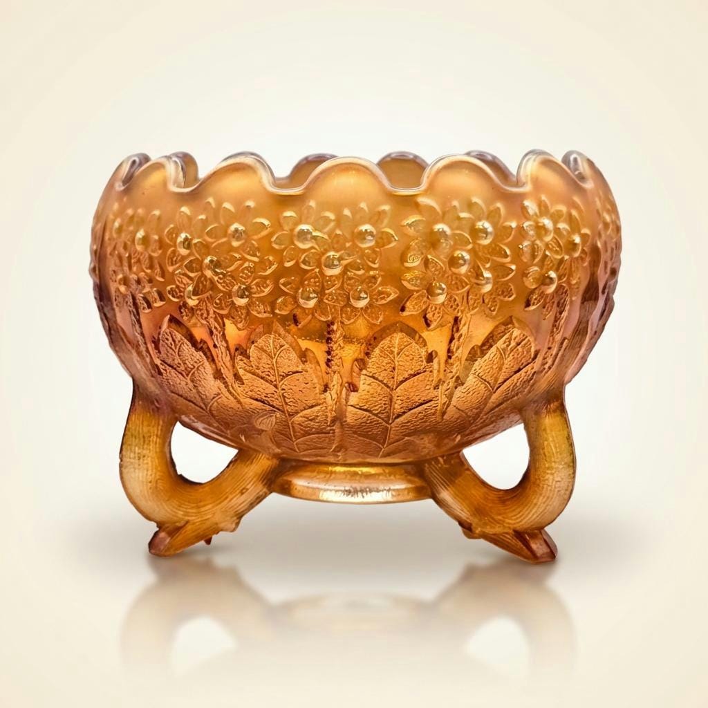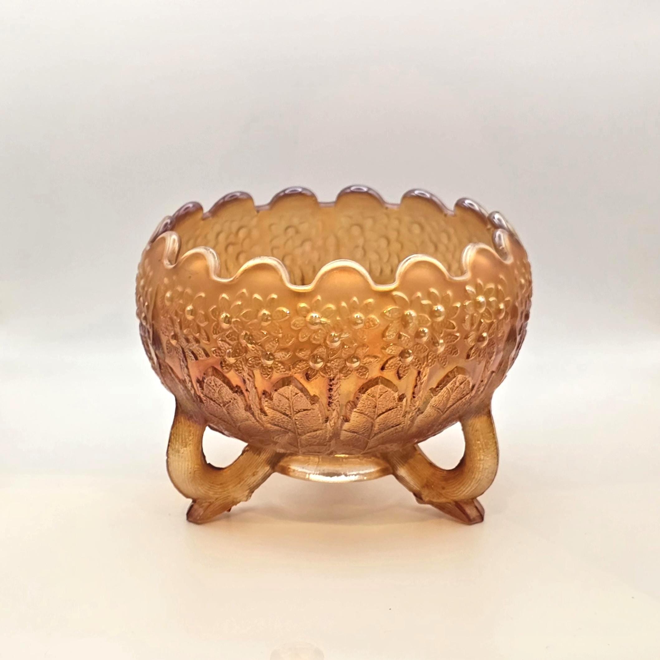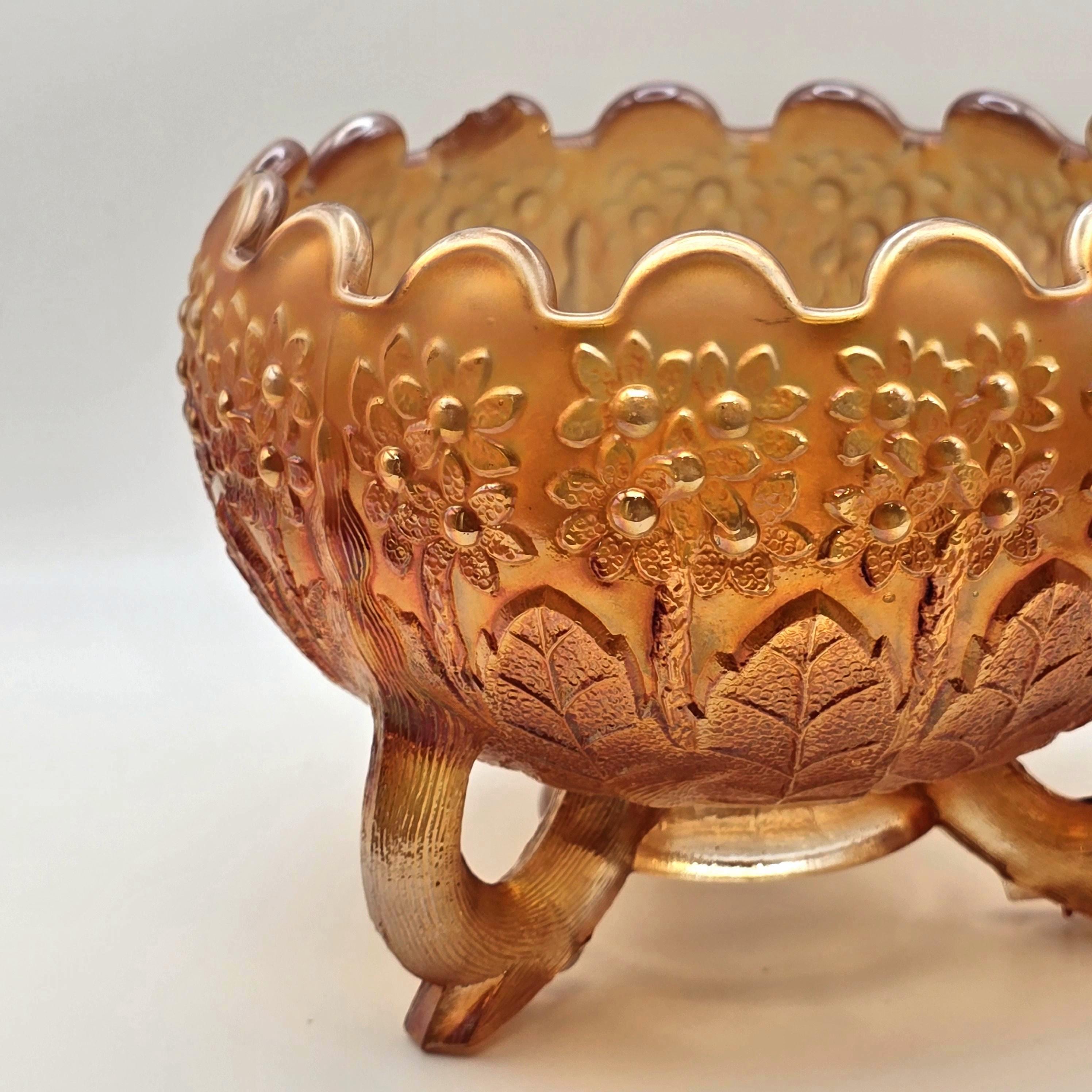 An antique Fenton marigold carnival glass bowl in the sought after Orange Tree pattern, featuring raised blossoms, fruit laden branches, and textured foliage. Three twig form feet support the rounded body, finished with a gently ruffled scalloped rim and warm iridescent glow.