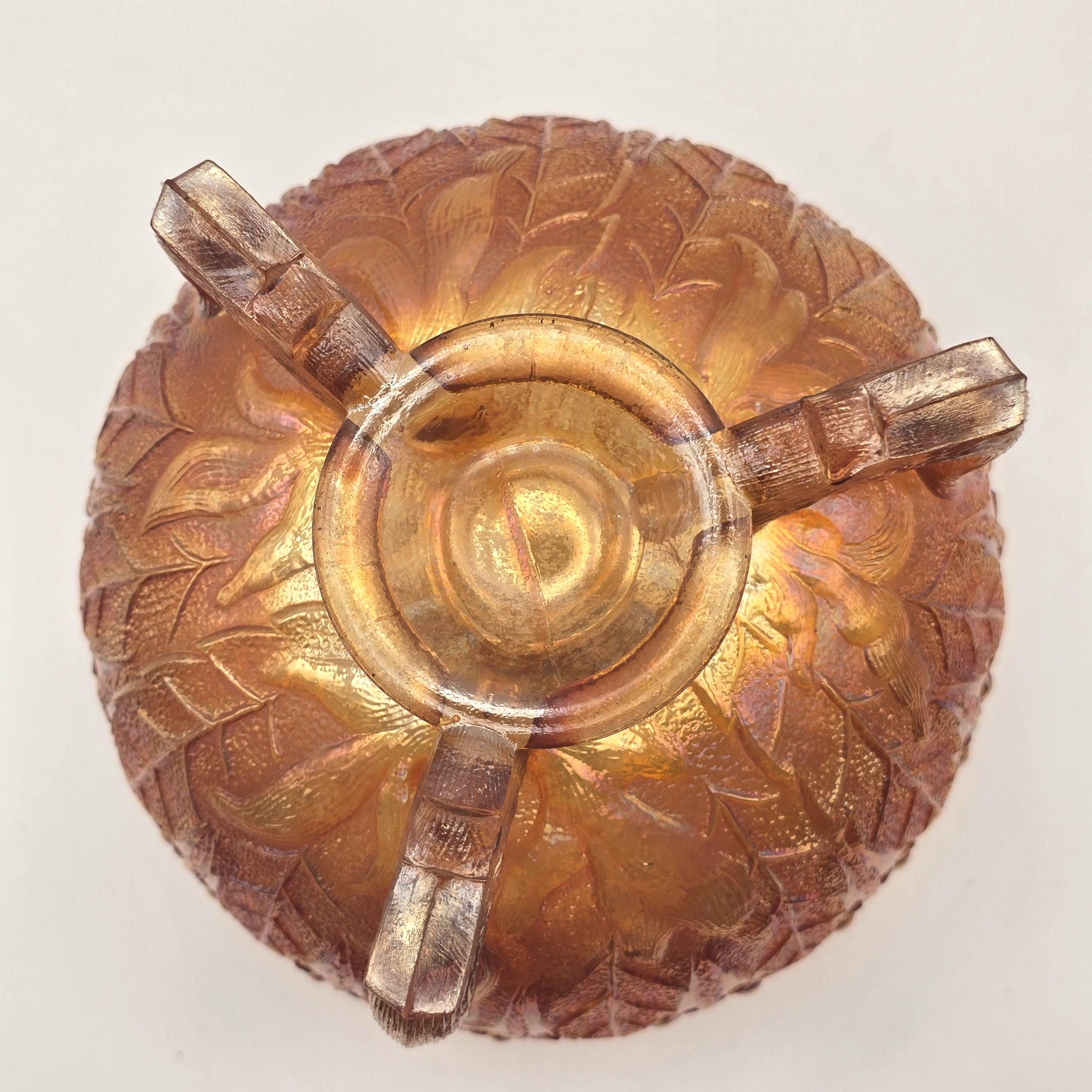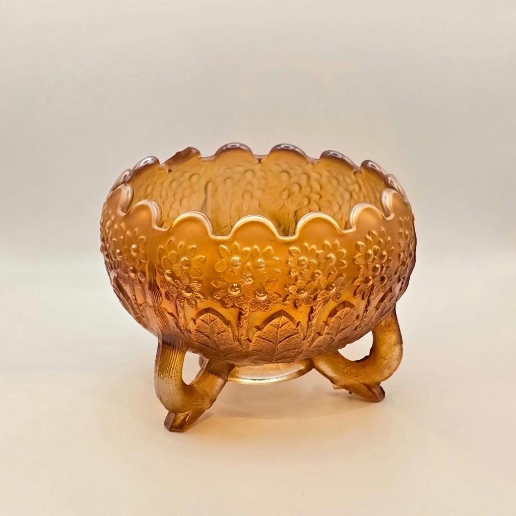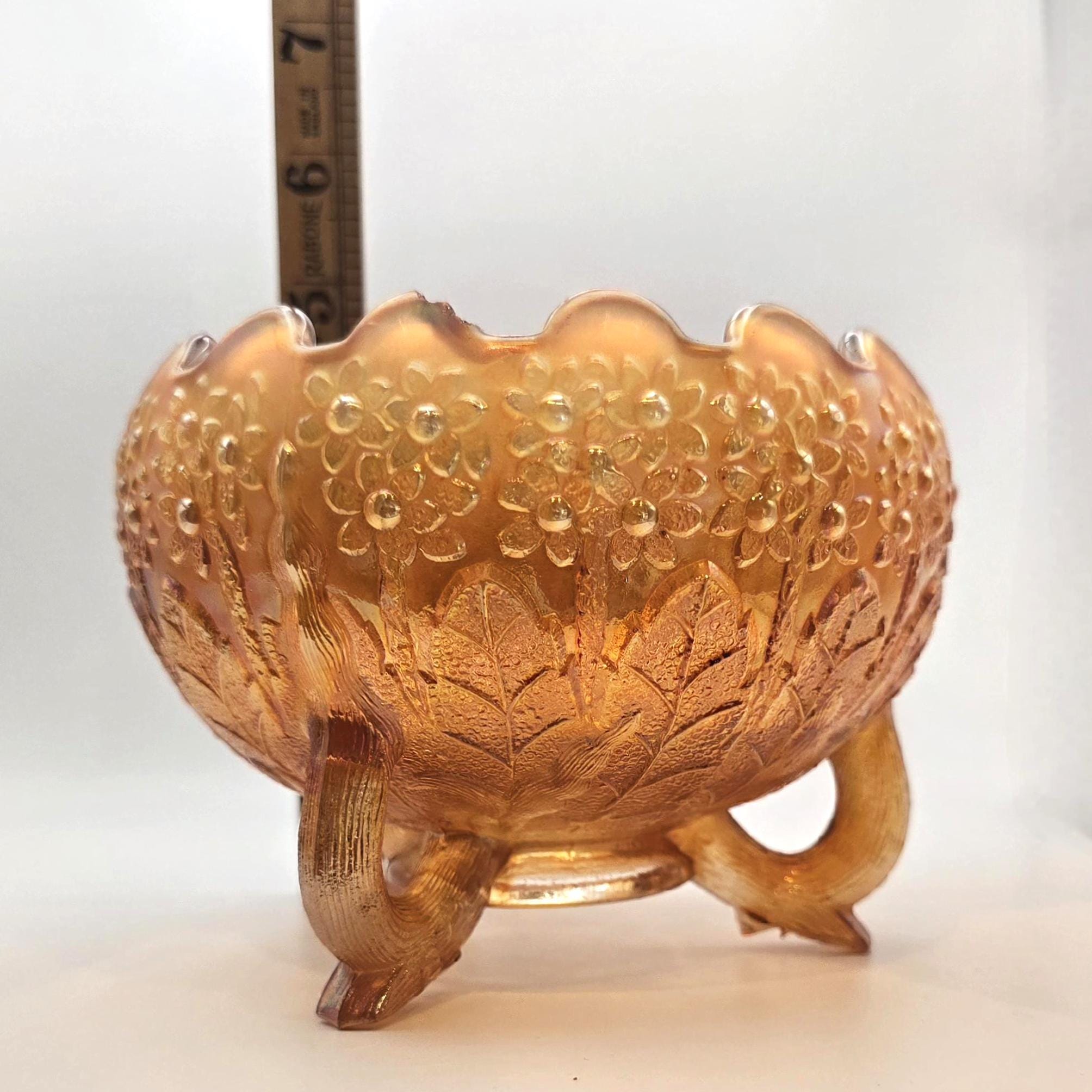 An antique Fenton marigold carnival glass bowl in the sought after Orange Tree pattern, featuring raised blossoms, fruit laden branches, and textured foliage. Three twig form feet support the rounded body, finished with a gently ruffled scalloped rim and warm iridescent glow.
